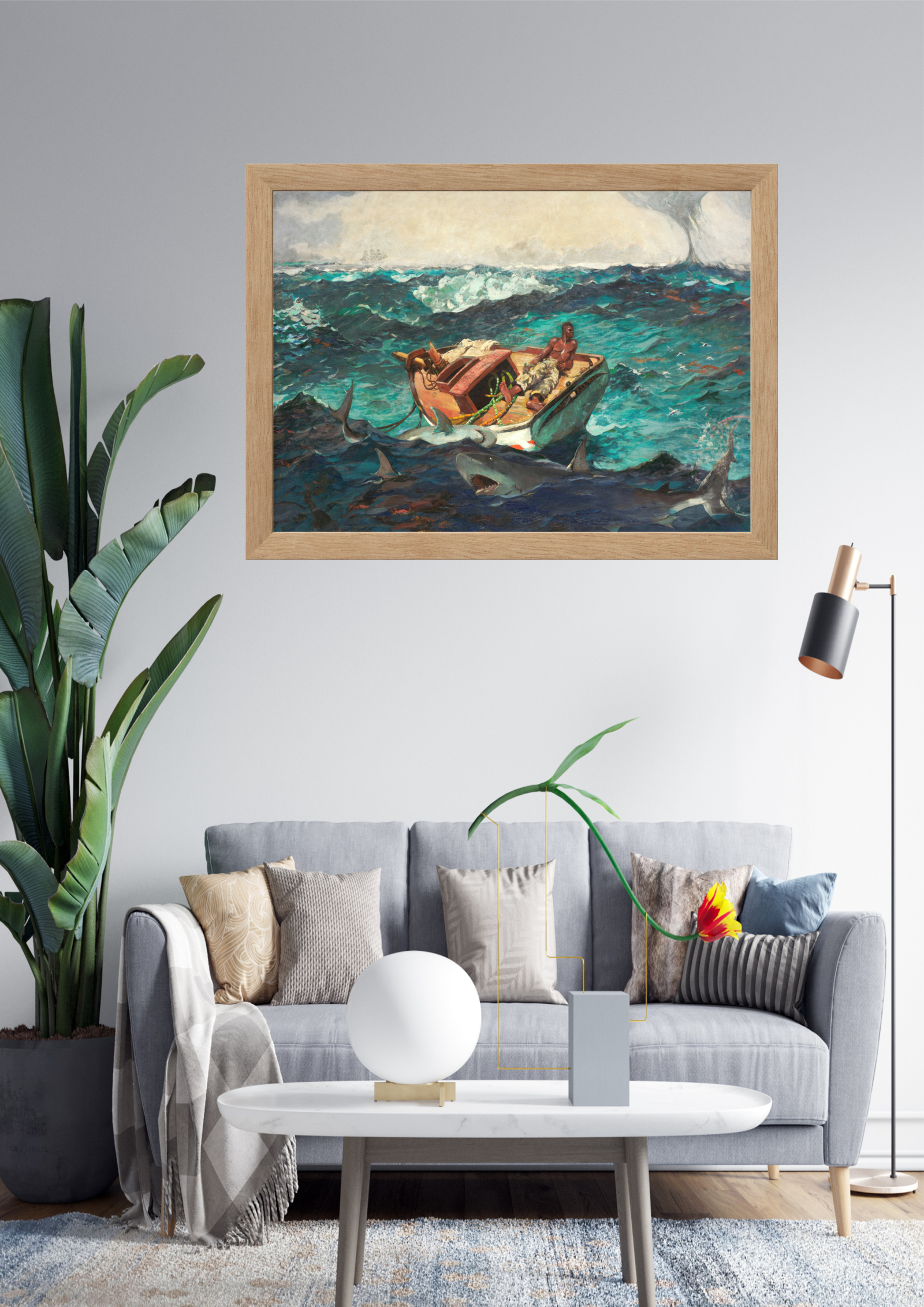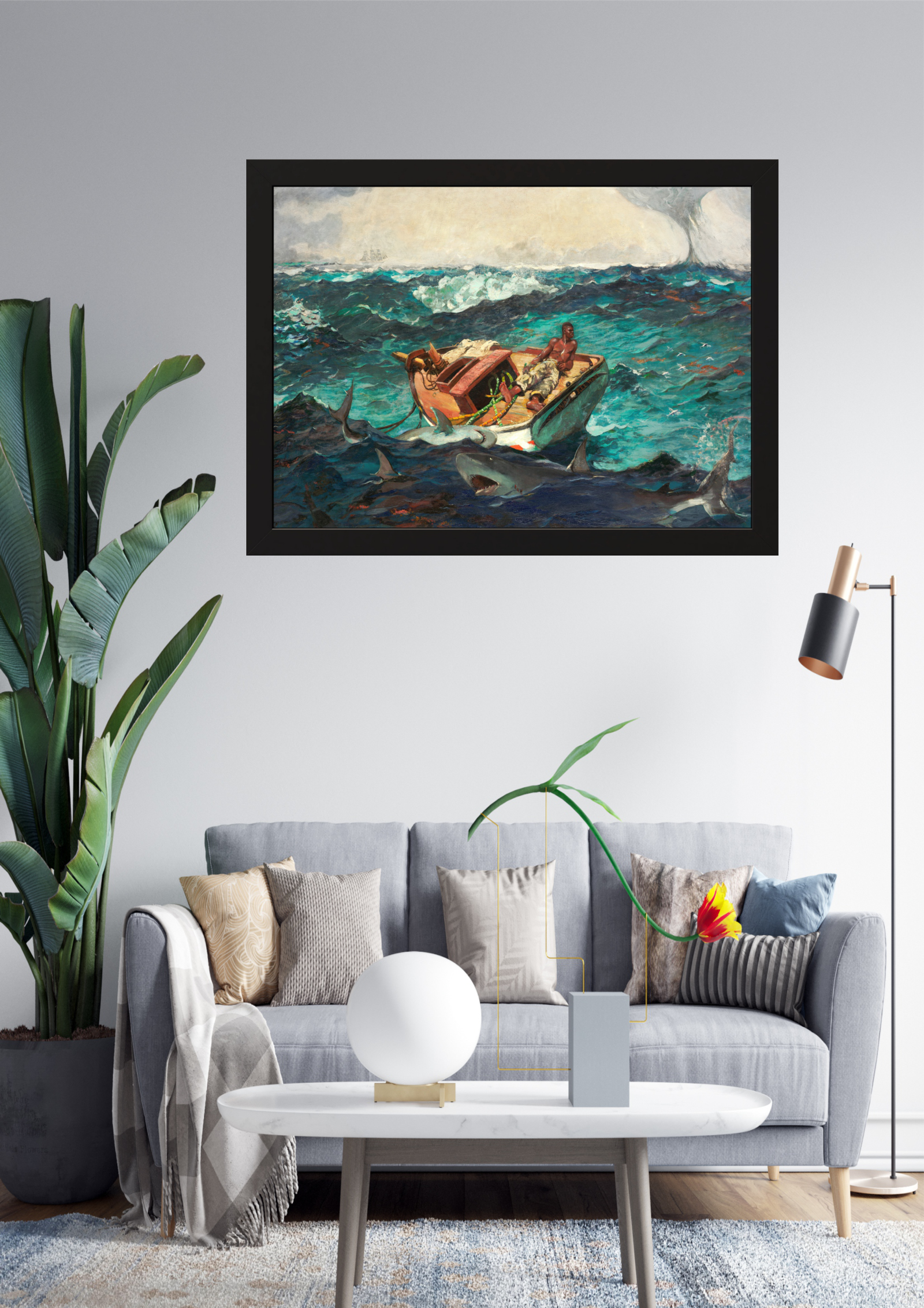 A imagem retrata uma cena dramática de sobrevivência no mar, onde um pequeno barco enfrenta a fúria das ondas e a ameaça de tubarões. A pintura, rica em detalhes, captura a tensão e o desespero dos ocupantes do barco, enquanto o céu nublado e o mar revolto intensificam a sensação de perigo iminente.