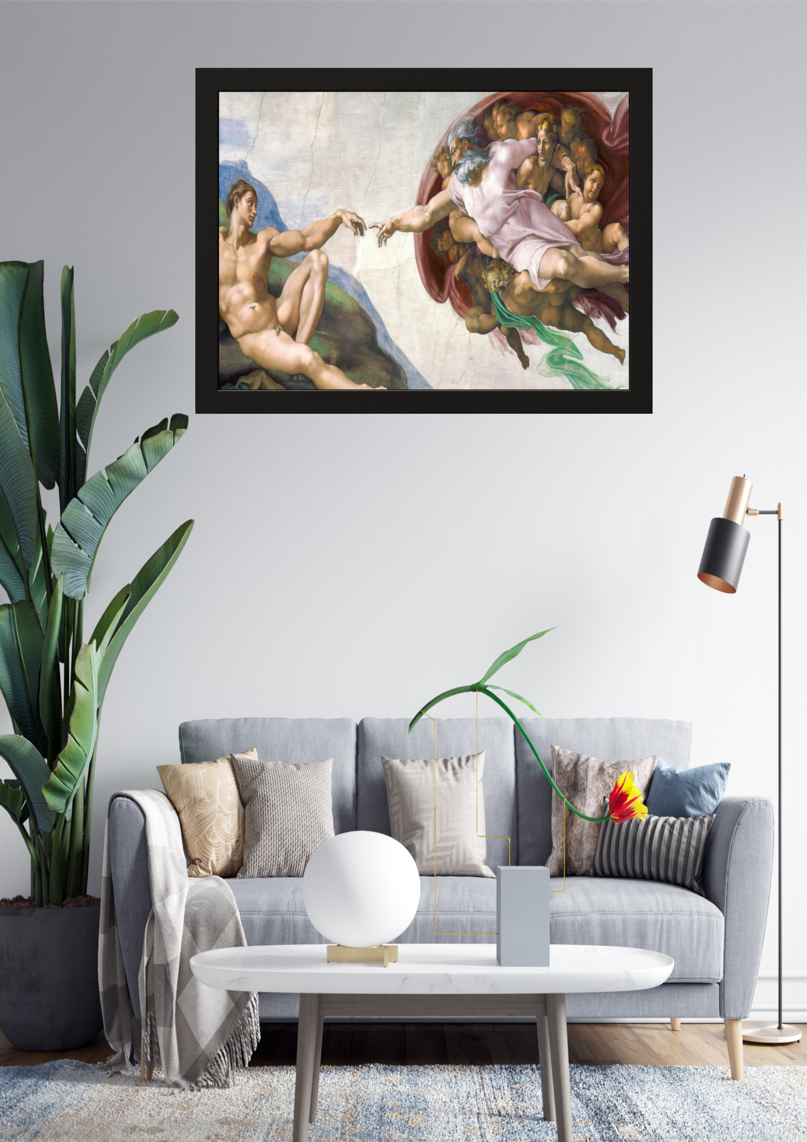 Este quadro é uma reprodução da famosa obra “A Criação de Adão” de Michelangelo, parte do teto da Capela Sistina. A pintura captura o momento icônico em que Deus dá vida a Adão, simbolizando a conexão entre o divino e o humano. Com suas cores vibrantes e detalhes impressionantes, a obra é uma celebração da arte renascentista e uma peça central que enriquece qualquer ambiente.