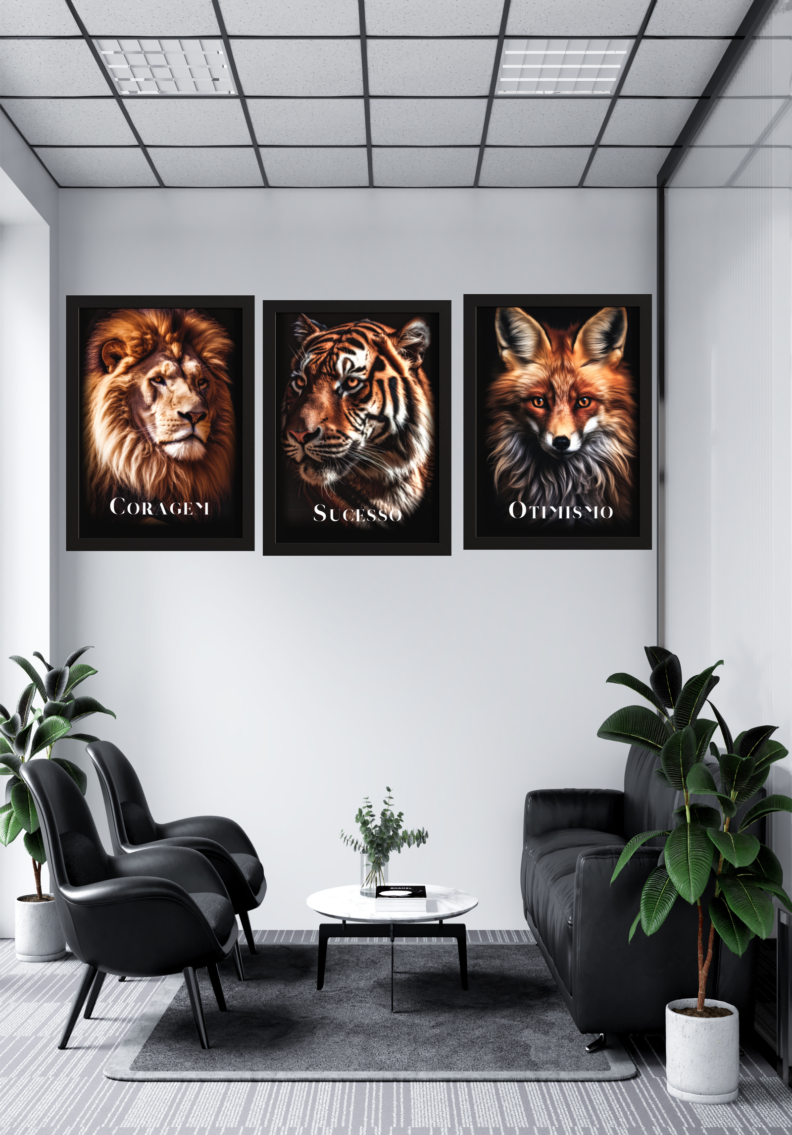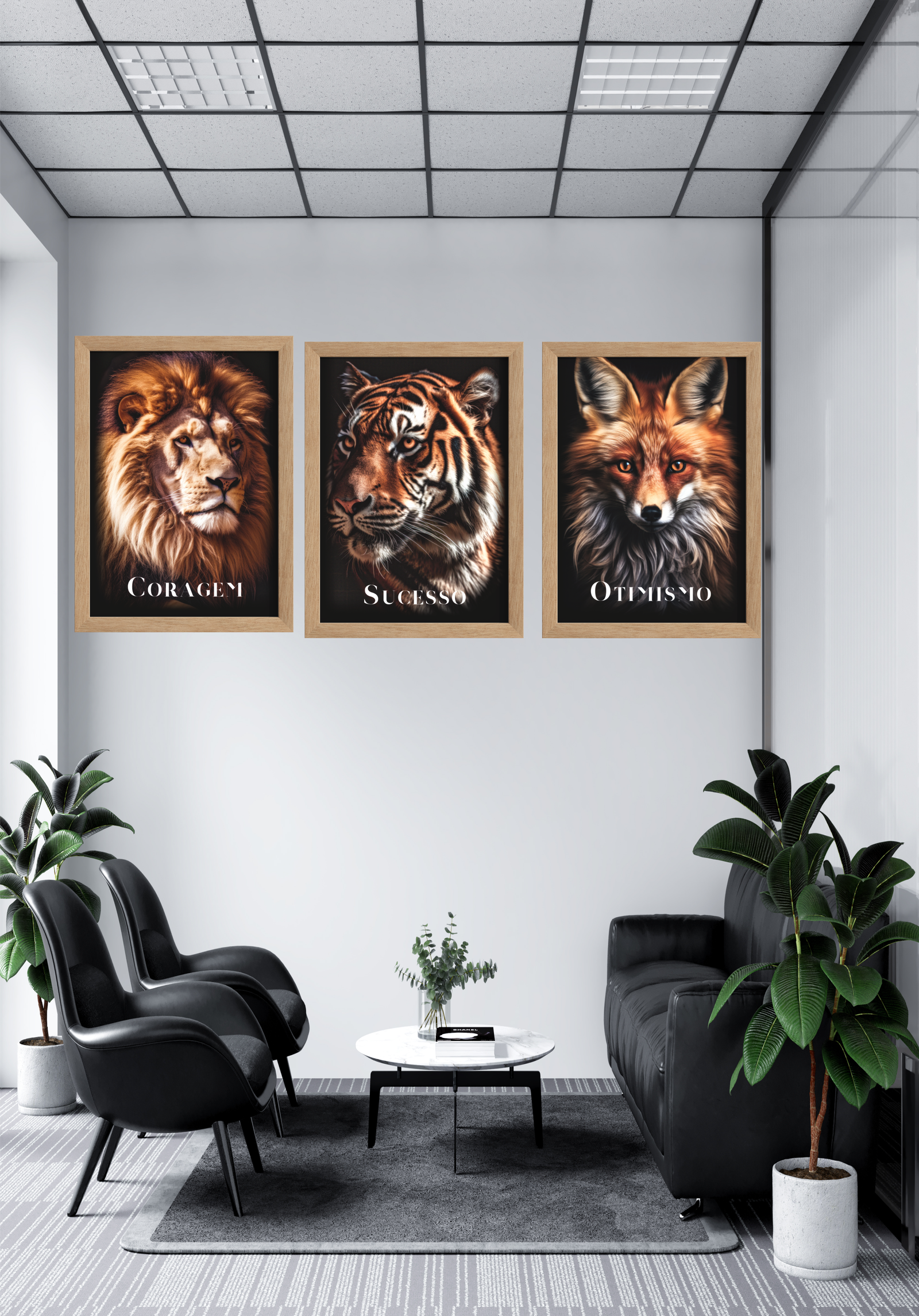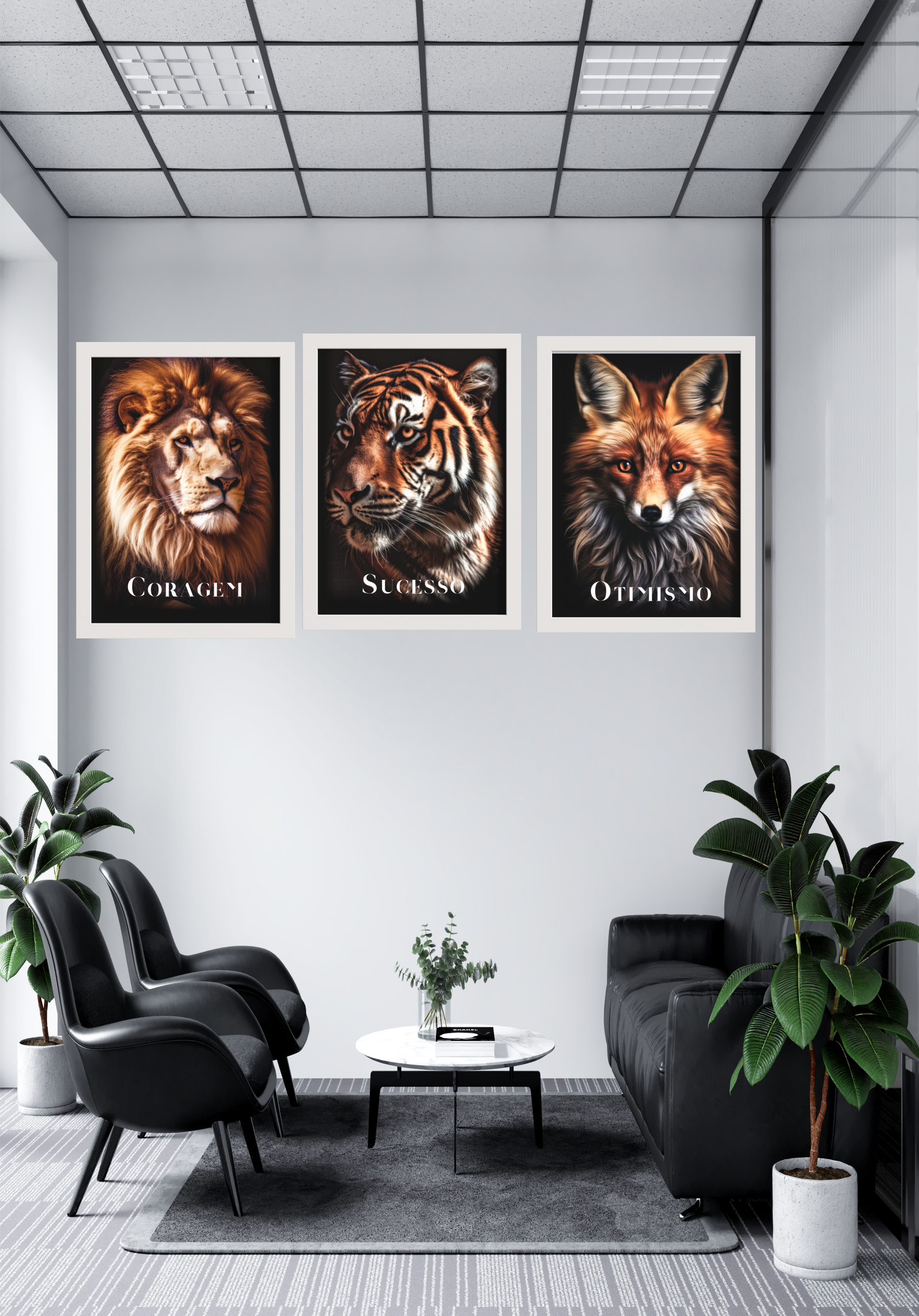 A imagem retrata um ambiente de escritório moderno e sofisticado, onde três quadros impressionantes dominam a parede principal. Cada quadro apresenta um animal majestoso com uma palavra inspiradora: um leão simbolizando “Coragem”, um tigre representando “Sucesso” e uma raposa evocando “Otimismo”. Esses elementos não apenas trazem um toque de natureza e vida selvagem ao espaço, mas também promovem uma atmosfera de motivação e foco. As cores vibrantes dos animais contrastam harmoniosamente com o mobiliário em tons neutros, criando um equilíbrio visual atraente. As plantas estrategicamente posicionadas adicionam um toque de frescor e vitalidade, enquanto as cadeiras confortáveis e a mesa de centro elegante completam o ambiente, tornando-o ideal para reuniões produtivas e momentos de reflexão.