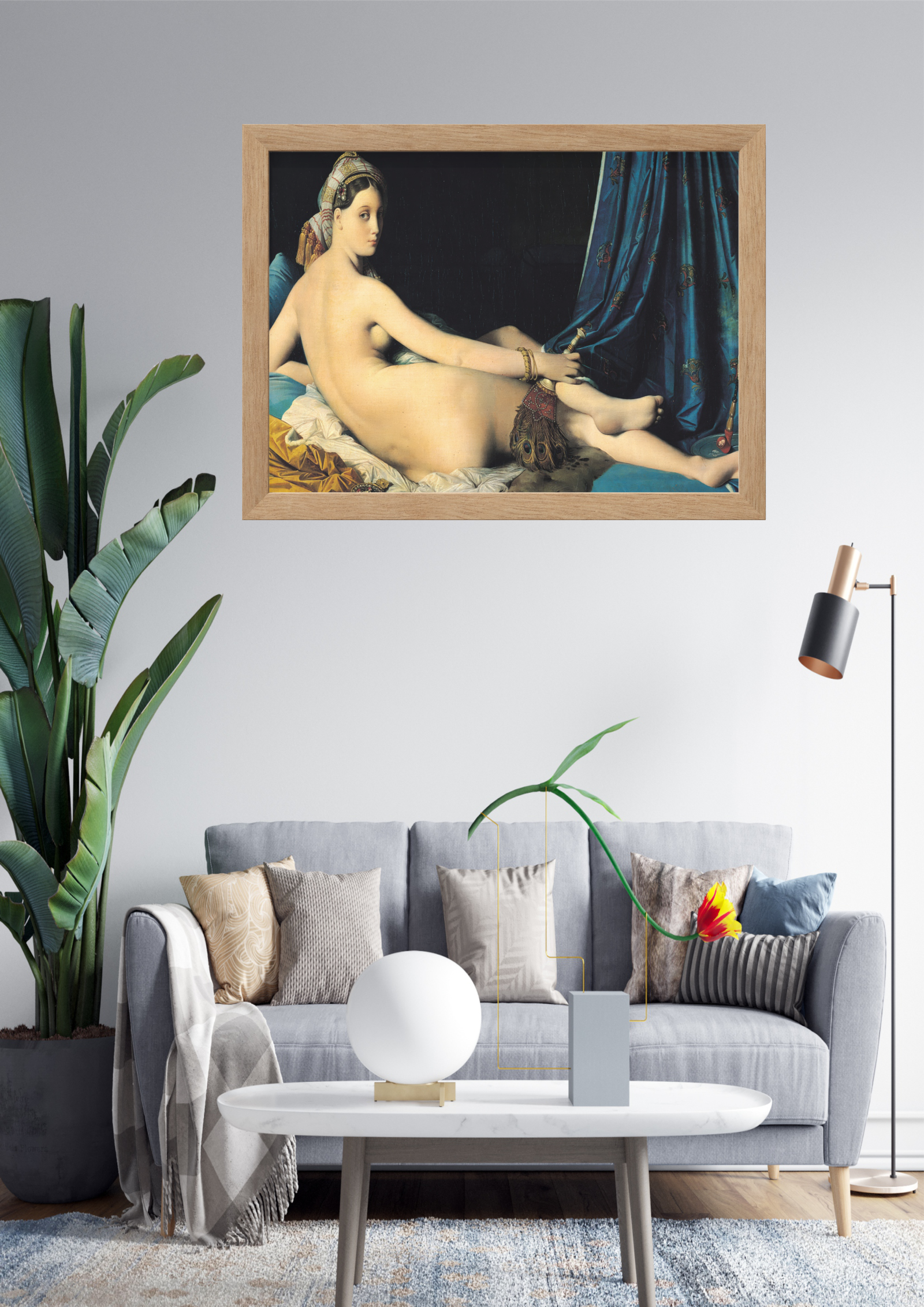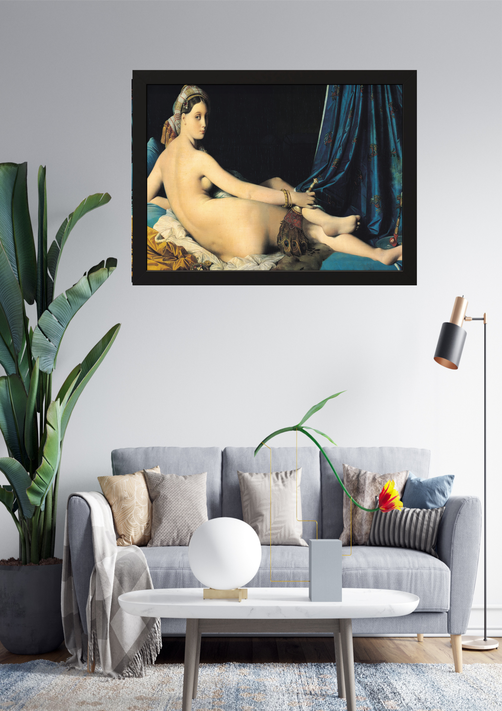 Esta obra retrata uma figura feminina reclinada, evocando a sensualidade e o mistério do Oriente. Com detalhes minuciosos e um uso magistral das cores, o quadro captura a essência da beleza clássica e a serenidade da cena. A composição elegante e os tecidos luxuosos adicionam um toque de exotismo e sofisticação ao ambiente.