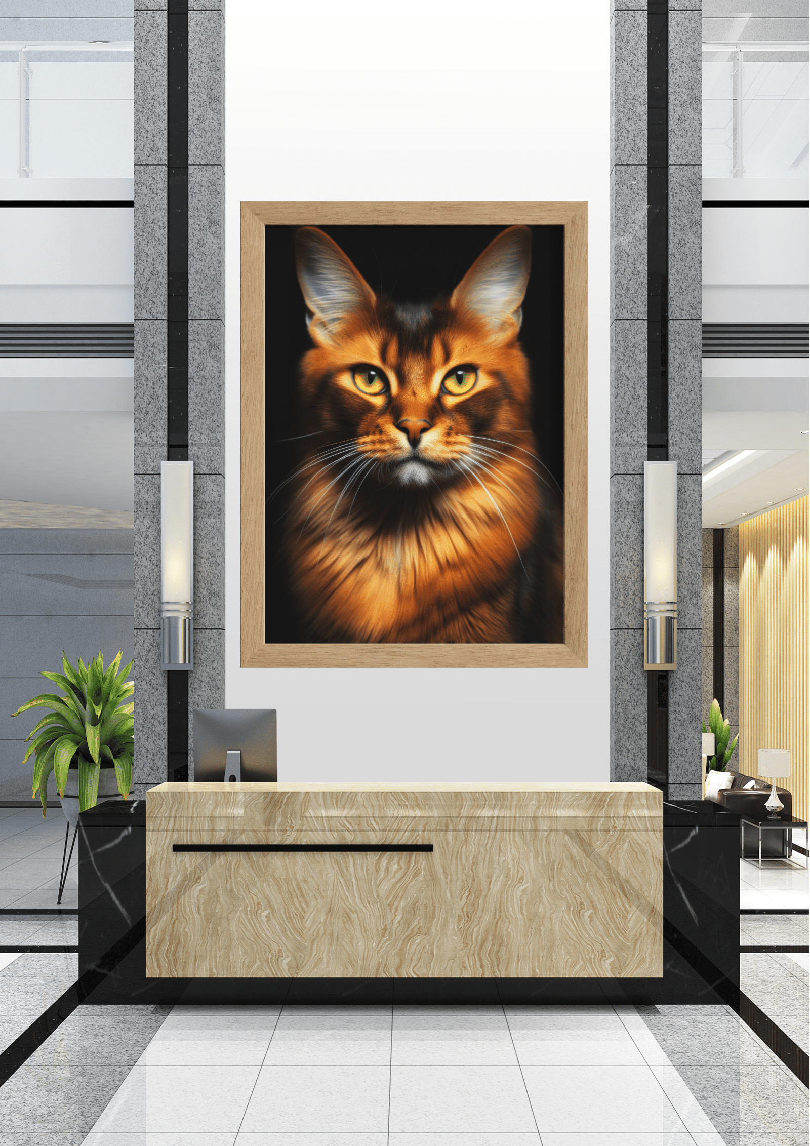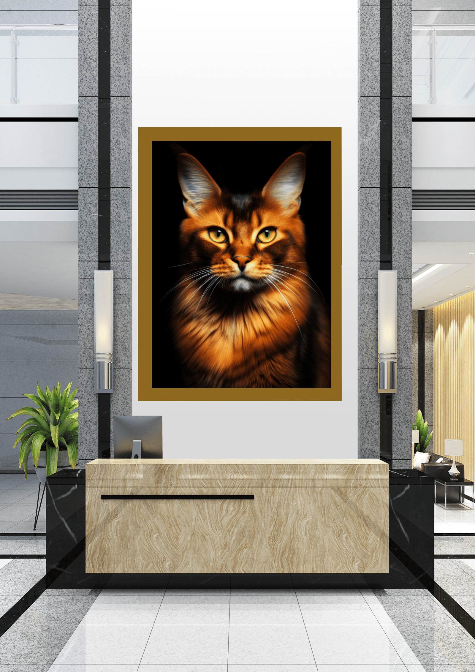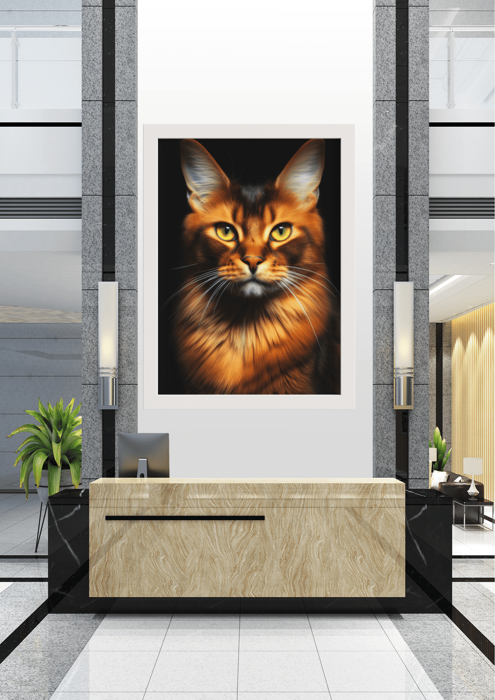Neste impressionante saguão de entrada, a presença marcante de uma obra de arte destaca-se como ponto focal. O retrato de um gato de aparência majestosa e olhar penetrante domina a parede atrás do balcão de recepção. A imagem, rica em detalhes e cores vibrantes, capta a essência e a nobreza do felino, conferindo ao ambiente um ar de sofisticação e mistério.