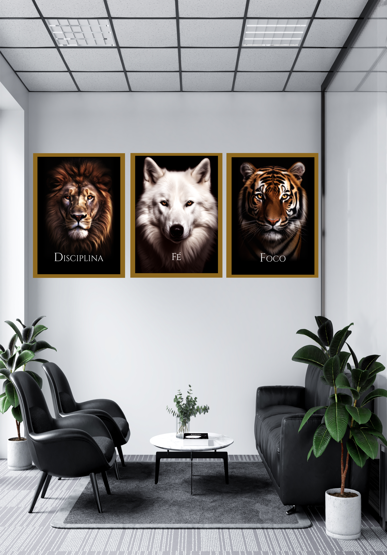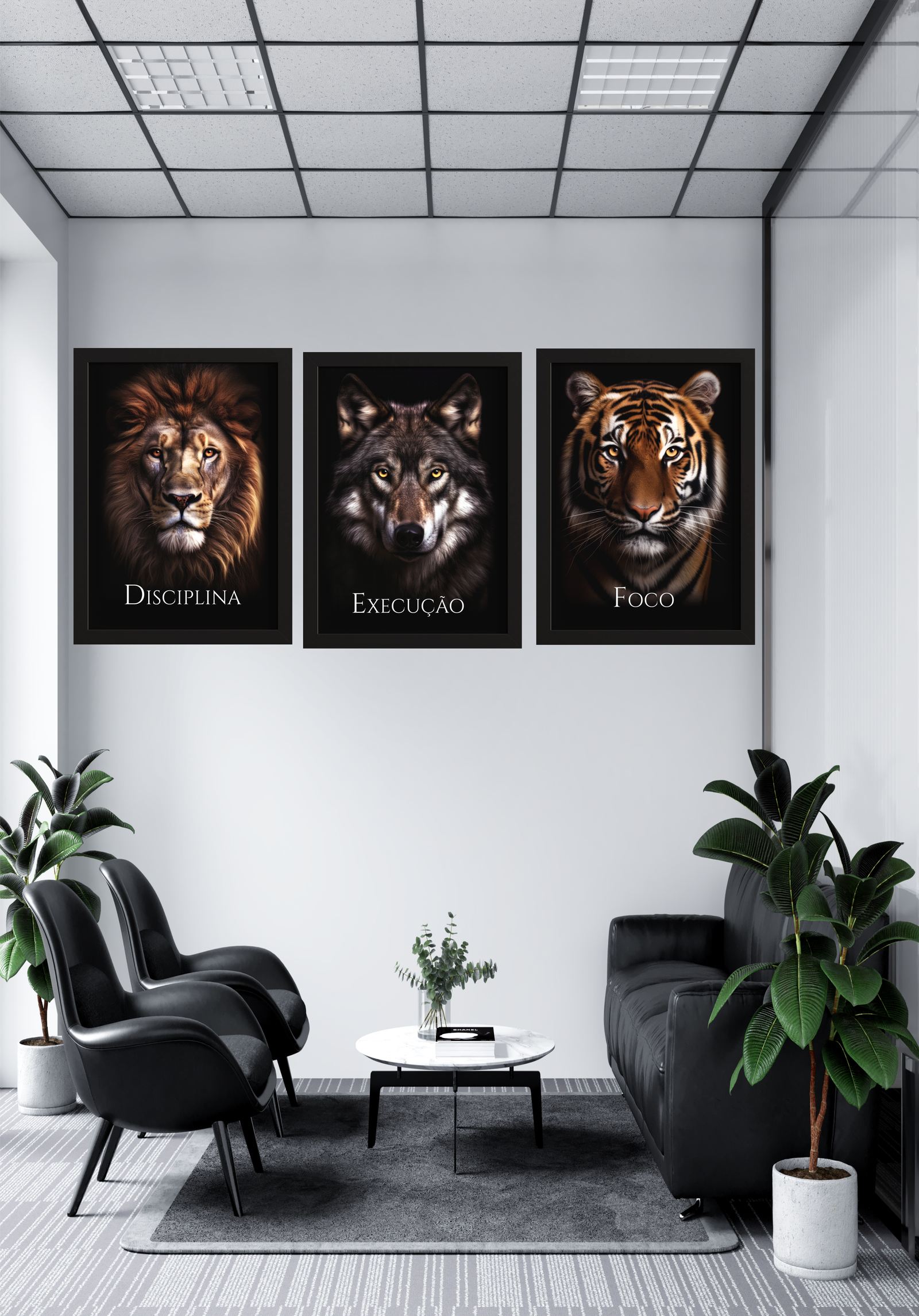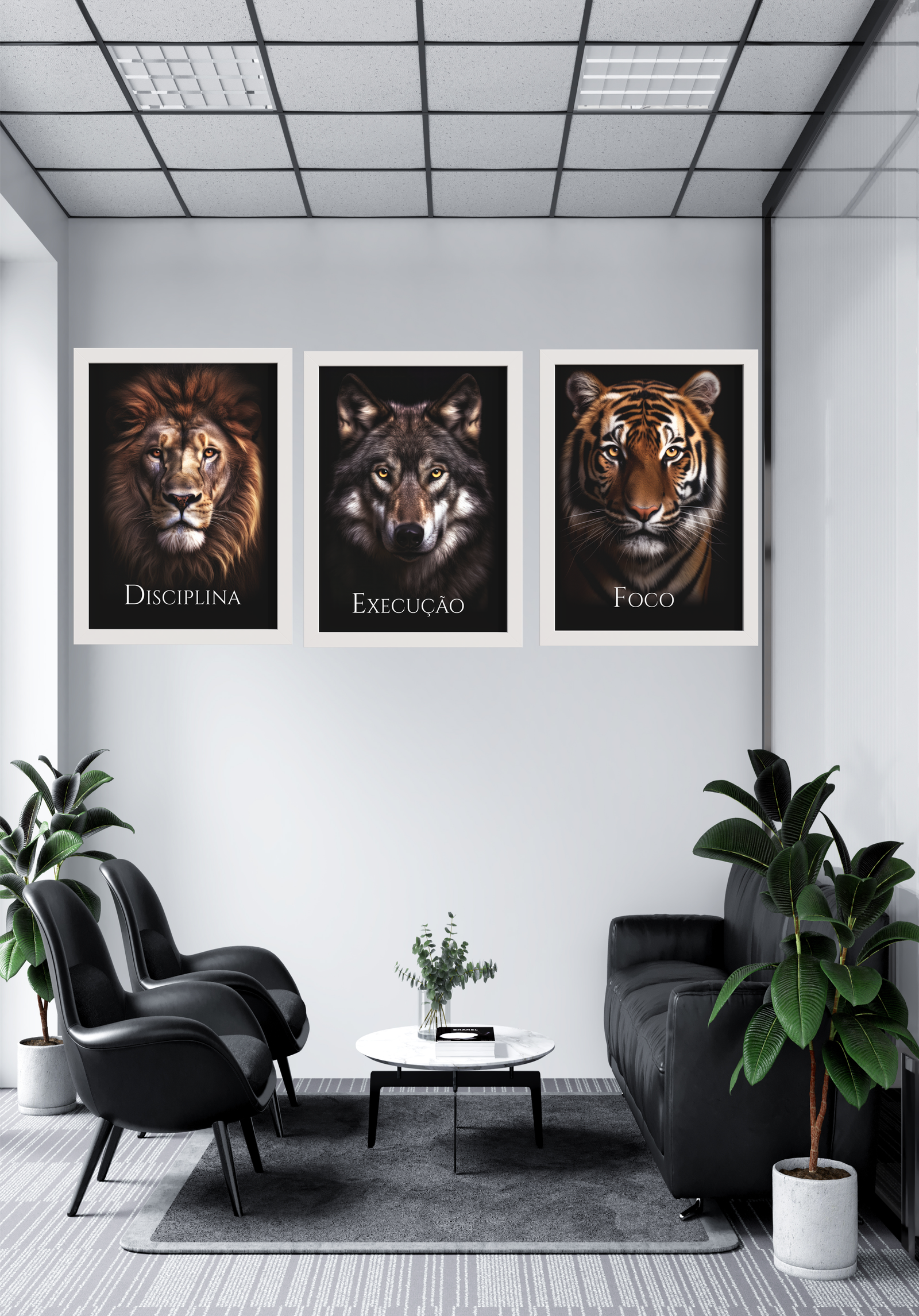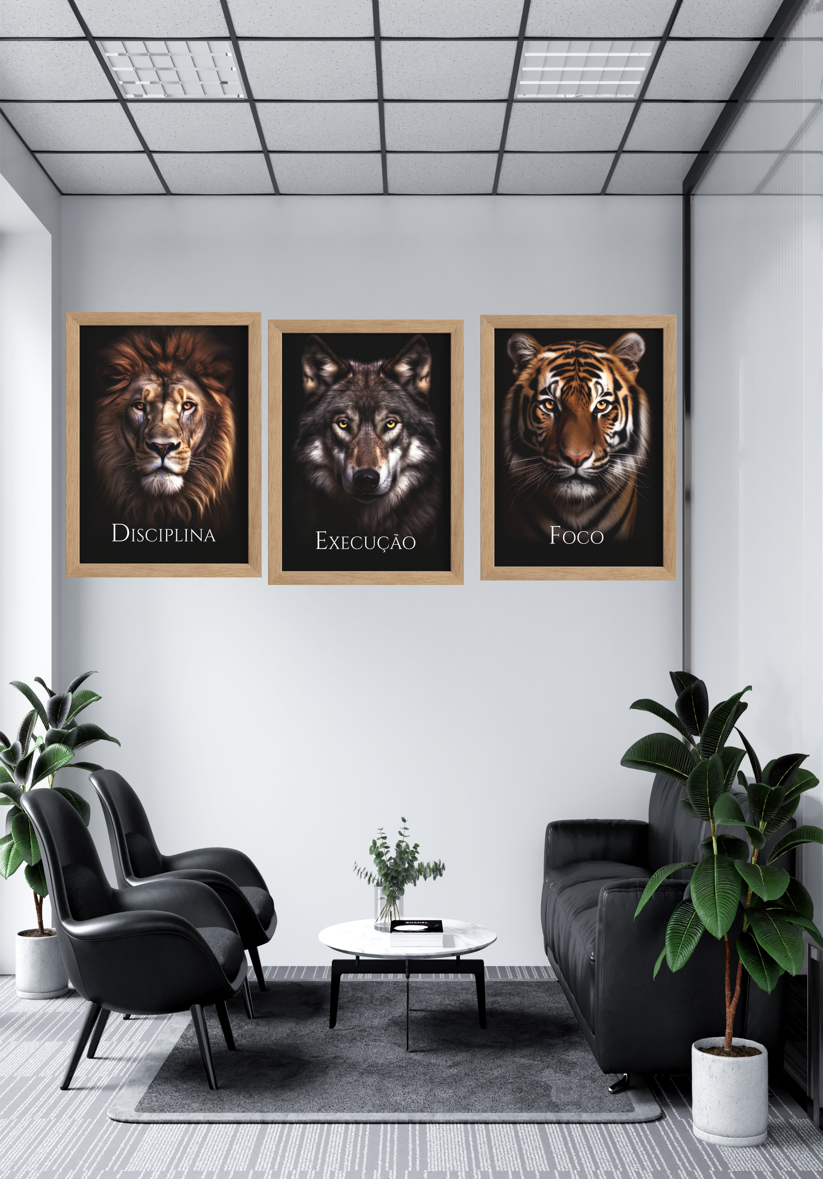 A imagem retrata um ambiente de escritório moderno, onde três quadros icônicos dominam a parede, cada um simbolizando um princípio essencial para o sucesso pessoal e profissional. O leão, com seu olhar penetrante, representa a “Disciplina”, evocando a importância do autocontrole e da determinação contínua. Ao seu lado, o lobo, símbolo de “Execução”, destaca a necessidade de ação estratégica e trabalho em equipe para alcançar objetivos. Por fim, o tigre, com sua presença imponente, encarna o “Foco”, enfatizando a concentração e a clareza de propósito. Esses três animais poderosos não são apenas decorações, mas lembretes visuais de qualidades que inspiram e guiam o caminho para o êxito. O ambiente é complementado por móveis elegantes e plantas que trazem um toque de natureza, criando um espaço harmonioso e motivador.