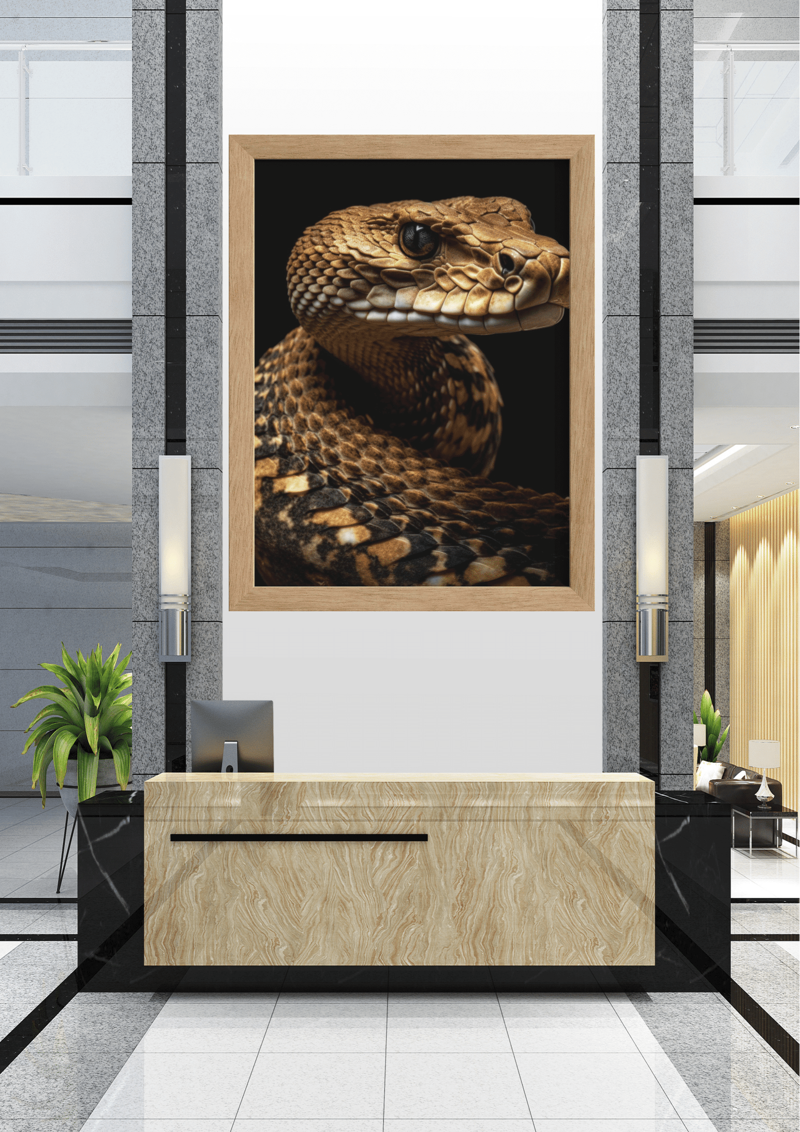No coração de um lobby moderno, onde o design minimalista e a sofisticação se encontram, destaca-se uma obra de arte impressionante: o retrato de uma serpente majestosa. A imagem, com detalhes meticulosos, captura a essência e a força do réptil, seus olhos negros fixando-se no observador com uma intensidade quase hipnotizante. As escamas, brilhantes e texturizadas, refletem uma paleta de cores terrosas que harmoniza perfeitamente com o ambiente elegante e contemporâneo do espaço.