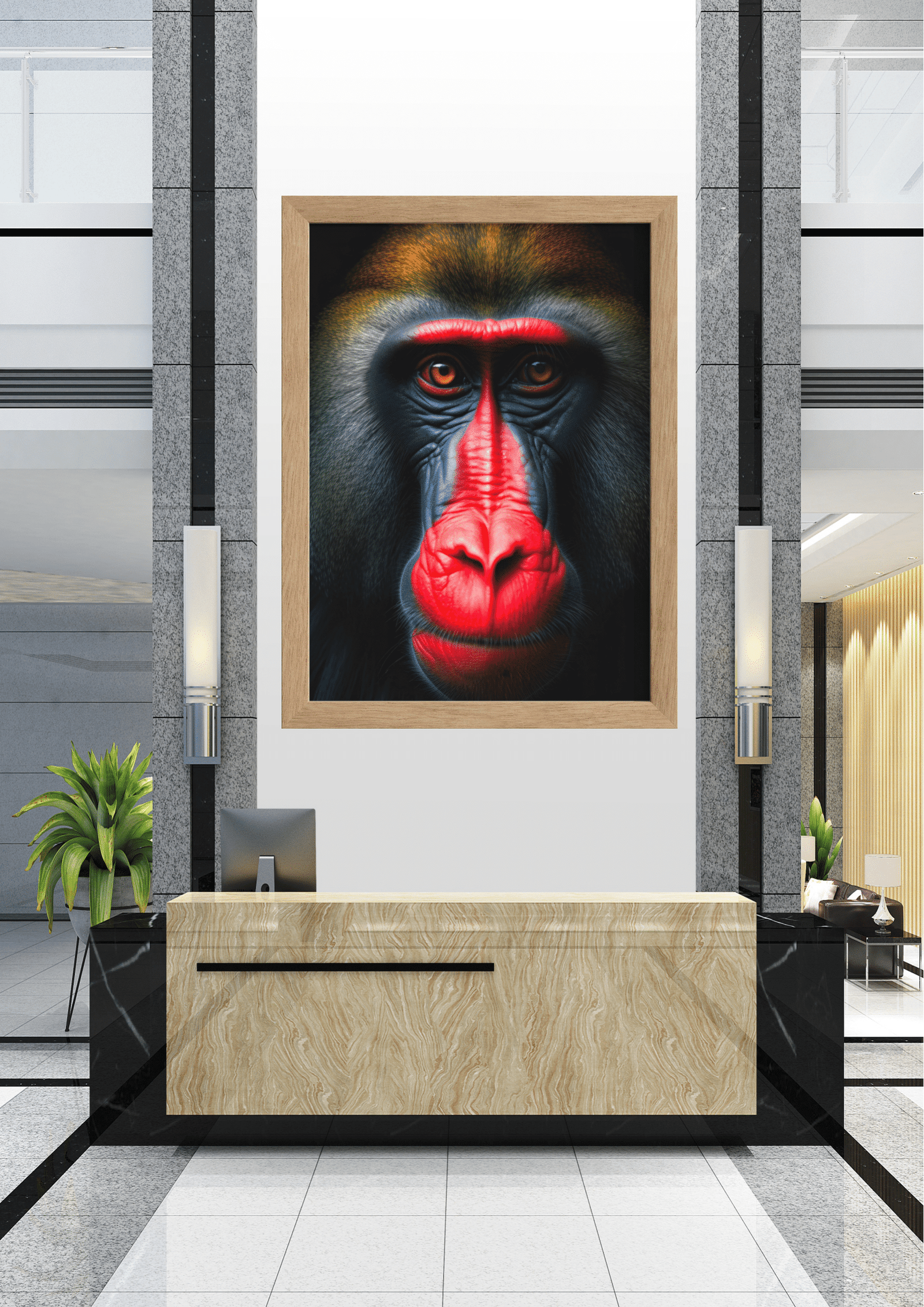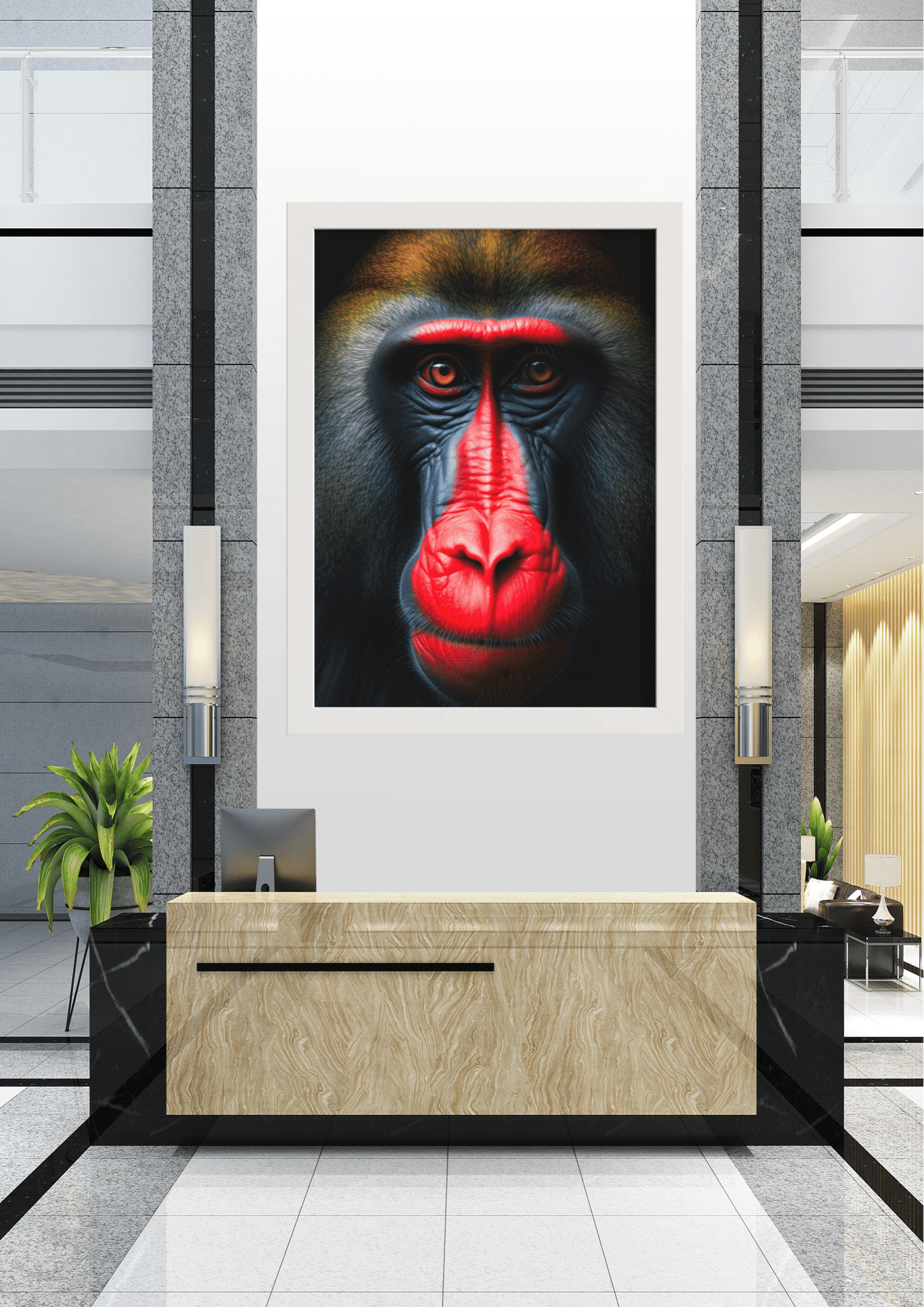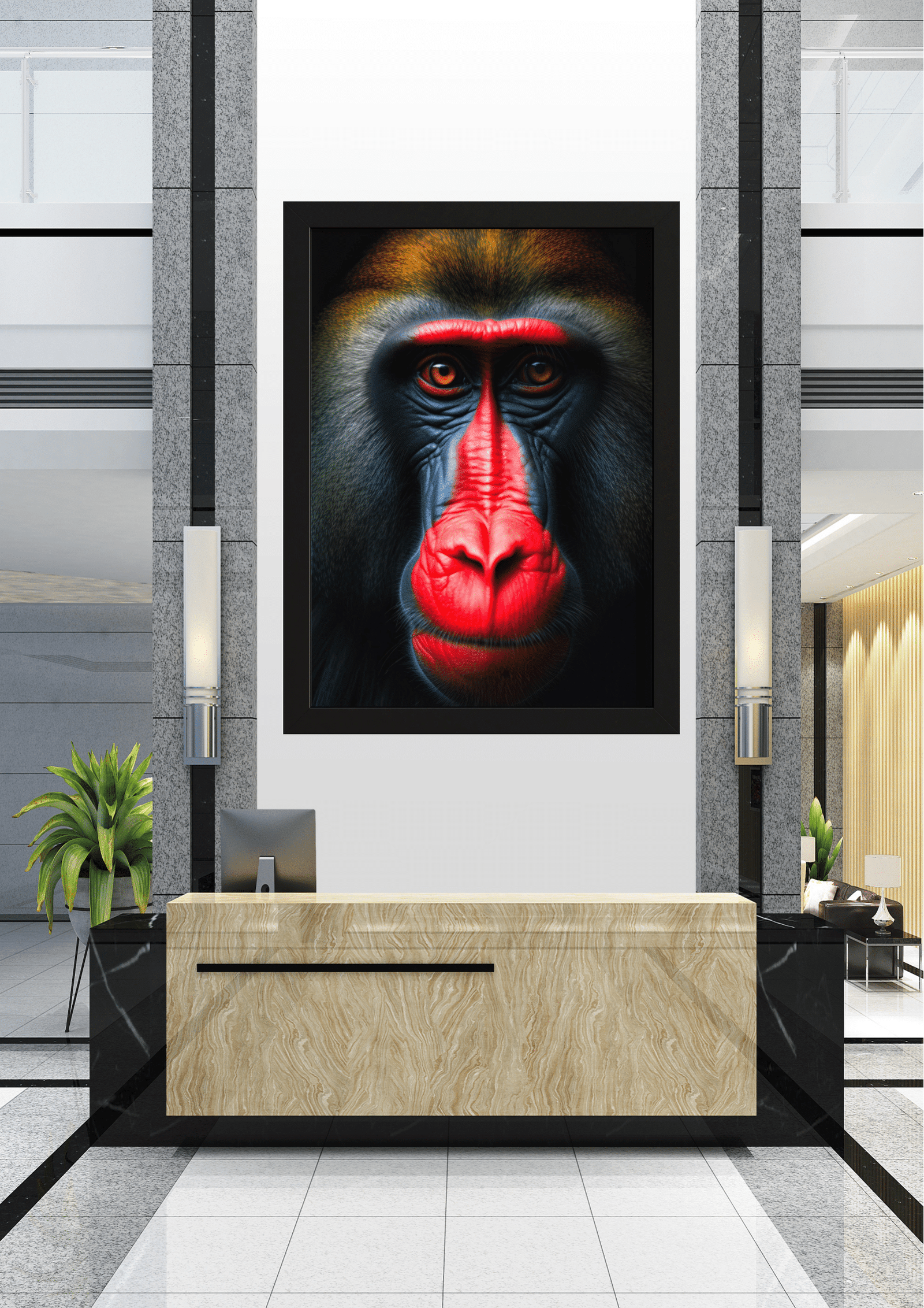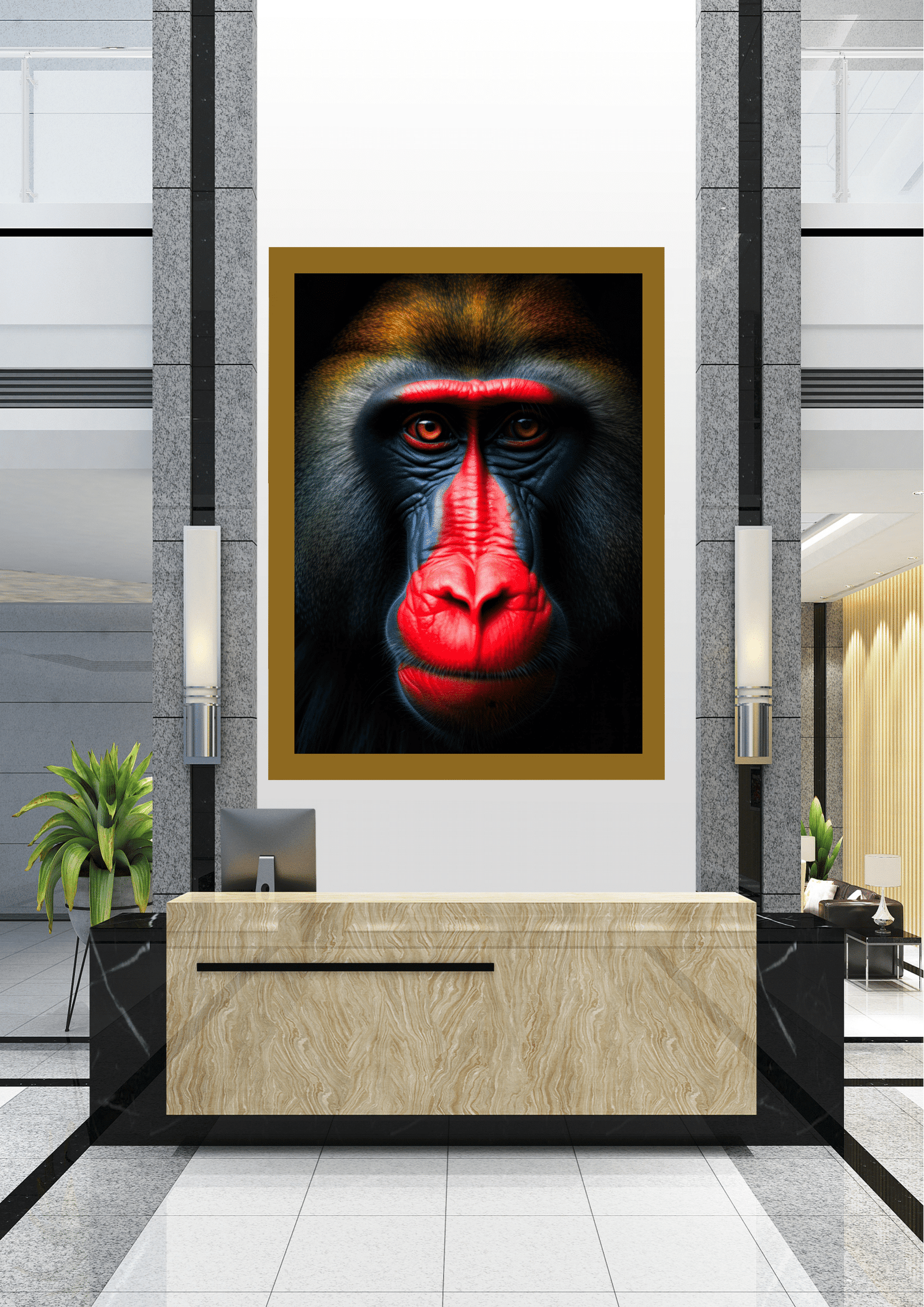 O hall, decorado com mármore e detalhes em preto, serve como um cenário perfeito para a obra de arte, criando um contraste que realça ainda mais a beleza selvagem do mandril. Plantas estrategicamente colocadas adicionam um toque de natureza ao espaço, complementando a temática da imagem. A iluminação suave e elegante destaca a textura do quadro e a imponência do animal, tornando-o o ponto focal do ambiente.