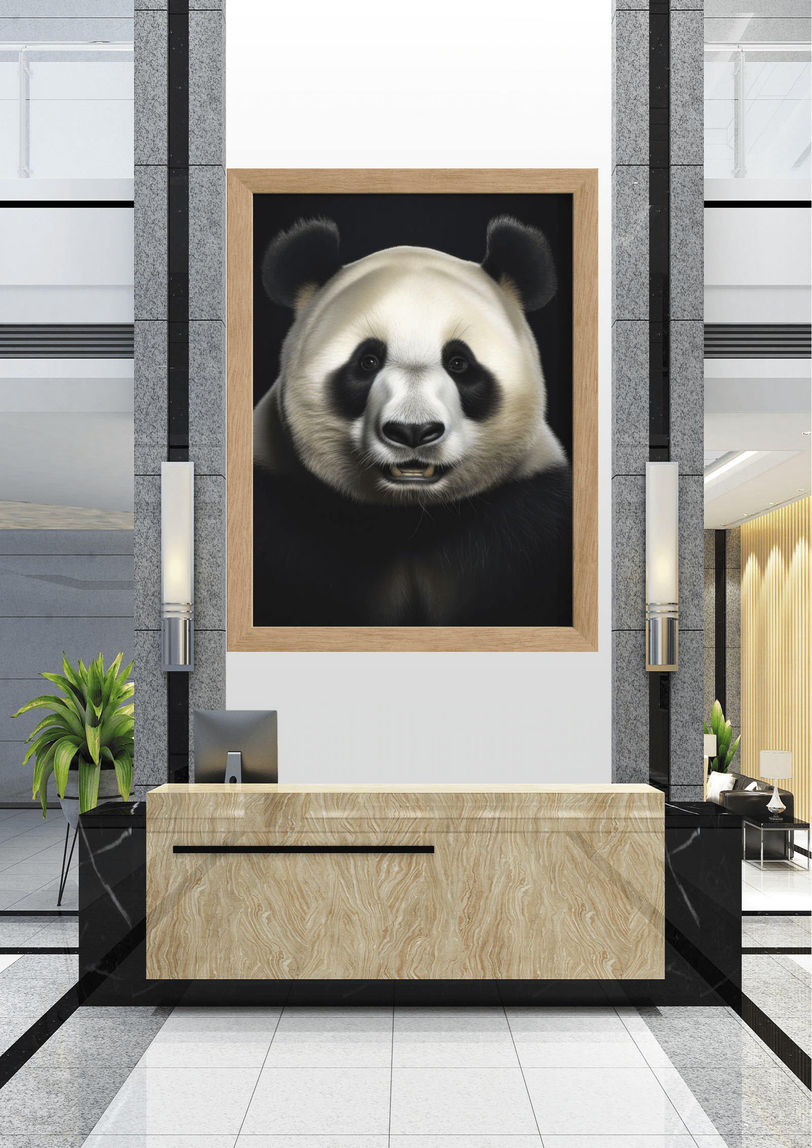 No coração de um moderno saguão empresarial, destaca-se uma impressionante obra de arte que captura a essência majestosa de um panda. Este retrato, emoldurado com elegância, é o ponto focal do ambiente, trazendo uma sensação de tranquilidade e charme natural ao espaço. O panda, com seu olhar sereno, parece observar atentamente cada visitante que adentra o local, estabelecendo uma conexão silenciosa e poderosa. A escolha do panda não é apenas estética; simboliza paz, equilíbrio e a importância da preservação ambiental, valores que ressoam com a missão da empresa. A combinação entre o design contemporâneo do saguão e a imagem clássica do panda cria um contraste harmonioso, refletindo a fusão entre inovação e tradição. Este ambiente, além de funcional, torna-se uma experiência visual e emocional, convidando todos a uma pausa contemplativa em meio à correria do cotidiano.