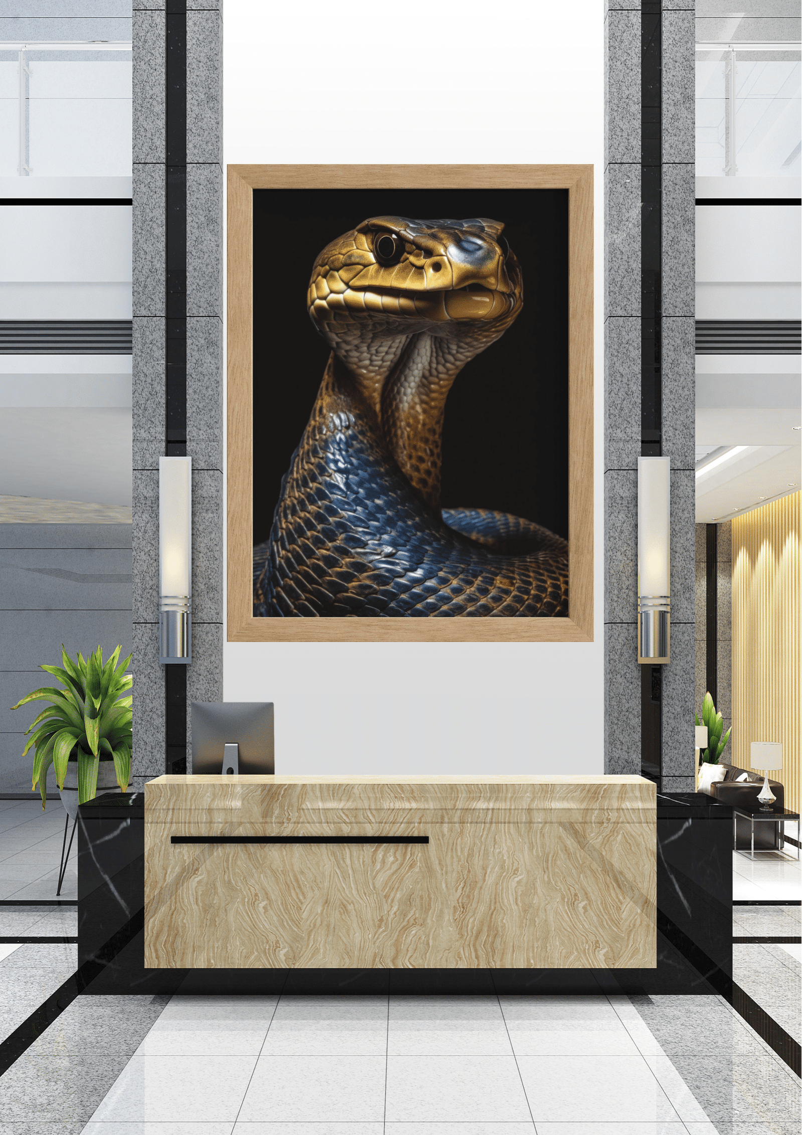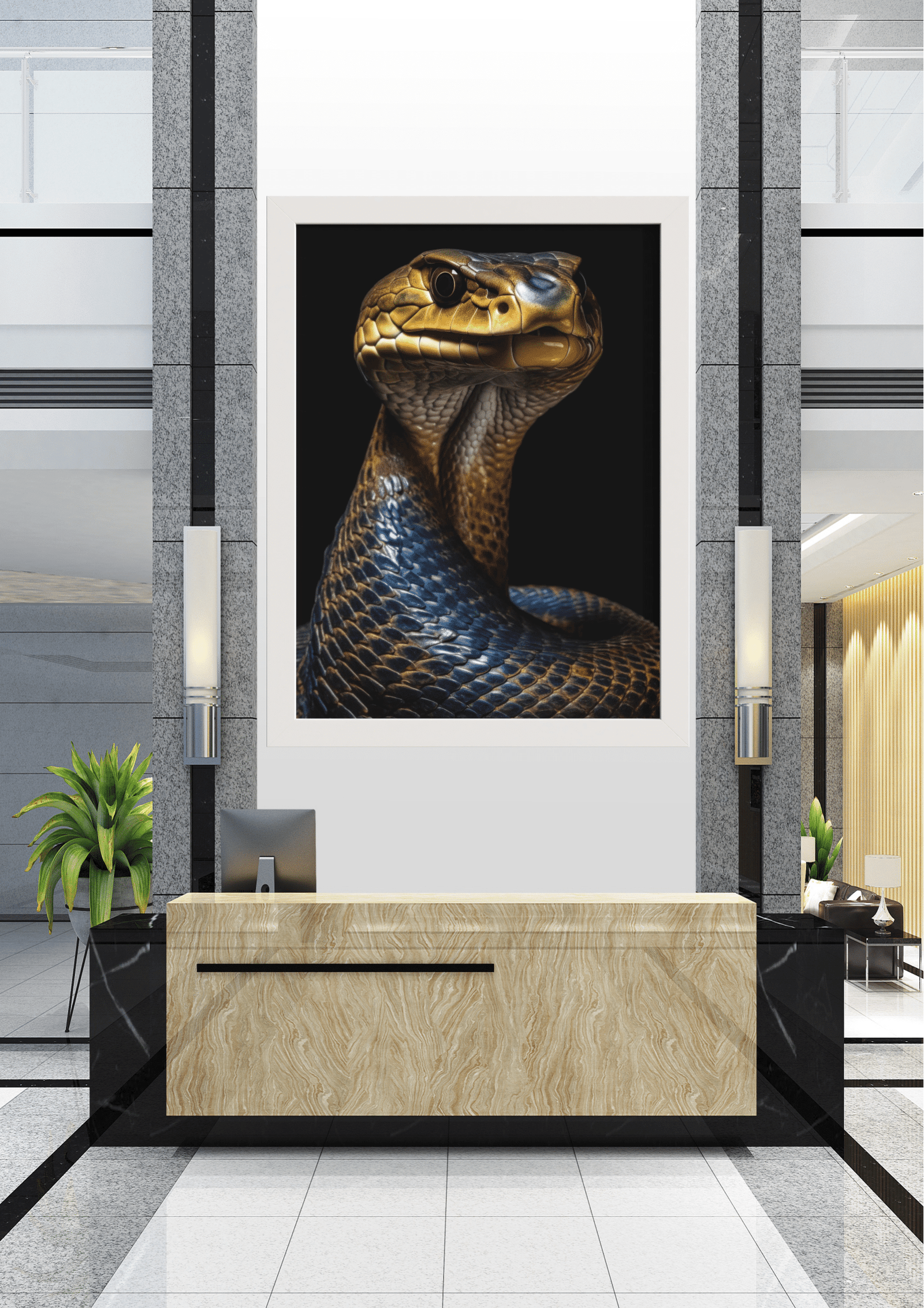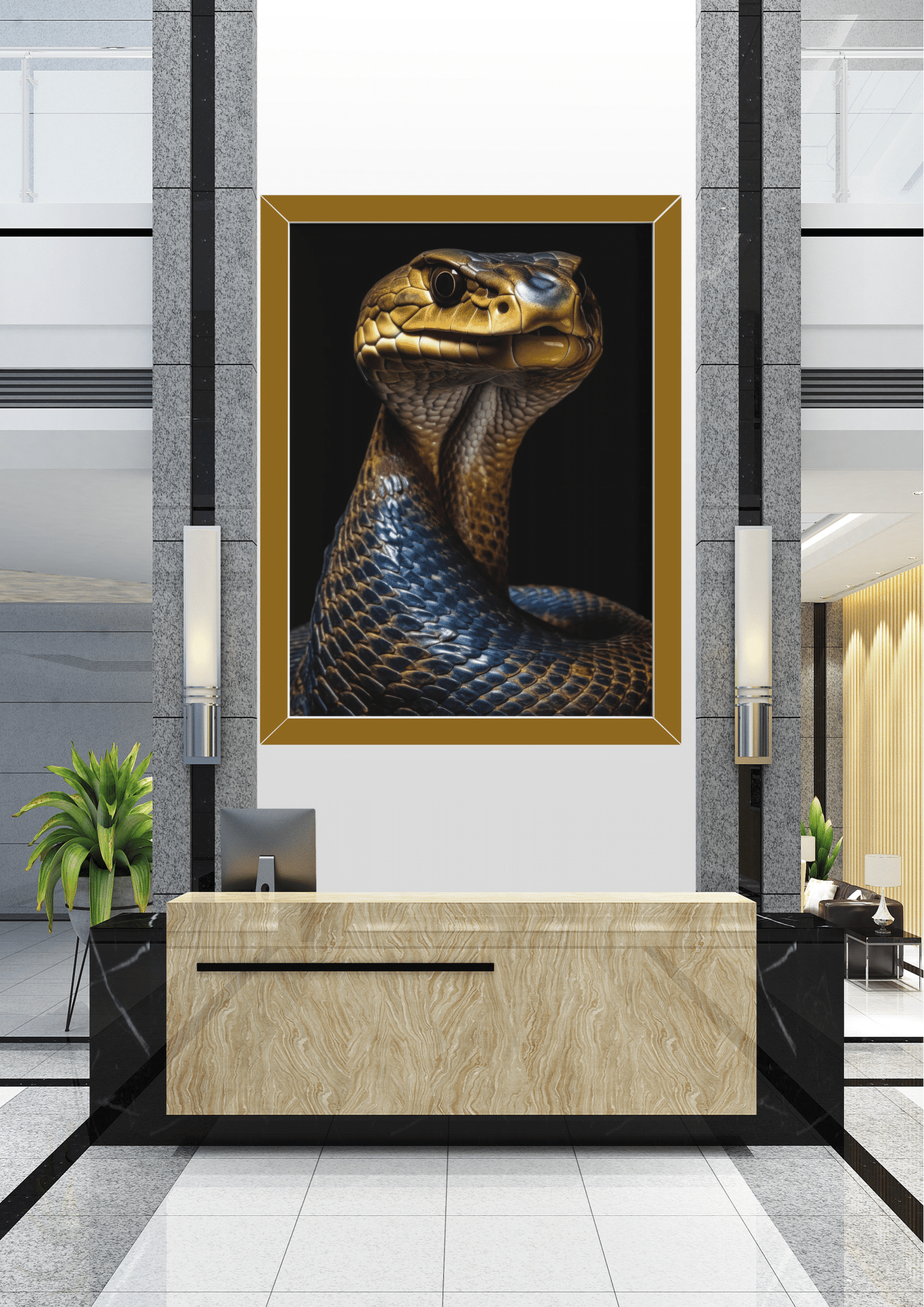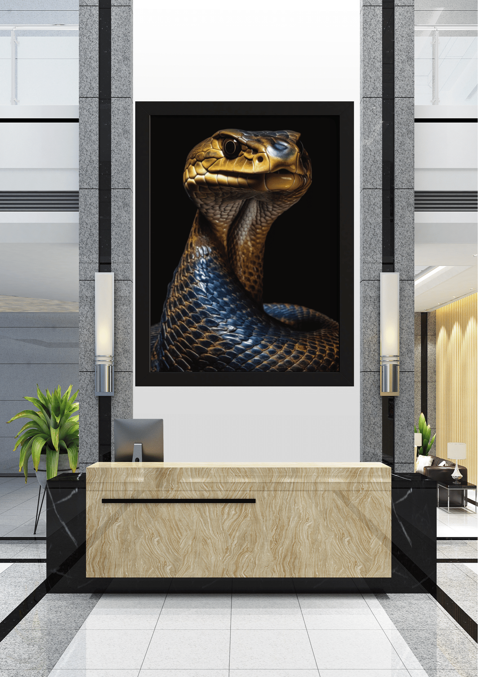 A imagem retrata uma recepção sofisticada, onde o destaque é uma imponente obra de arte que domina o ambiente. O retrato de uma cobra, com escamas em tons de dourado e azul, captura imediatamente a atenção com seu olhar penetrante e postura majestosa. A escolha da cobra como tema central sugere um equilíbrio entre elegância e mistério, simbolizando sabedoria e transformação. O design moderno da recepção, com suas linhas limpas e materiais de alta qualidade, complementa a dramaticidade da imagem. Plantas verdes adicionam um toque de vida e frescor ao espaço, criando uma harmonia entre o natural e o artístico. Este ambiente é ideal para impressionar visitantes, transmitindo uma sensação de poder e sofisticação. A iluminação suave destaca o quadro, realçando suas cores vibrantes e detalhes intrincados, enquanto a mobília minimalista garante que a arte permaneça como o foco principal.