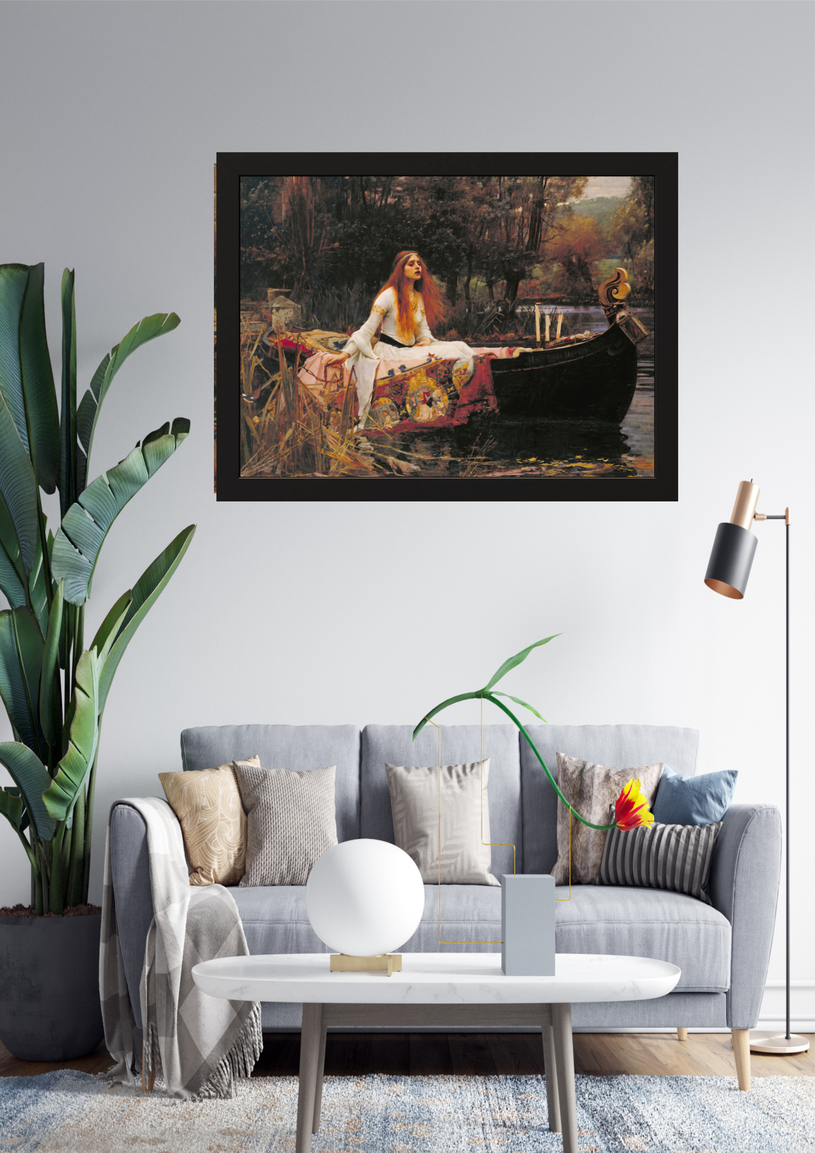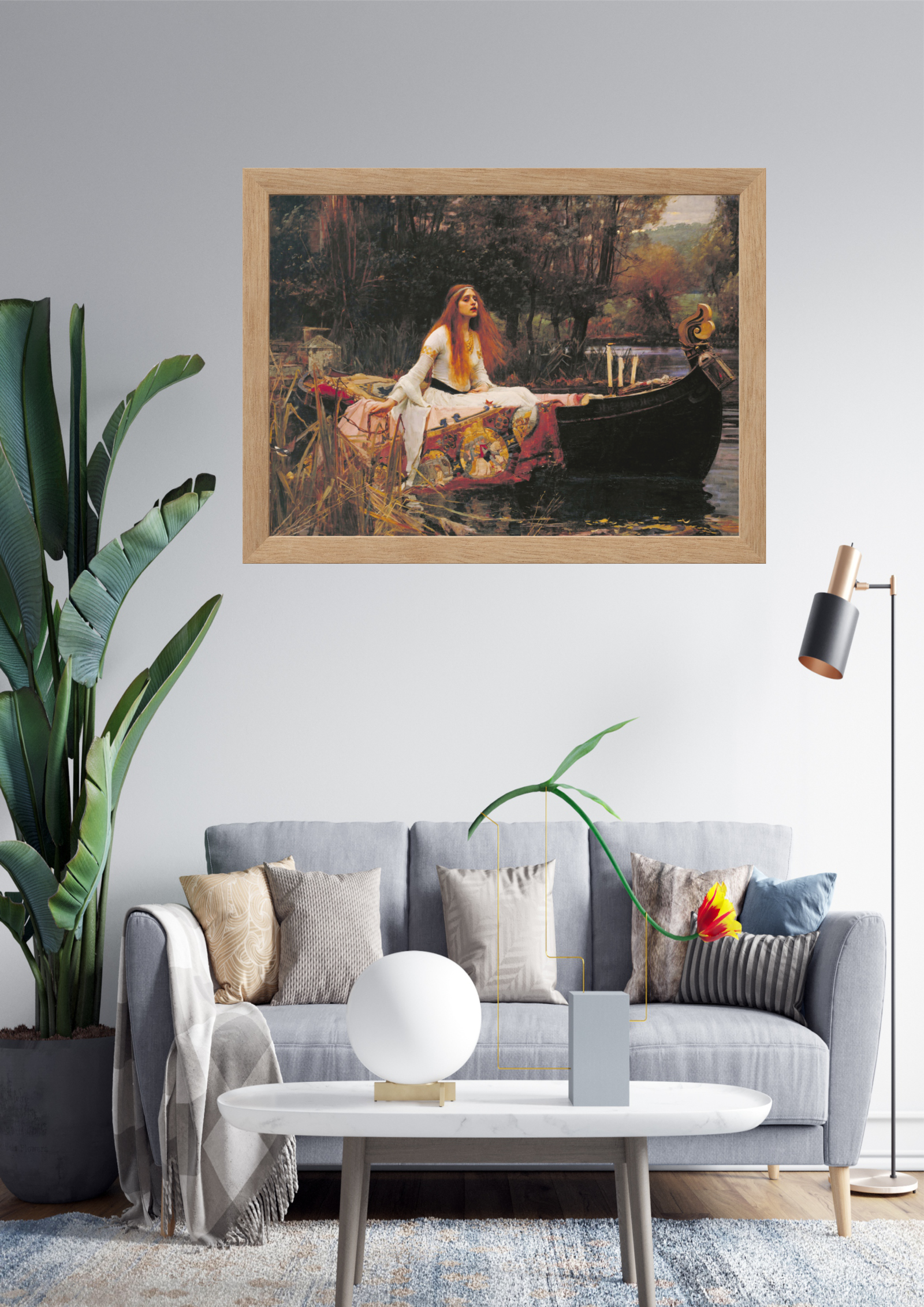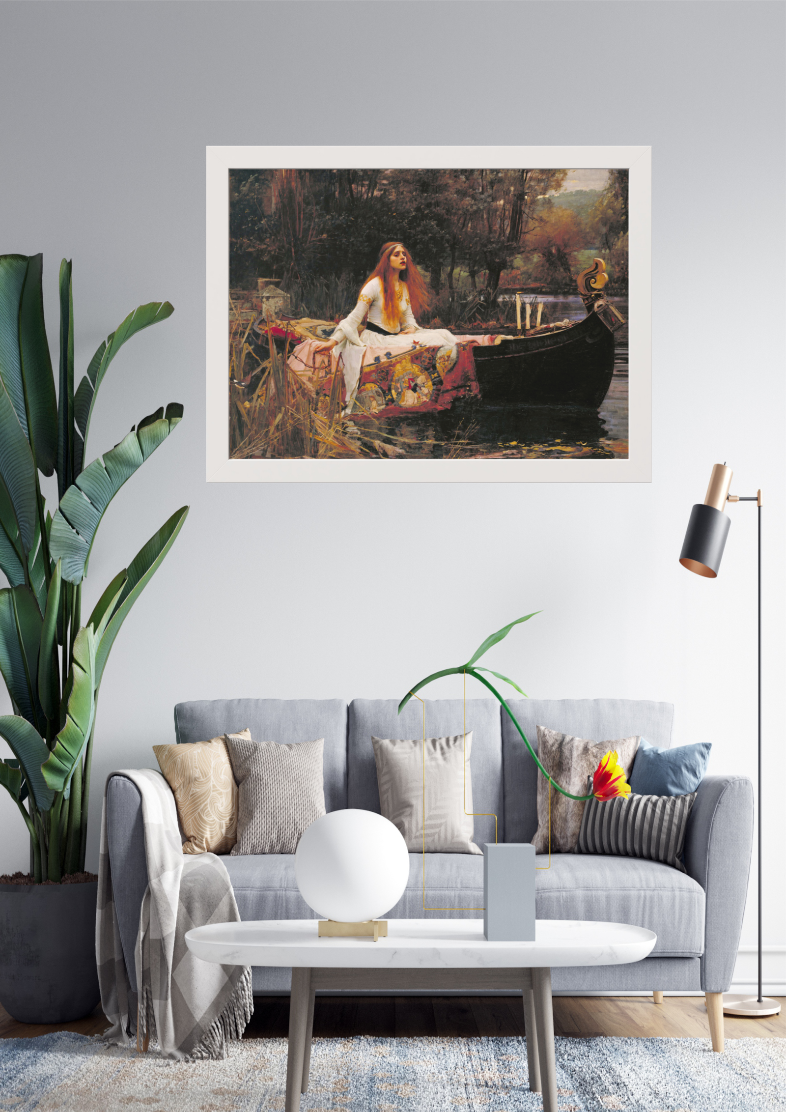 Esta imagem apresenta uma sala de estar moderna e elegante, decorada com um sofá cinza claro, almofadas em tons neutros e uma mesa de centro branca minimalista. A parede principal é adornada com uma magnífica pintura clássica, que adiciona um toque de sofisticação e arte ao ambiente. Plantas verdes e um abajur moderno complementam a decoração, criando um espaço harmonioso e acolhedor.