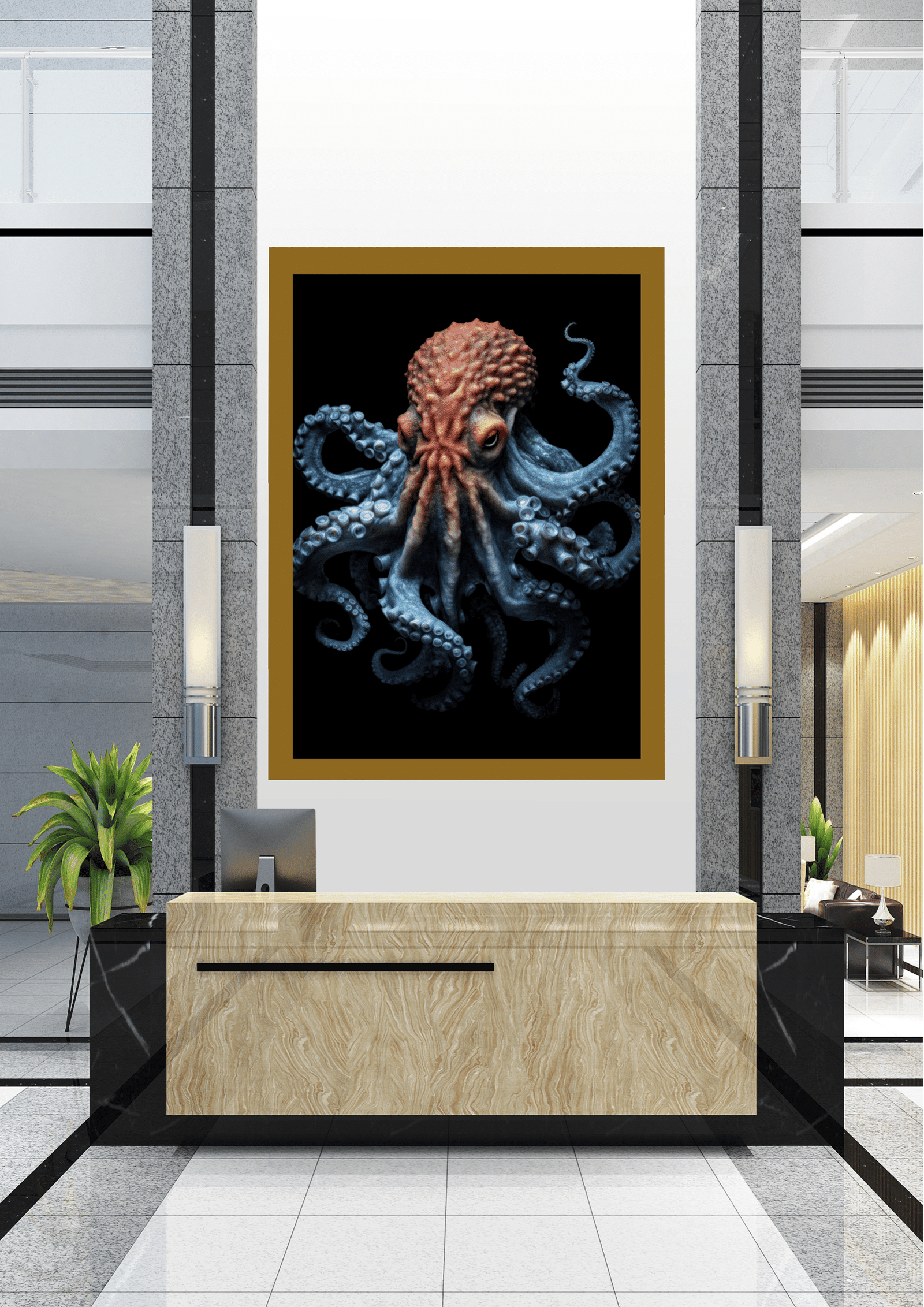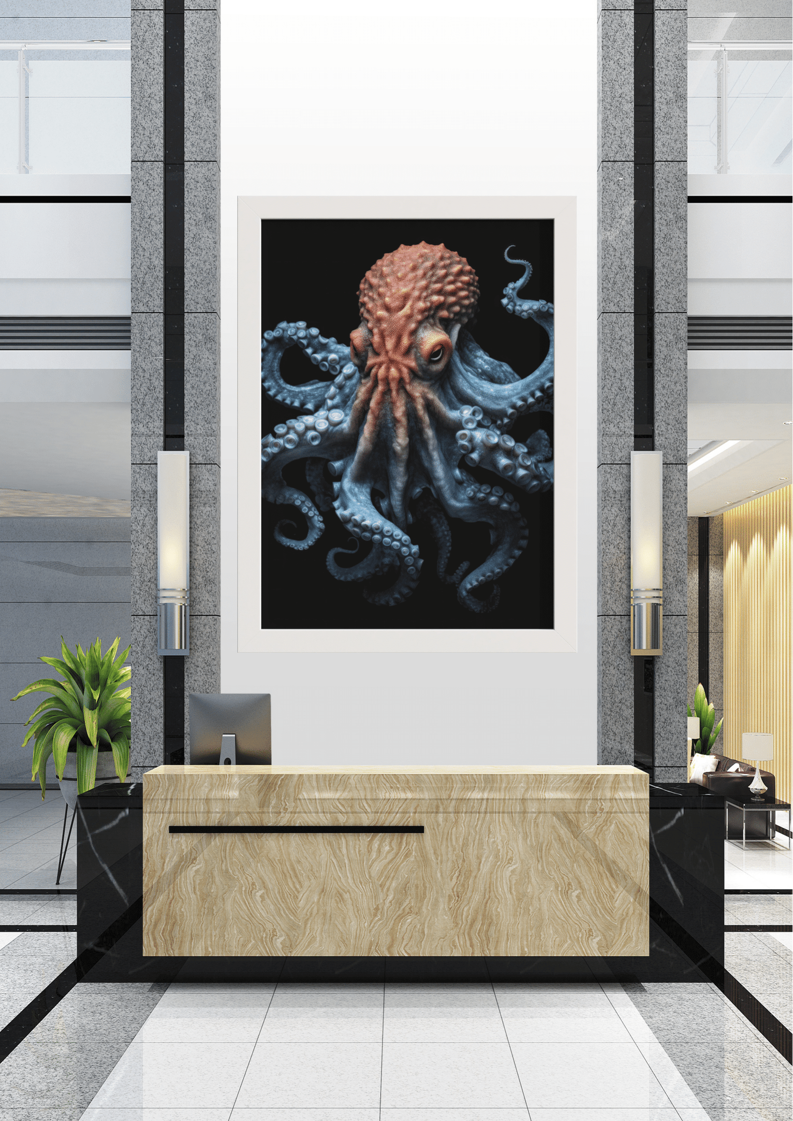 A obra de arte está emoldurada em preto e pendurada em uma parede branca imaculada, parte de um interior moderno e minimalista. O ambiente ao redor, com suas colunas de granito, balcão de madeira e plantas decorativas, cria um contexto contemporâneo que contrasta e complementa a natureza orgânica e selvagem da imagem do polvo.