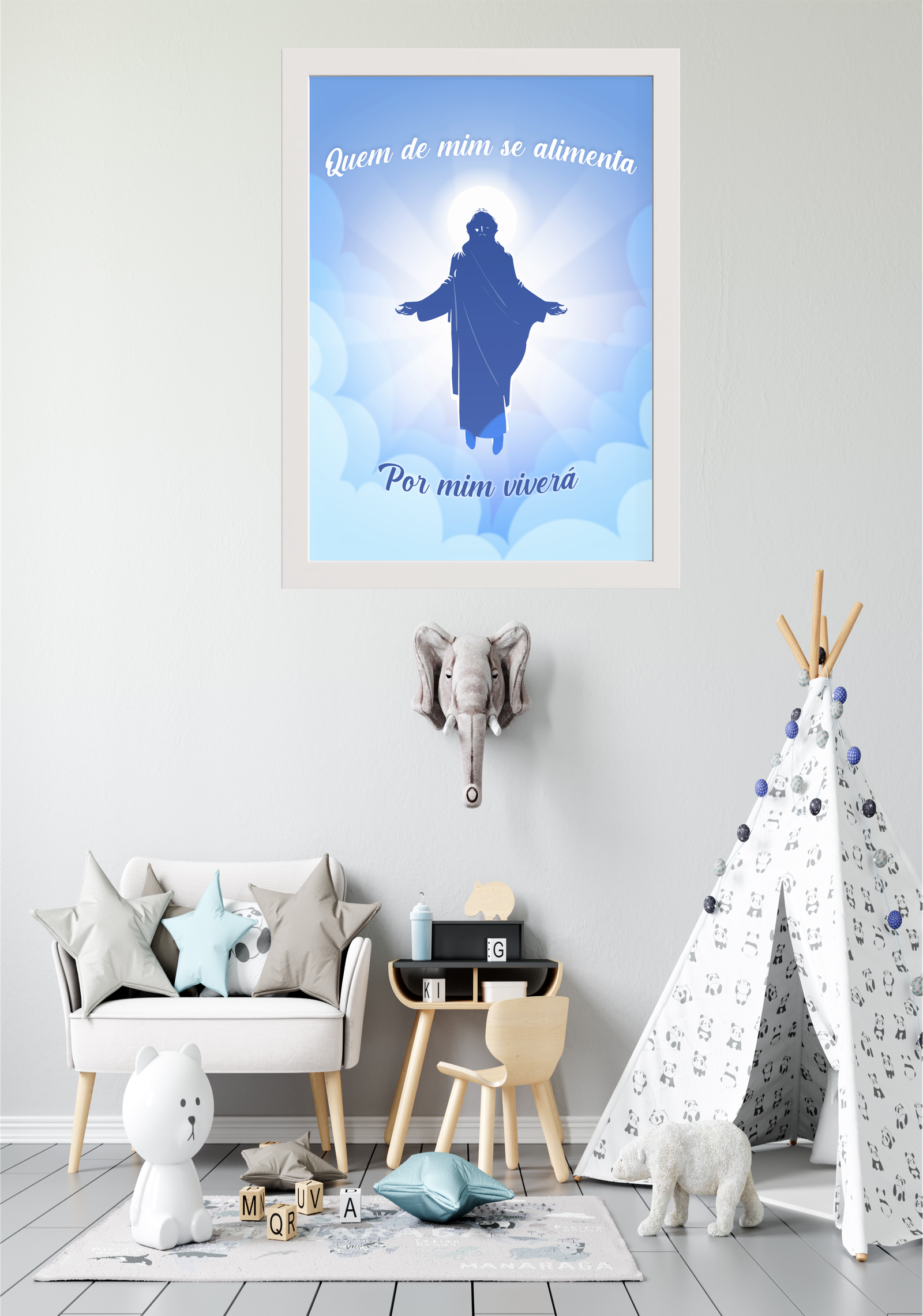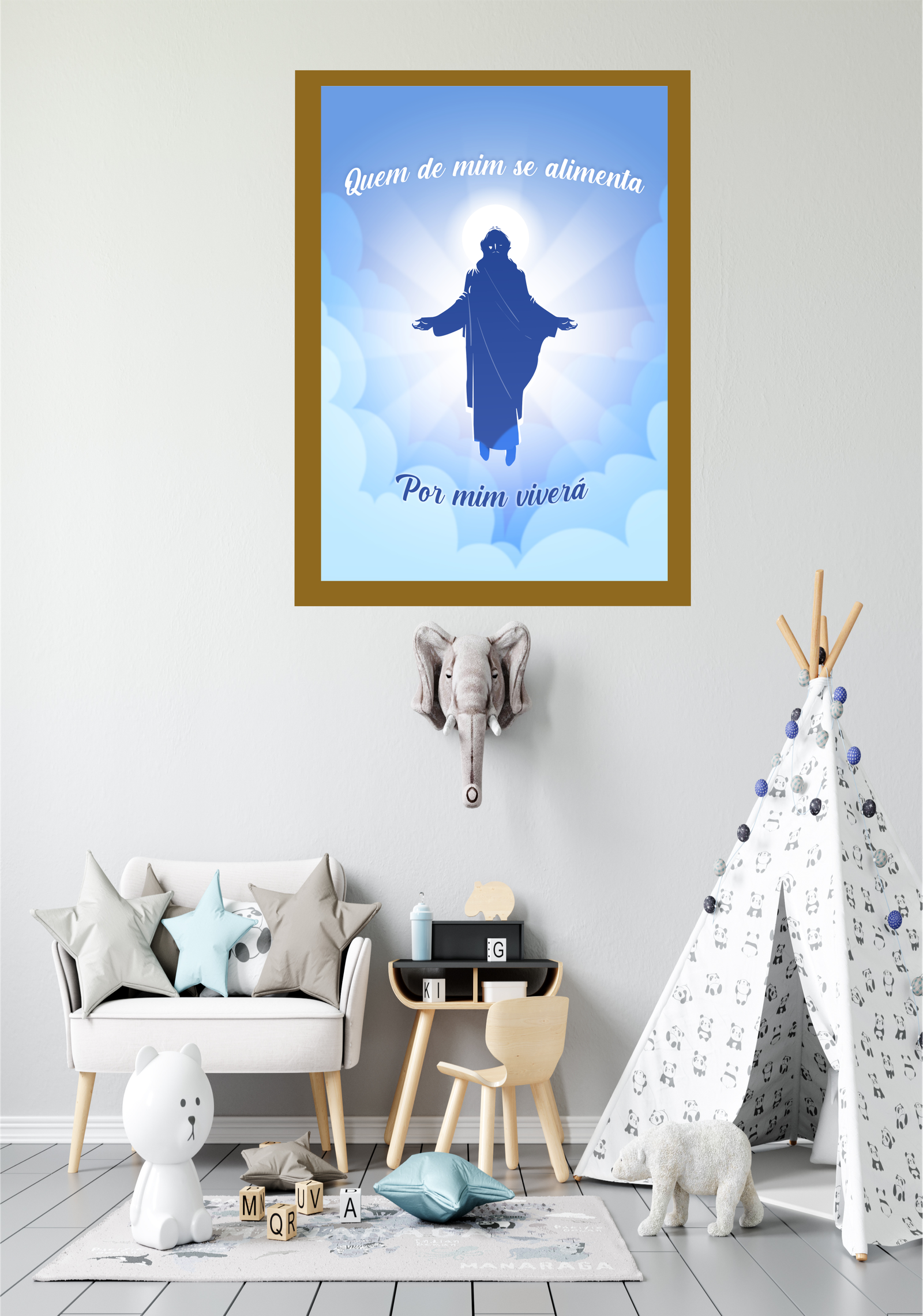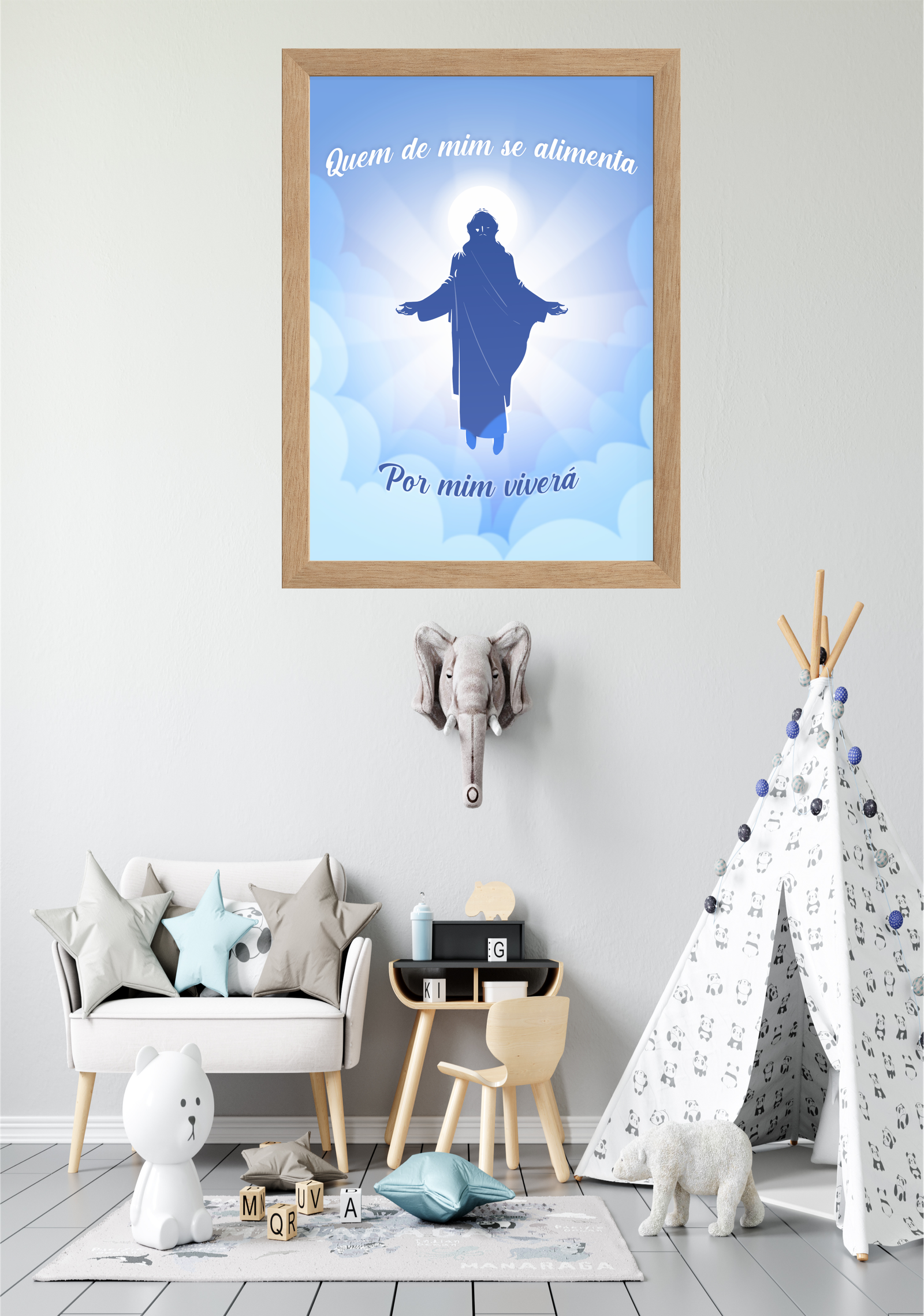Este quadro, intitulado Alimento da Alma, traz uma mensagem de profunda espiritualidade e reflexão. A imagem central apresenta uma figura envolta em luz, simbolizando a presença divina e a promessa de vida eterna para aqueles que buscam nutrir-se espiritualmente. As palavras “Quem de mim se alimenta, por mim viverá” ecoam um convite à contemplação e à busca de sentido além do material. O fundo em tons de azul claro e nuvens suaves cria uma atmosfera de serenidade e paz, ideal para espaços que buscam transmitir tranquilidade e introspecção. Colocado em um ambiente acolhedor, como uma sala de estar ou espaço de meditação, este quadro inspira a conexão com o divino e a reflexão sobre o propósito e a essência da vida. É uma peça que não apenas decora, mas também enriquece a alma e o espírito daqueles que a contemplam.