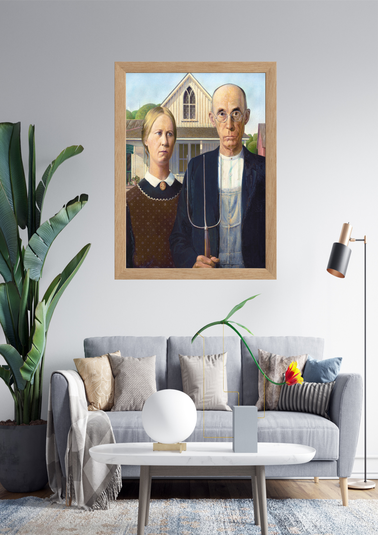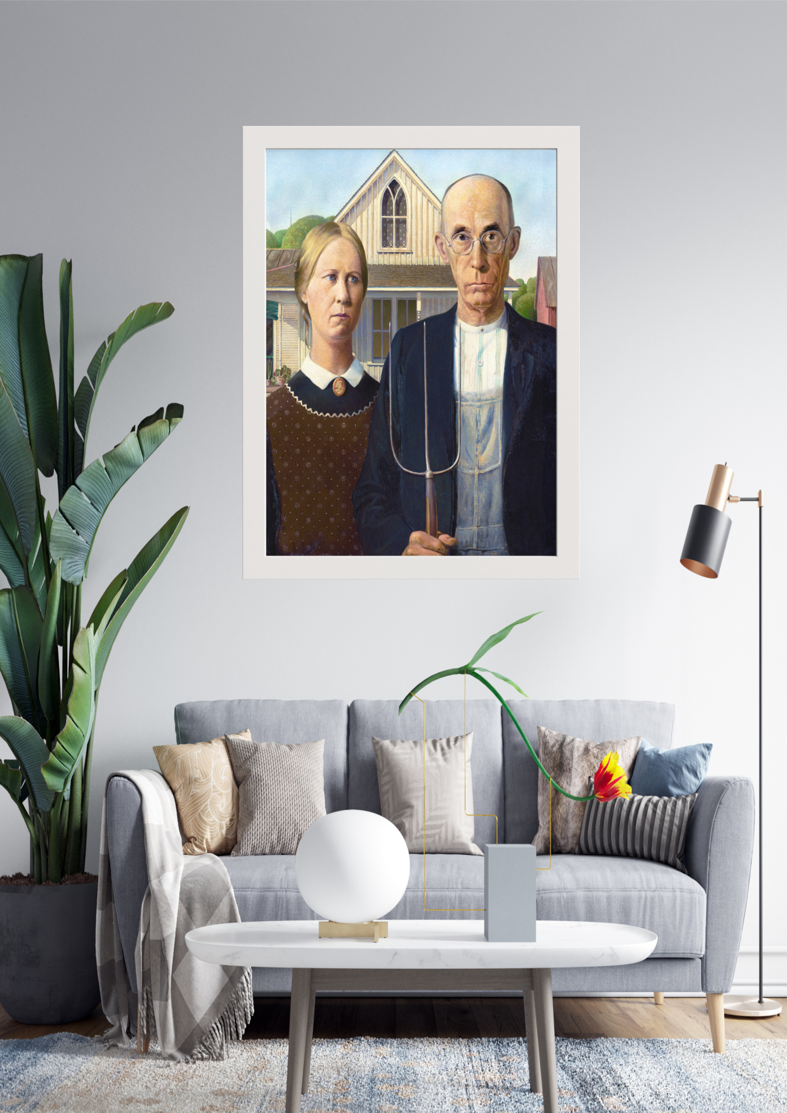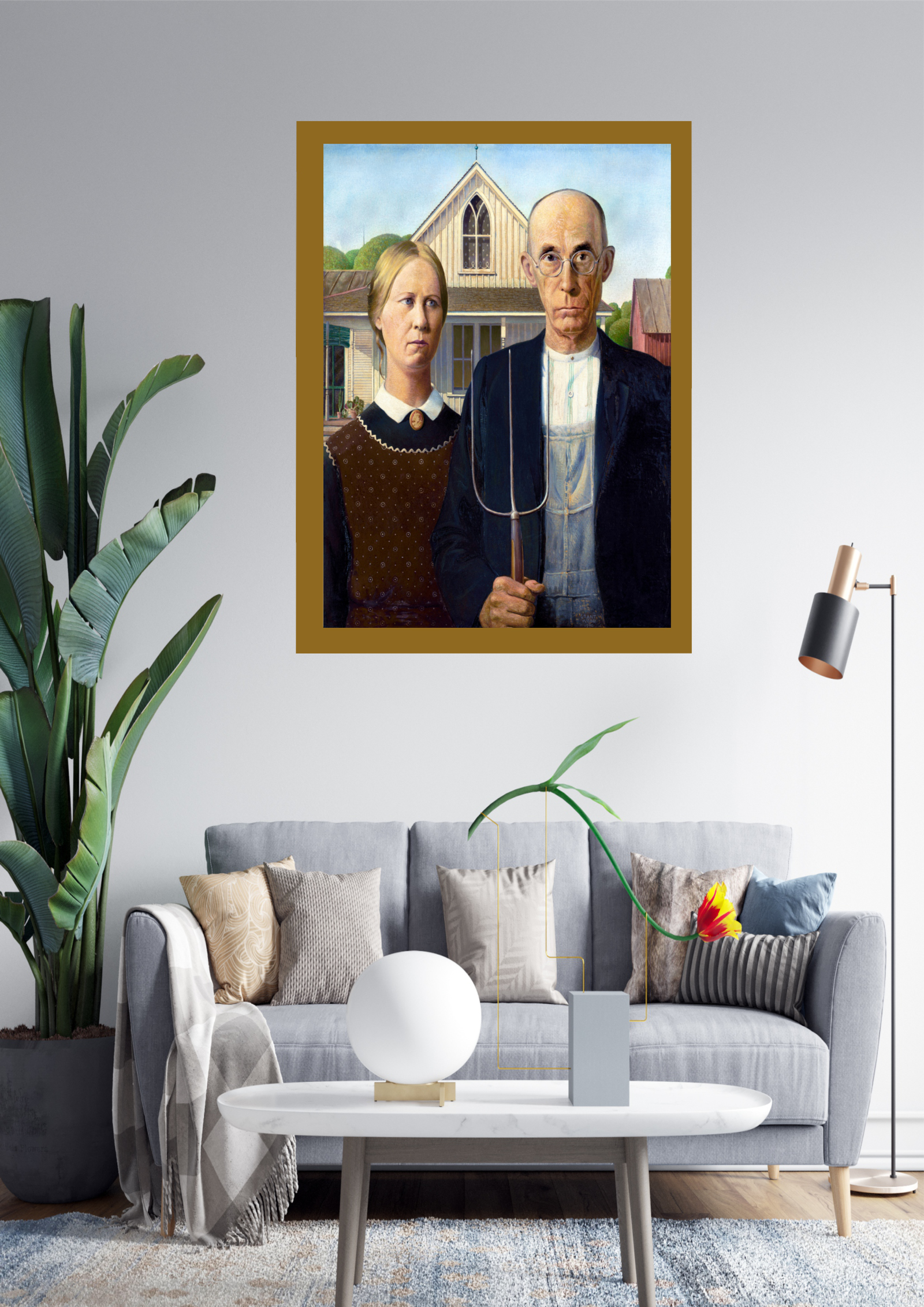 Descrição: Este quadro retrata uma cena icônica da vida rural americana, destacando um casal em frente a uma casa de estilo gótico. A expressão séria dos personagens e o uso de cores sóbrias transmitem uma sensação de solidez e tradição. A composição simétrica e a atenção aos detalhes arquitetônicos refletem a influência do realismo.