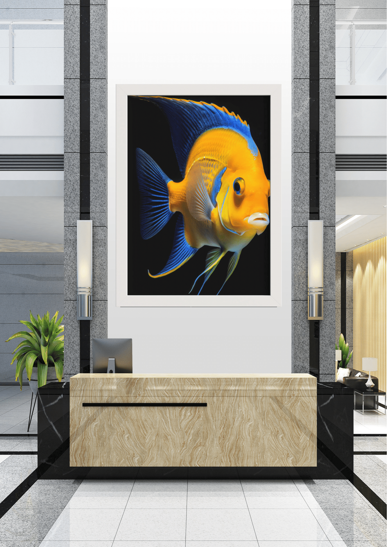 Esta peça não é apenas uma representação de um animal marinho; é uma celebração da vida subaquática, capturando a graça, a beleza e o mistério do mundo oceânico. O contraste entre as cores vivas do peixe e o ambiente corporativo moderno cria uma justaposição fascinante, trazendo um pedaço do mundo natural para o interior, e servindo como um ponto focal impressionante que certamente captará a atenção e a imaginação de todos que entrarem no espaço.