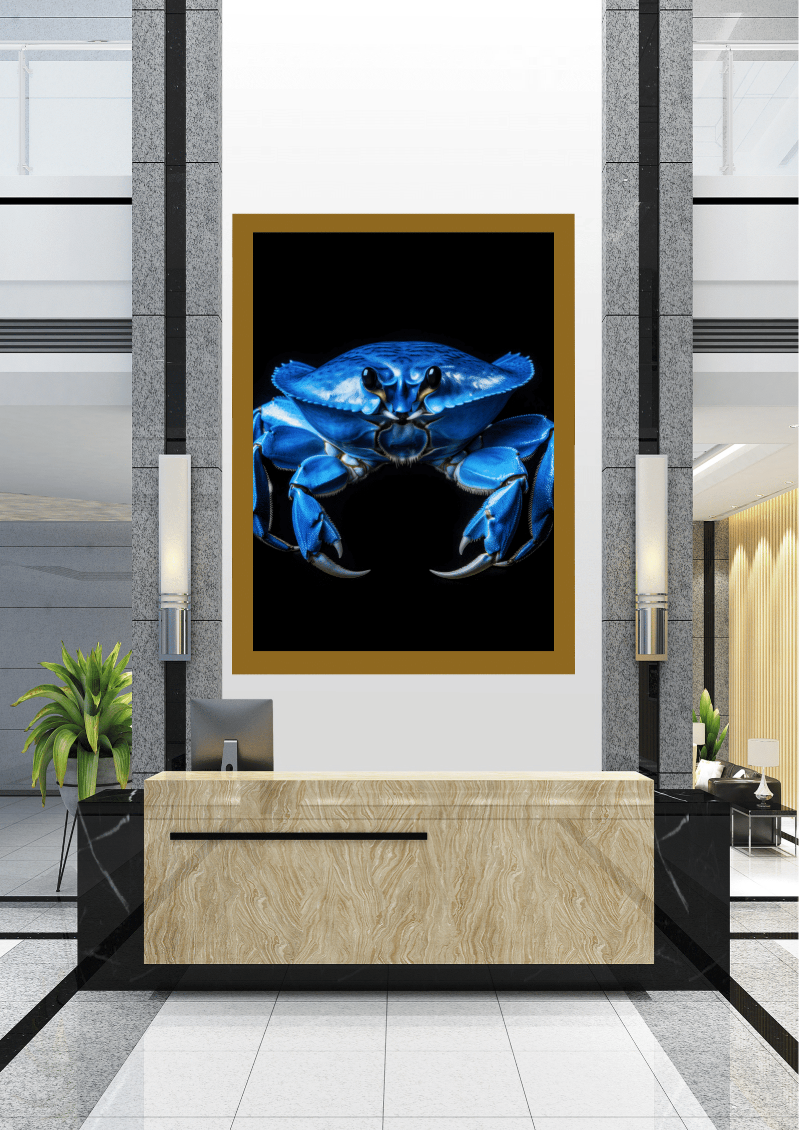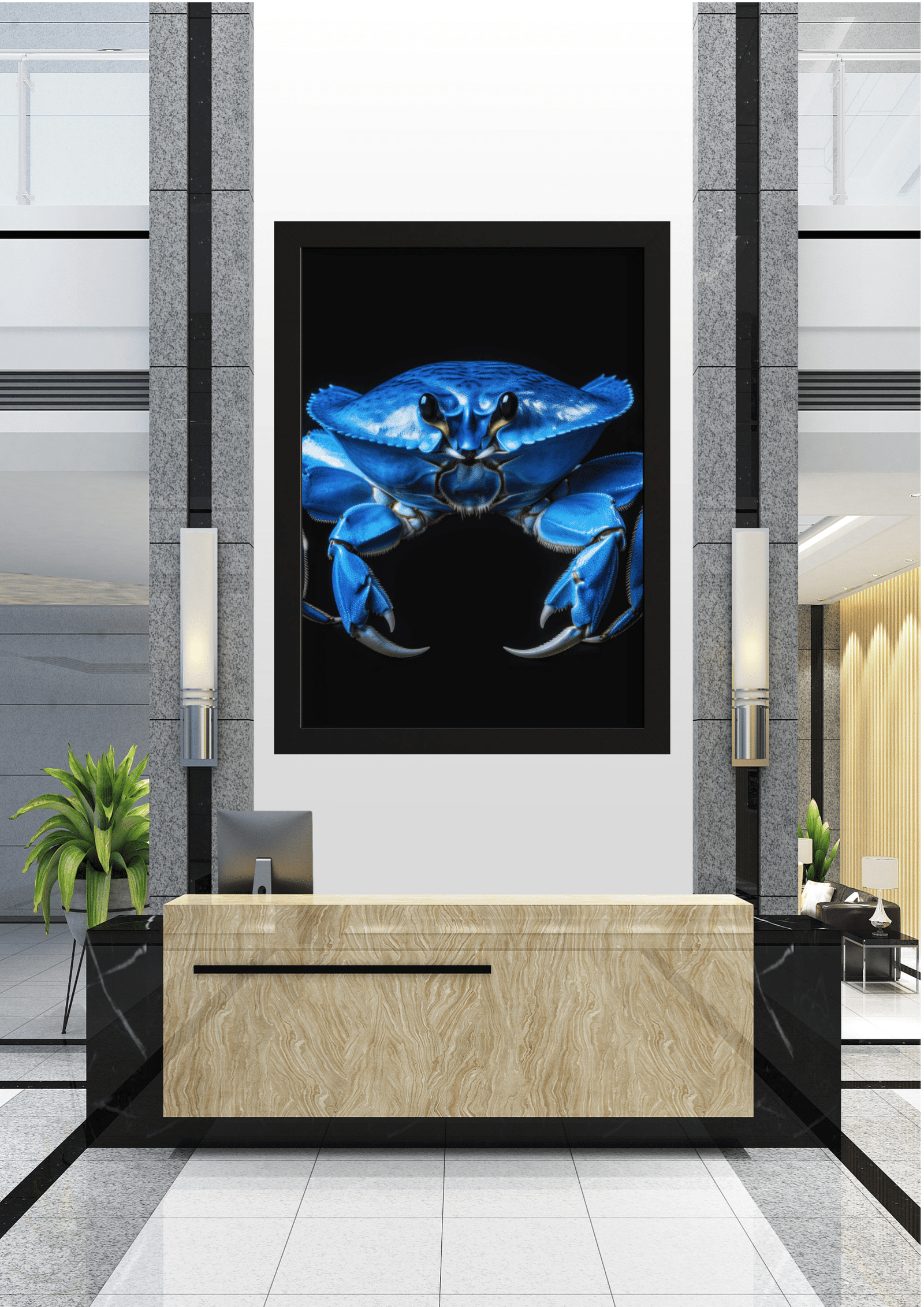No coração de um elegante e moderno saguão corporativo, uma imagem impressionante captura imediatamente a atenção. Um quadro imponente exibe a fotografia vívida de um caranguejo azul brilhante contra um fundo negro profundo, criando um contraste dramático e hipnotizante.