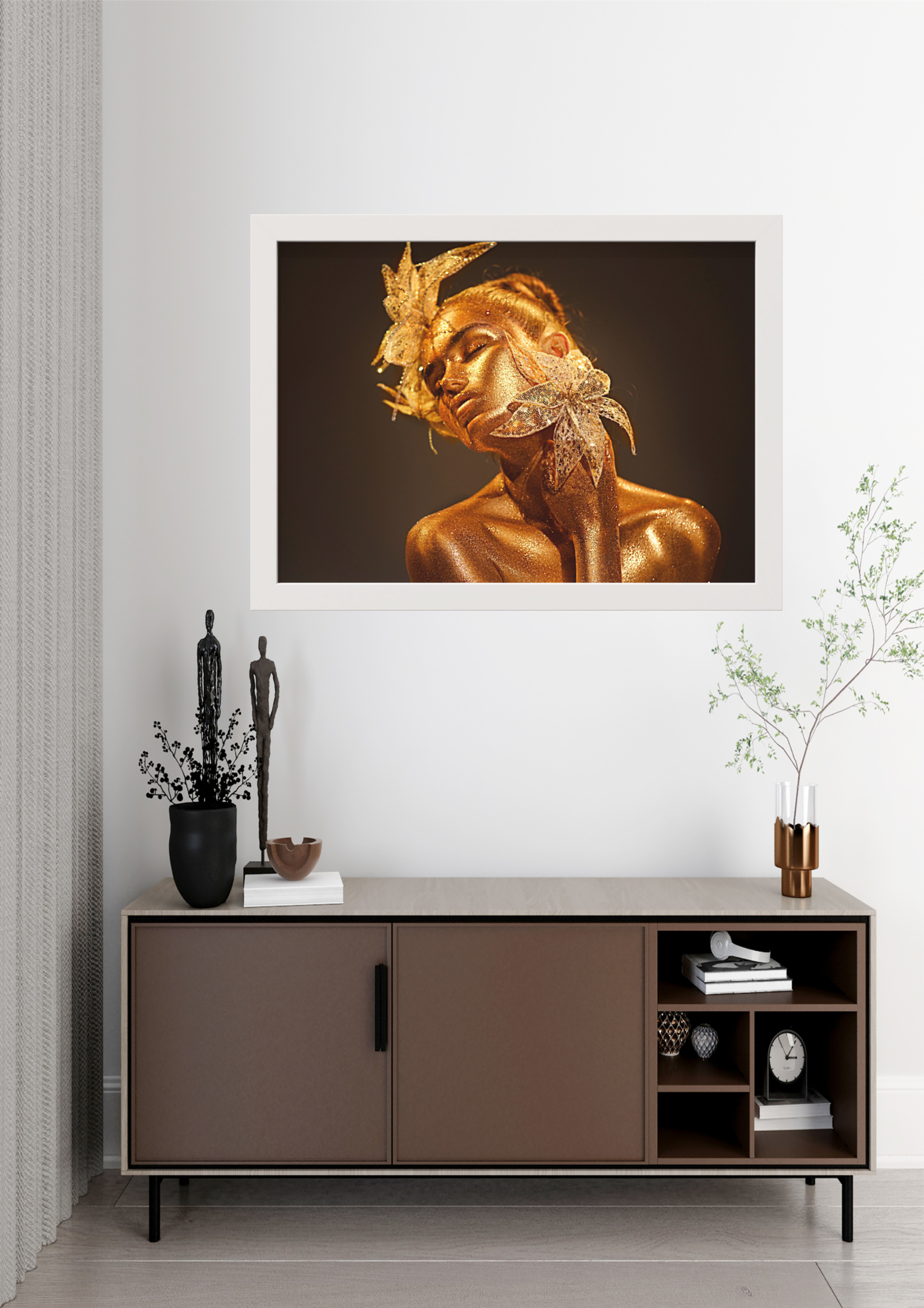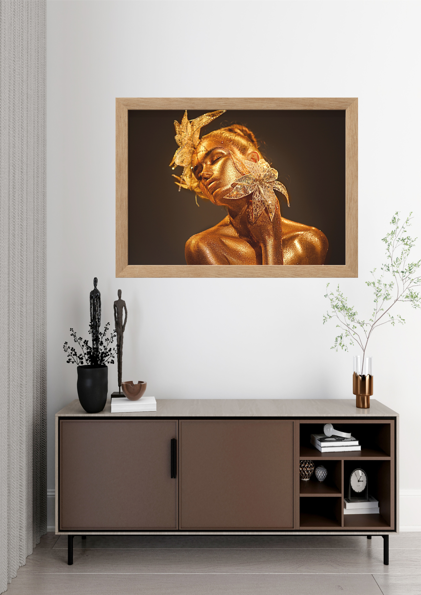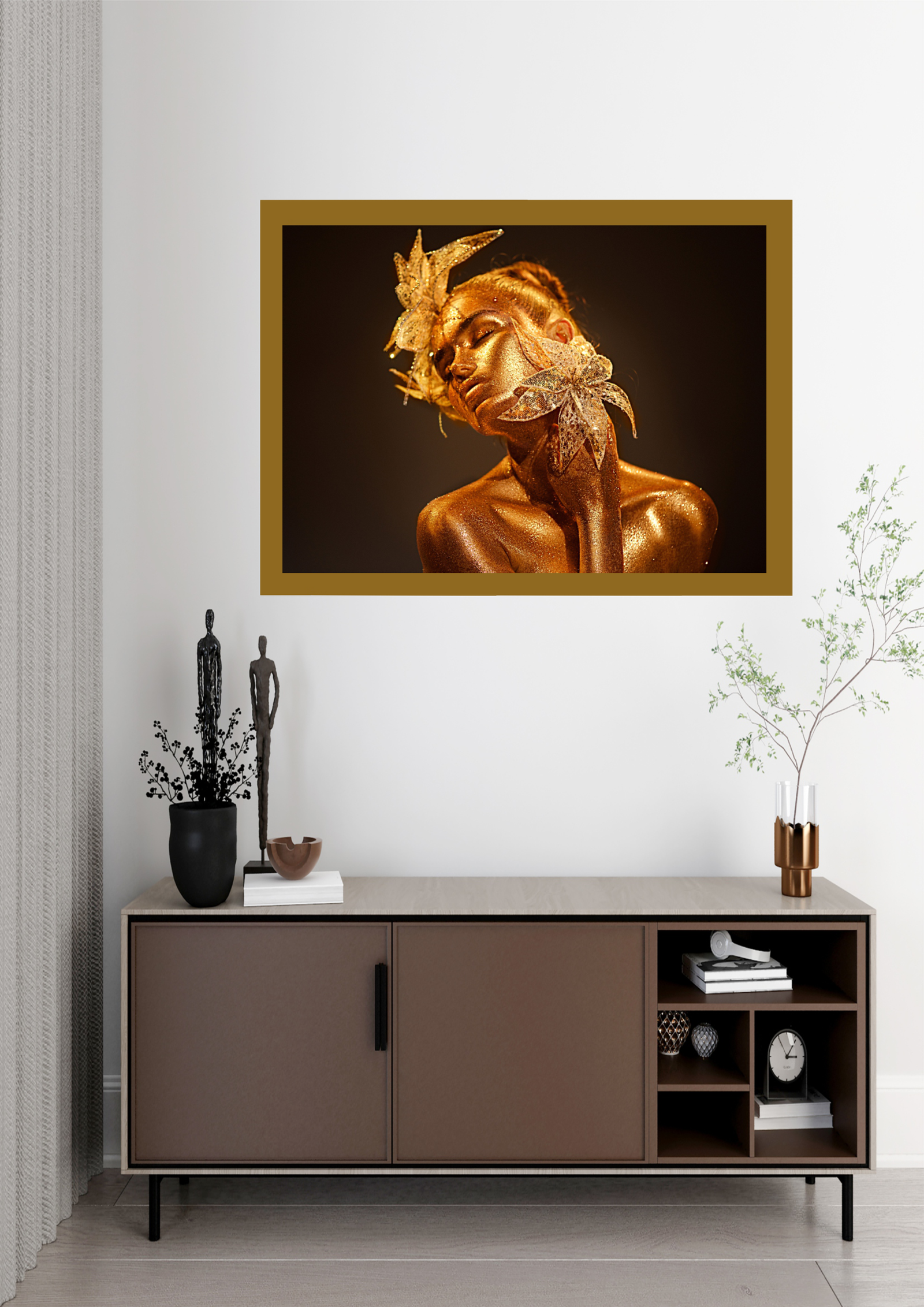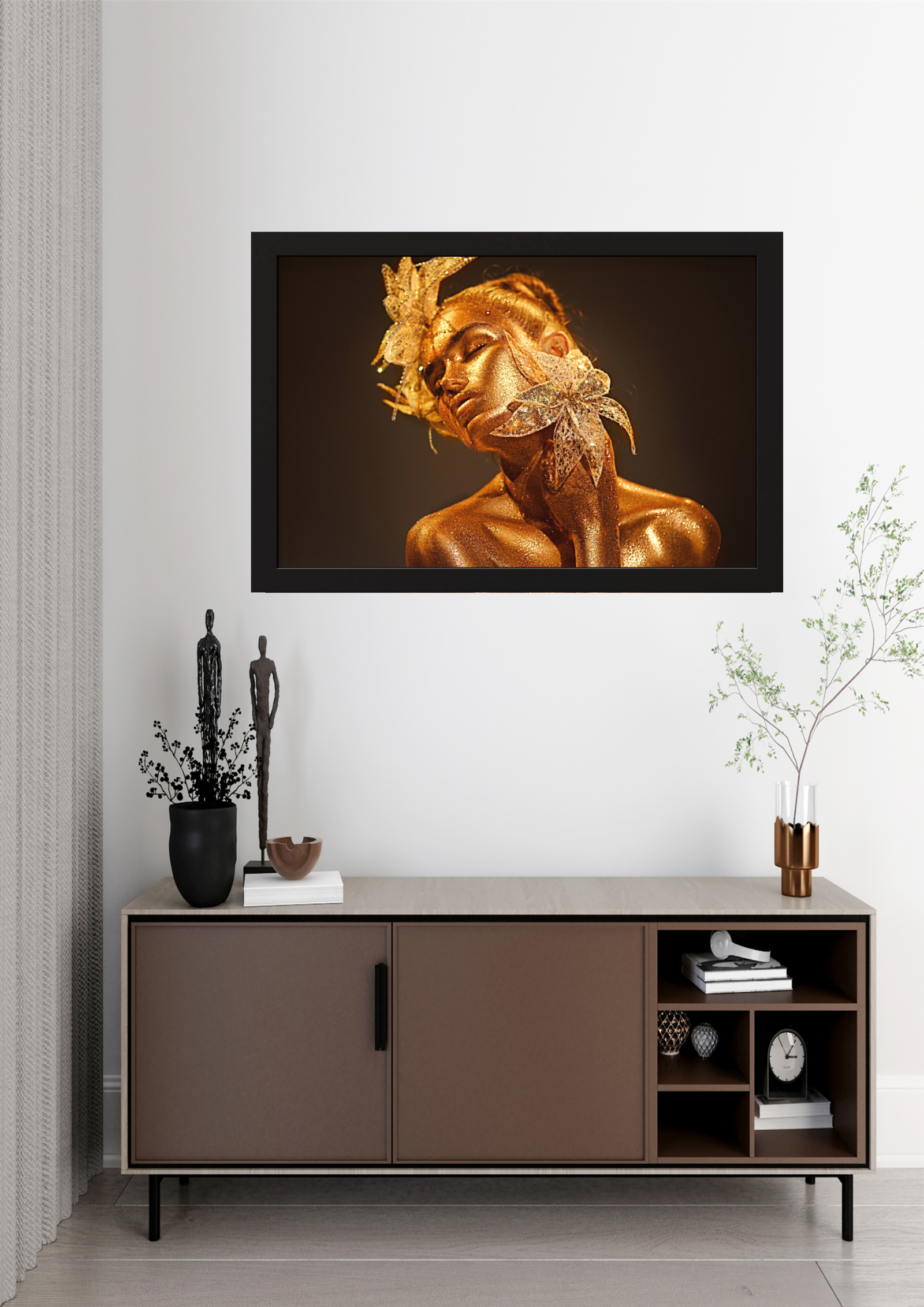 O quadro intitulado “Brilho Dourado” é uma celebração da beleza e da elegância feminina, capturando um momento de pura serenidade e sofisticação. A figura central, adornada com um brilho dourado cintilante, exala uma aura de luxo e tranquilidade. As flores delicadamente posicionadas ao redor de seu rosto não apenas complementam sua beleza, mas também simbolizam a harmonia entre a natureza e a arte. O uso magistral da luz e sombra destaca as curvas suaves e a expressão contemplativa da figura, criando uma sensação de profundidade e introspecção. Este quadro é uma fusão de elementos clássicos e modernos, onde a simplicidade do fundo escuro contrasta com a riqueza dos detalhes dourados, proporcionando um equilíbrio visual perfeito. Ideal para ambientes que buscam inspiração e um toque de glamour, “Brilho Dourado” transforma qualquer espaço em um santuário de beleza e contemplação. A presença desta obra de arte em uma sala de estar ou escritório não só eleva a estética do ambiente, mas também convida à reflexão sobre a beleza intrínseca e a complexidade da forma humana. Este quadro é mais do que uma simples peça decorativa; é uma declaração de estilo e uma homenagem à beleza eterna. Ao olhar para ele, somos transportados para um mundo onde a arte e a natureza se encontram em perfeita harmonia, lembrando-nos do poder transformador da beleza.