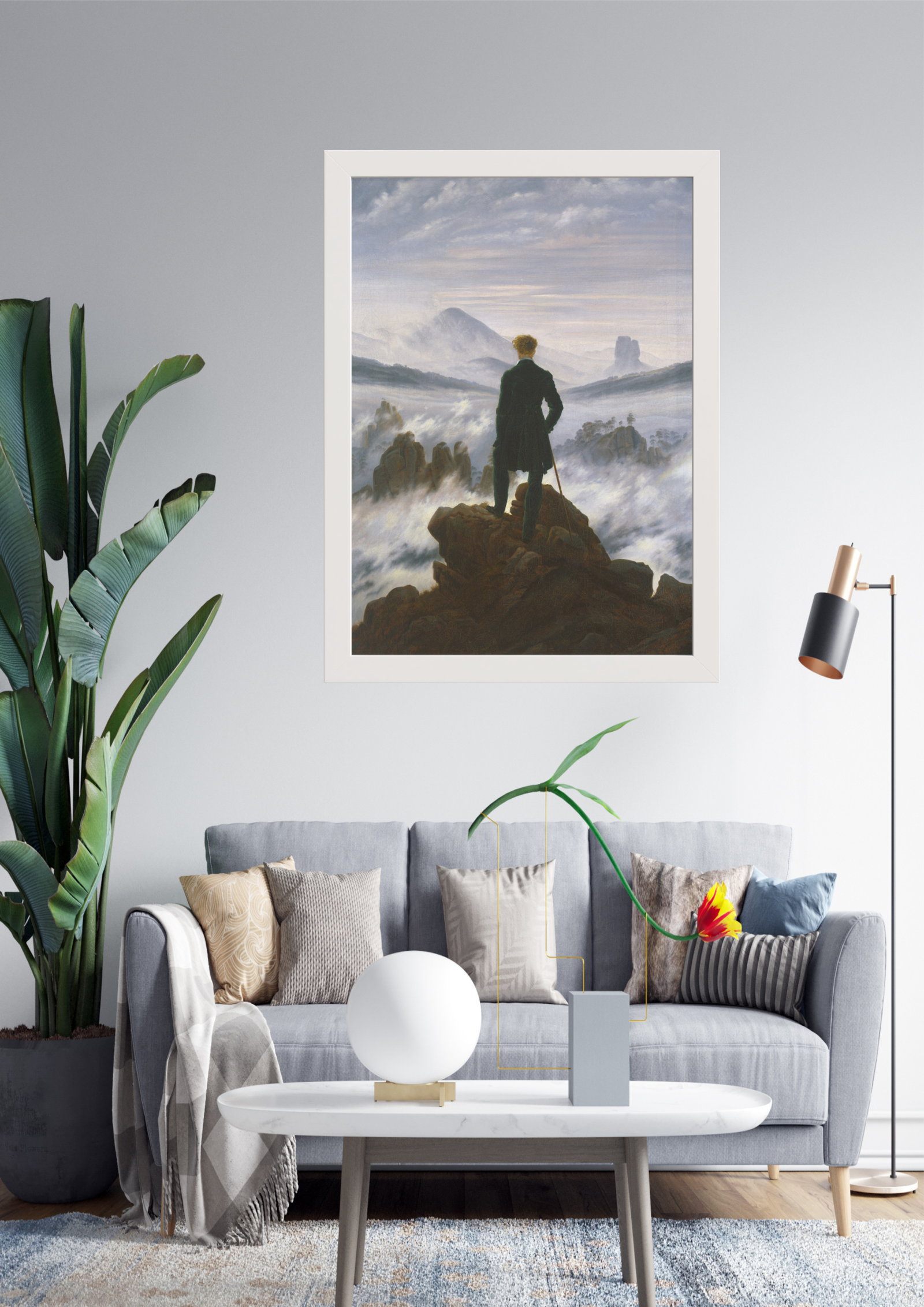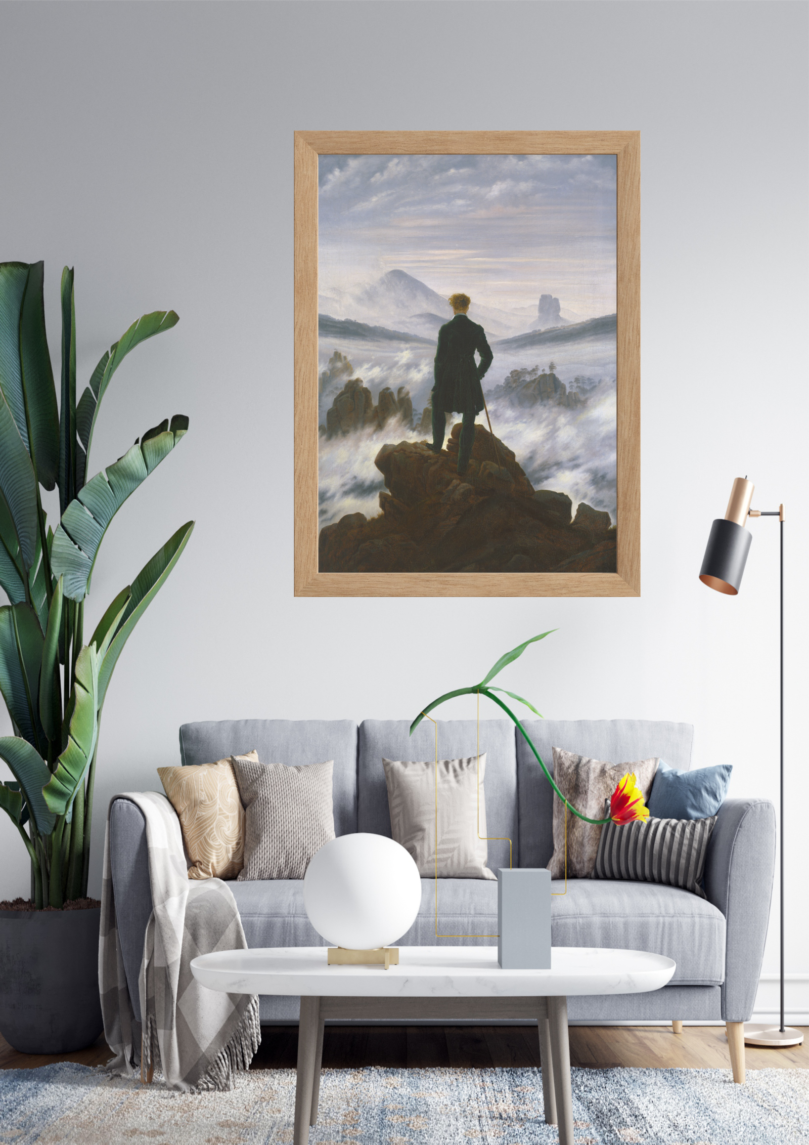 Este quadro captura a essência da aventura e contemplação, retratando uma figura solitária em meio a uma paisagem nebulosa e montanhosa. A cena inspira reflexão e admiração pela vastidão e beleza da natureza.
