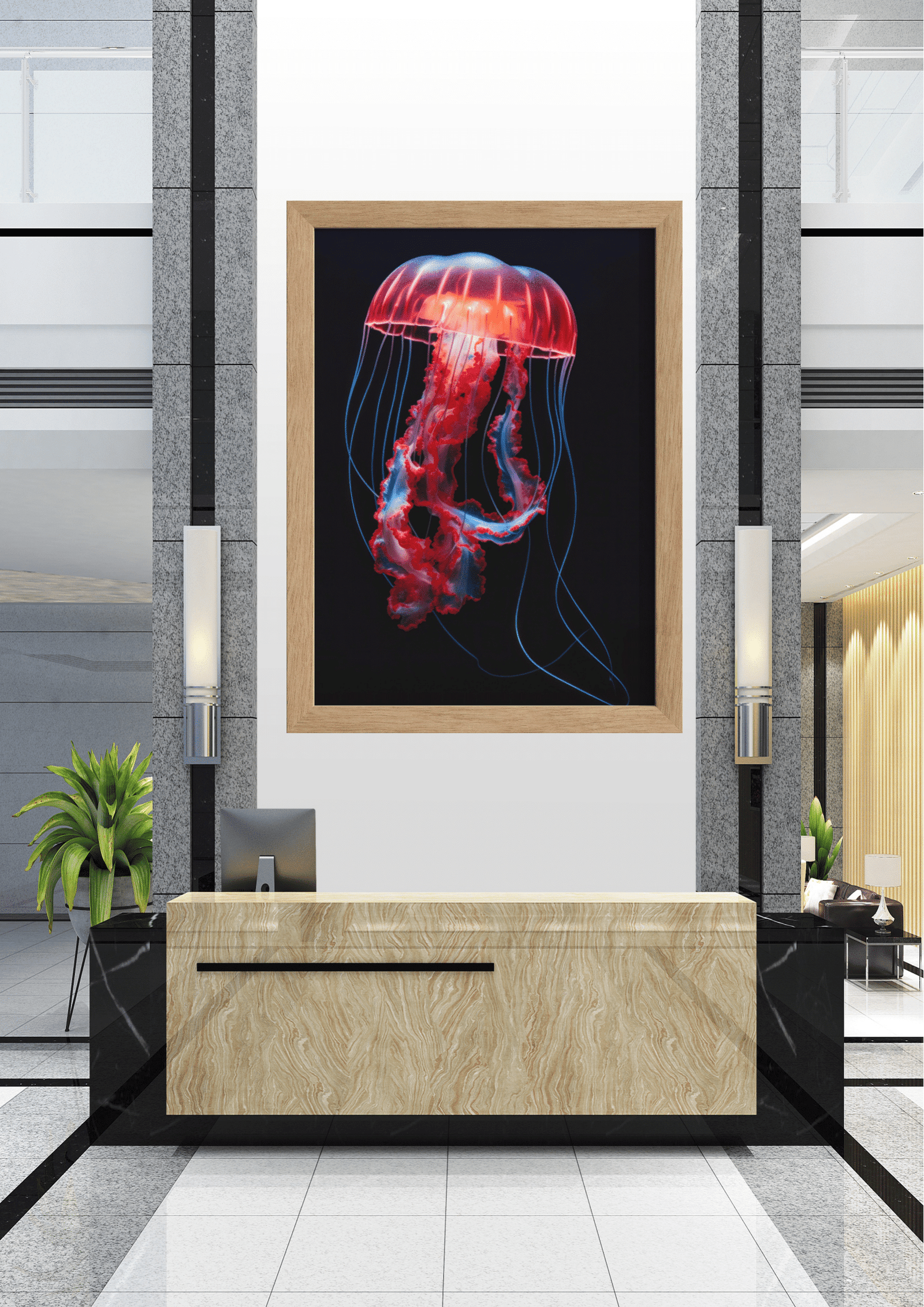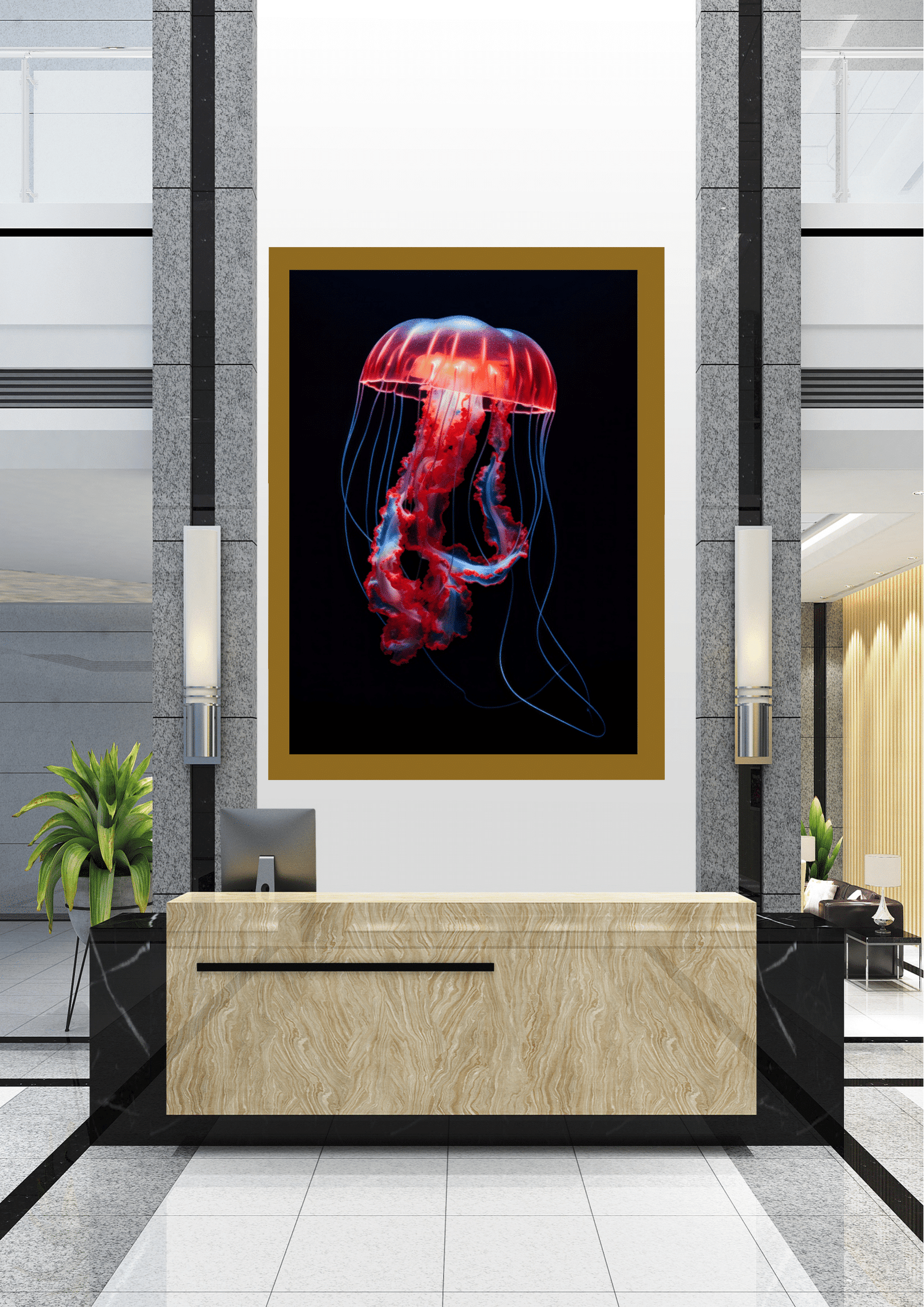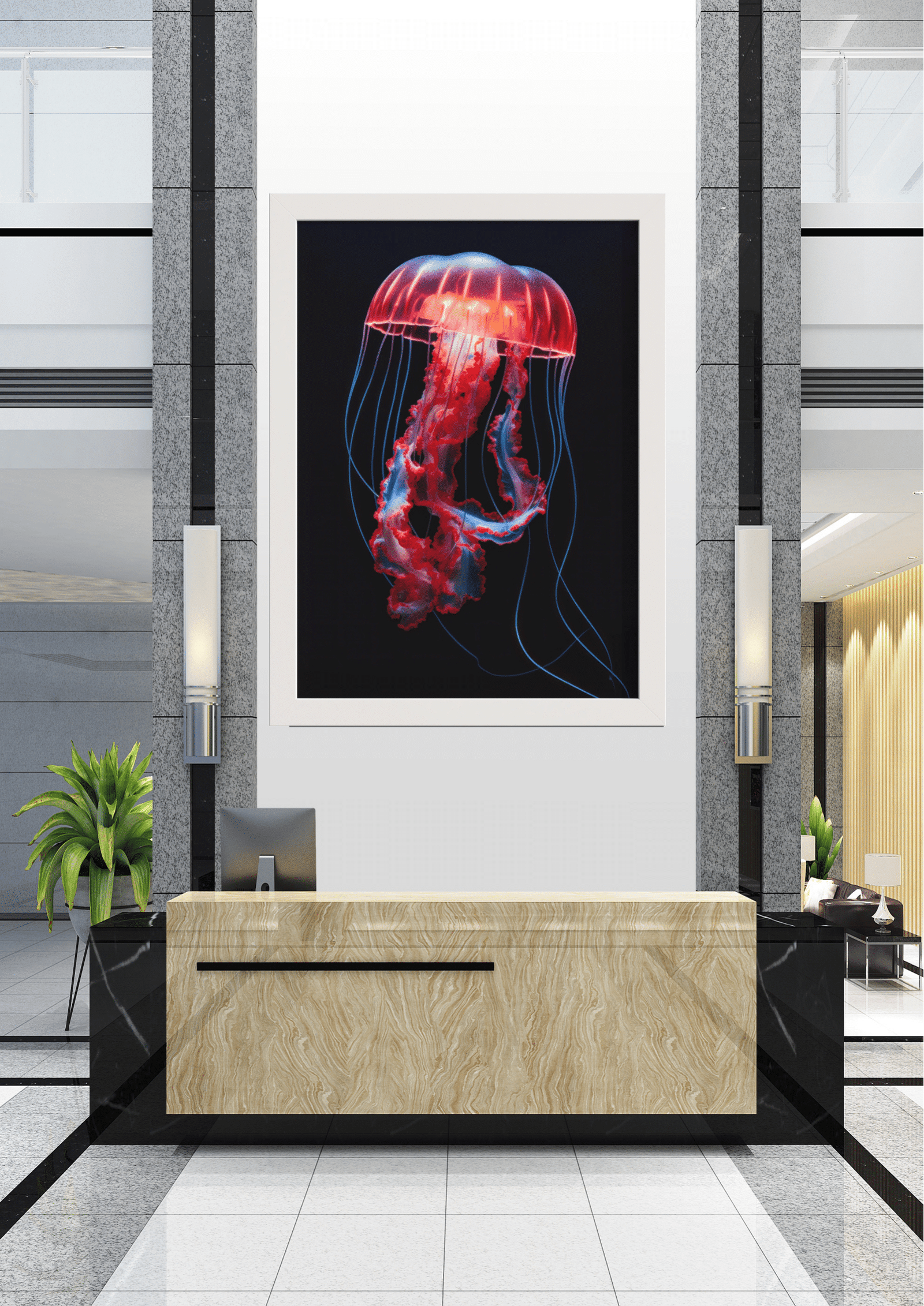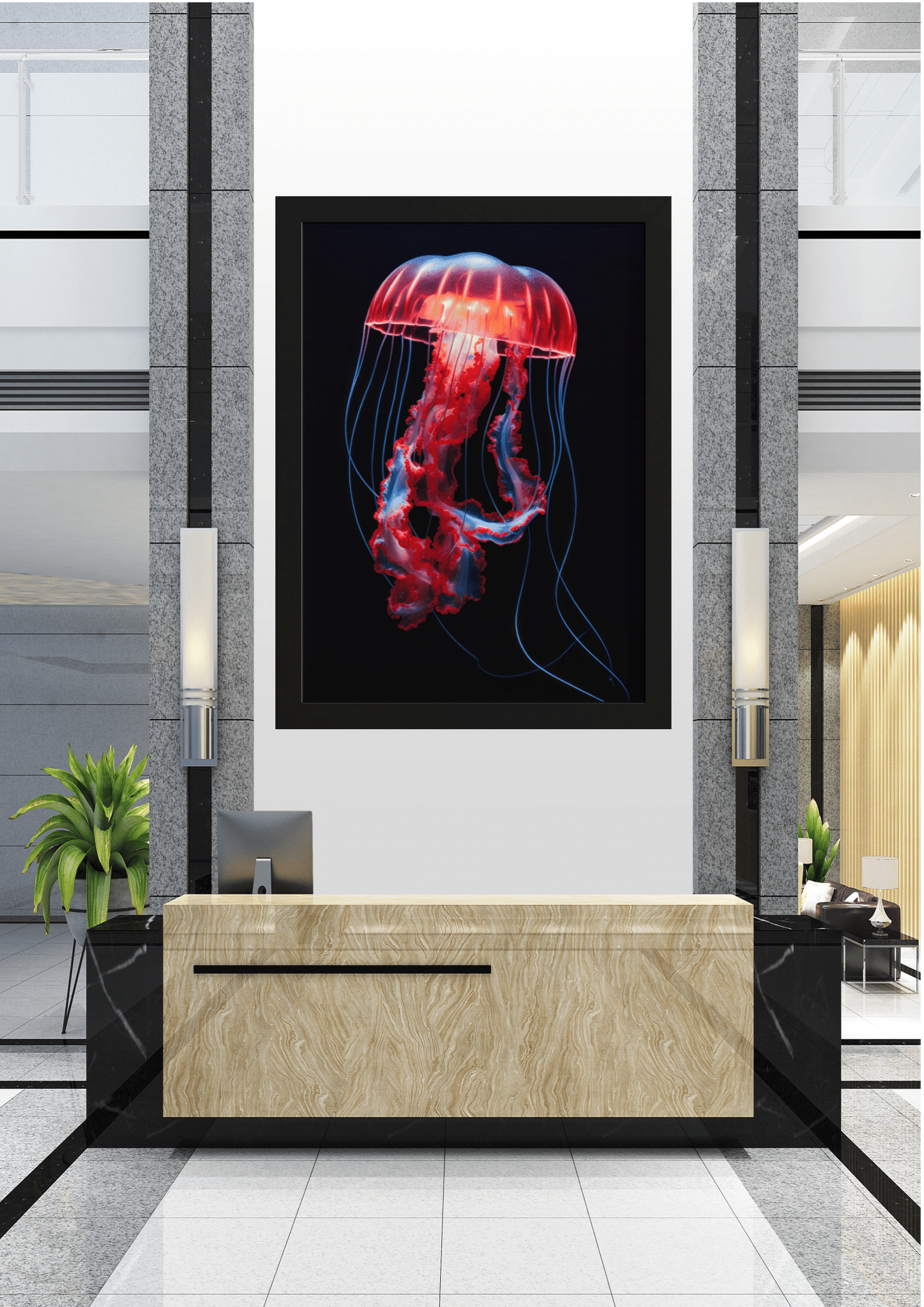 A imagem está emoldurada em uma moldura preta simples, que complementa o fundo escuro e dirige toda a atenção para o sujeito luminoso. O quadro está pendurado em uma parede branca em um ambiente moderno e minimalista, possivelmente um lobby ou recepção, criando um ponto focal dramático no espaço.