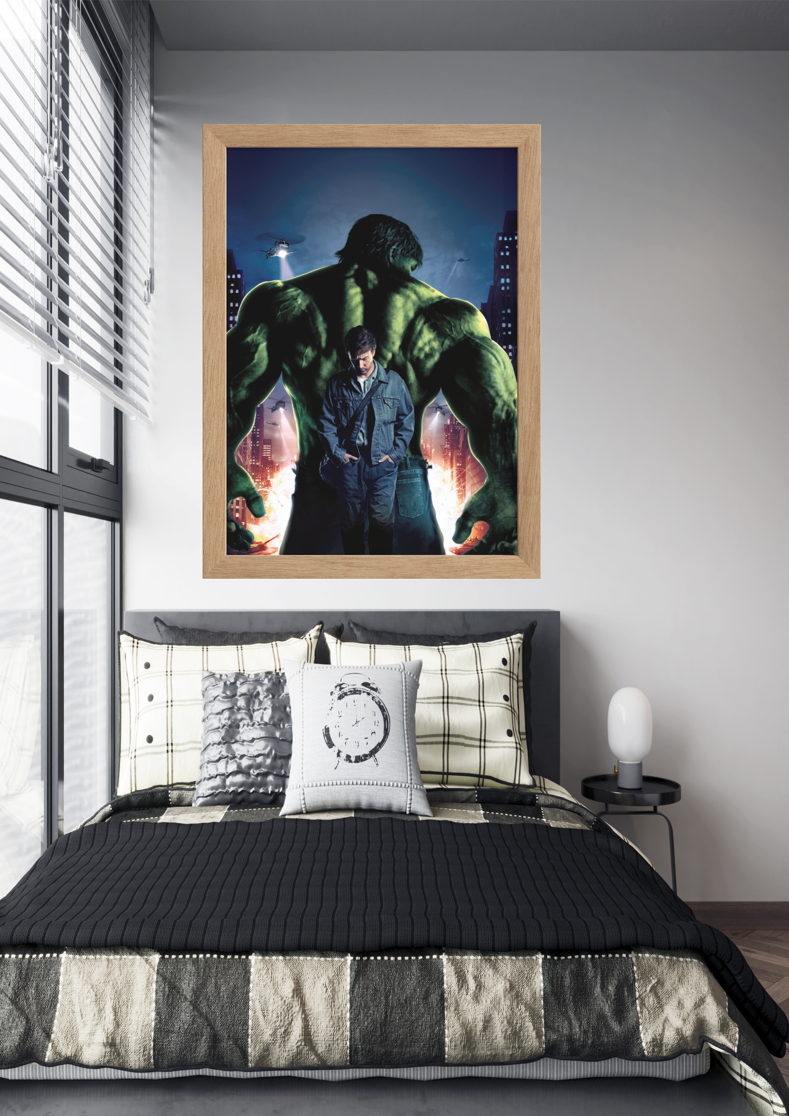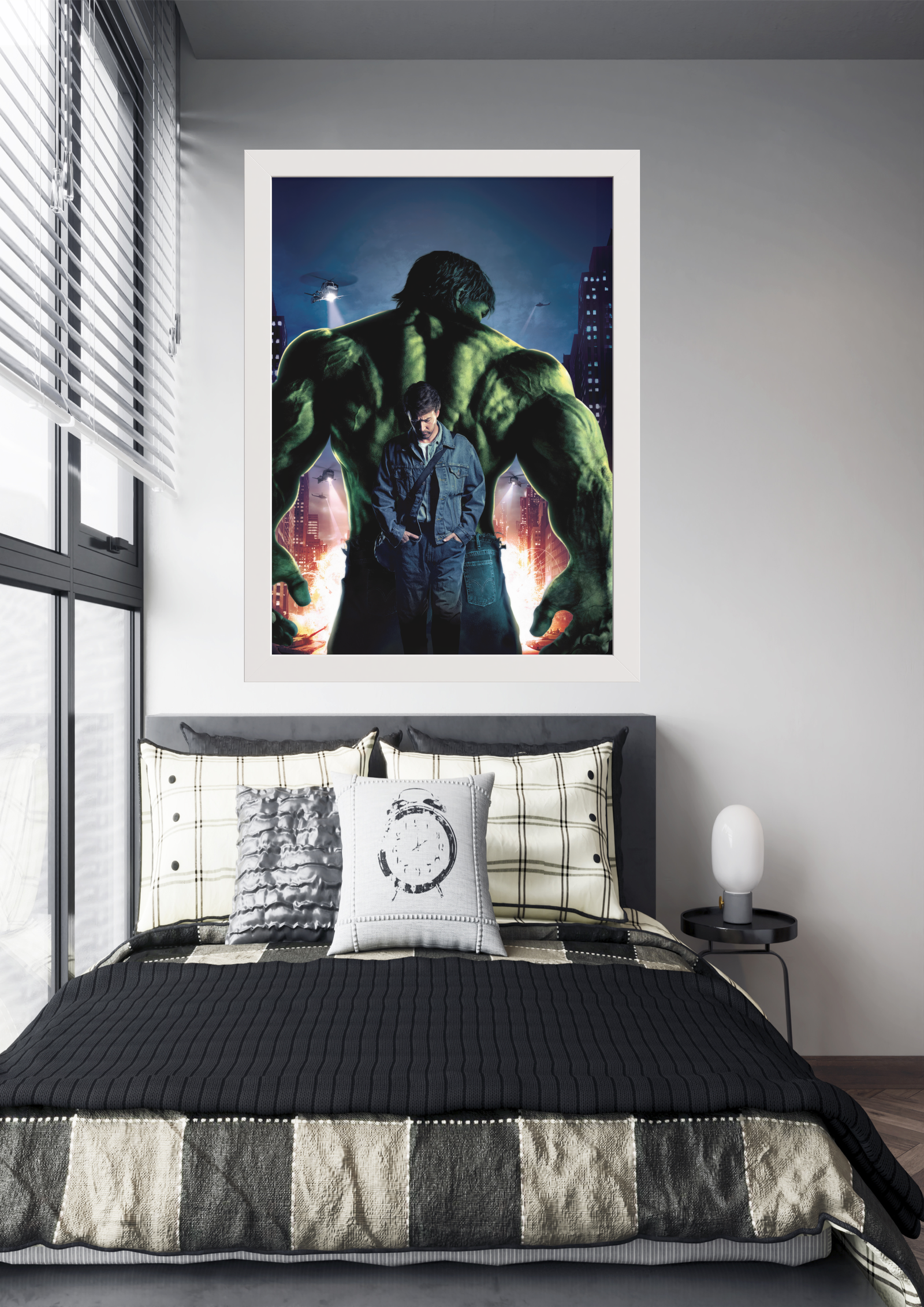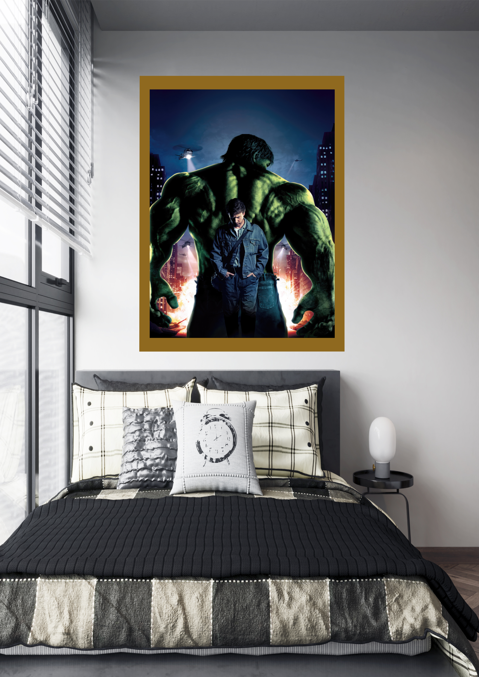 A imagem retrata a complexa dualidade de um herói icônico, capturada em um pôster imponente que adorna a parede de um quarto moderno. No centro, destaca-se a figura de um homem em conflito, simbolizando a batalha interna entre sua humanidade e seu alter ego poderoso. Atrás dele, a presença robusta e imponente do gigante verde, que representa força e destruição, contrasta com a vulnerabilidade do homem à frente. O cenário urbano ao fundo, com helicópteros e edifícios, sugere uma atmosfera de tensão e ação iminente. A composição da imagem, com suas cores vibrantes e detalhes marcantes, não apenas embeleza o ambiente, mas também provoca reflexão sobre a natureza humana e os desafios de equilibrar diferentes aspectos de si mesmo. Este pôster, posicionado sobre uma cama aconchegante, adiciona um toque de drama e profundidade ao espaço, convidando o observador a explorar a narrativa visual e emocional que ele oferece.
