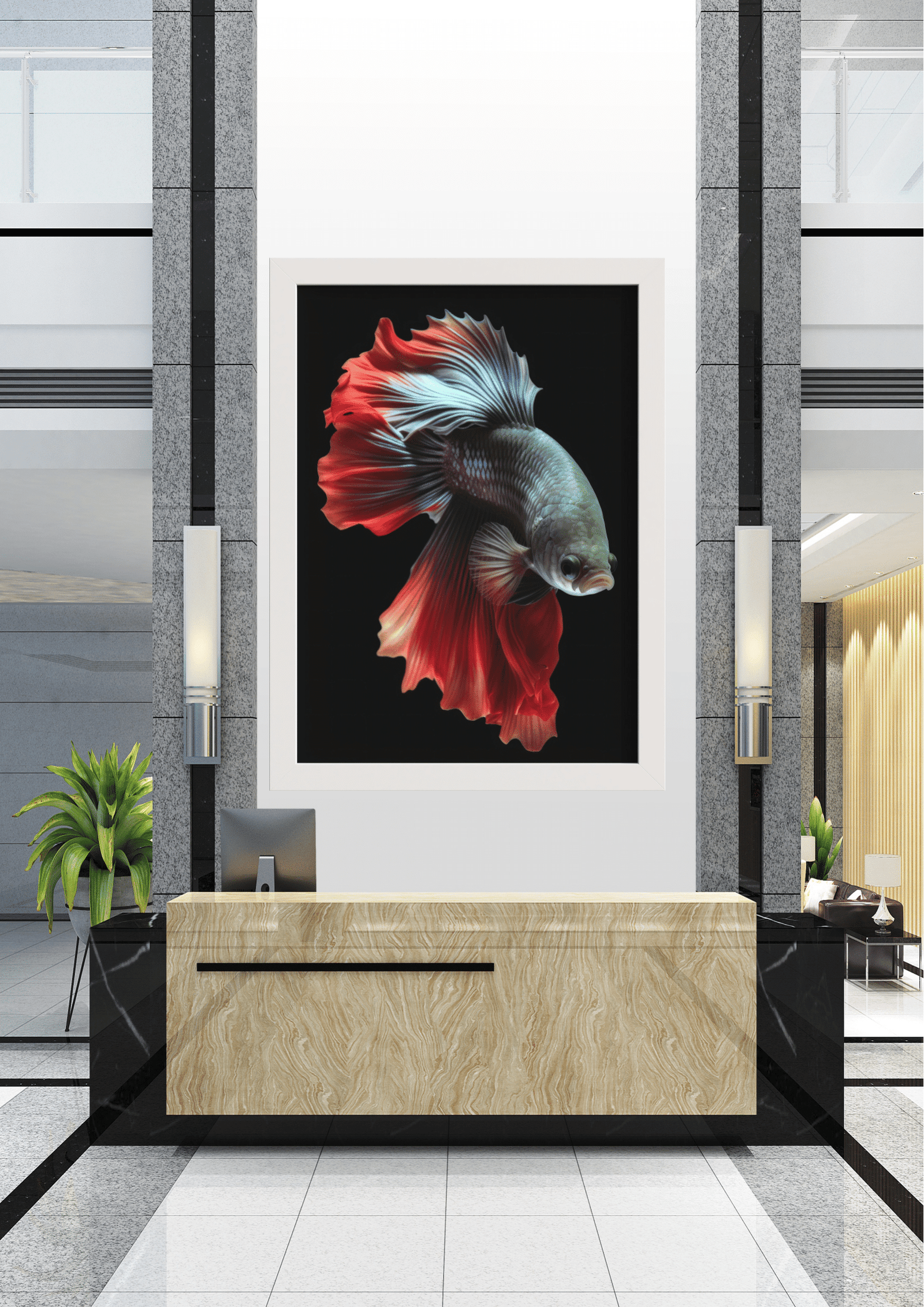 O quadro está estrategicamente posicionado em um ambiente moderno e minimalista, ocupando uma posição central em uma parede branca entre duas colunas de granito. O contraste entre a imagem vibrante do peixe e o ambiente clean ao seu redor cria um ponto focal poderoso no espaço.