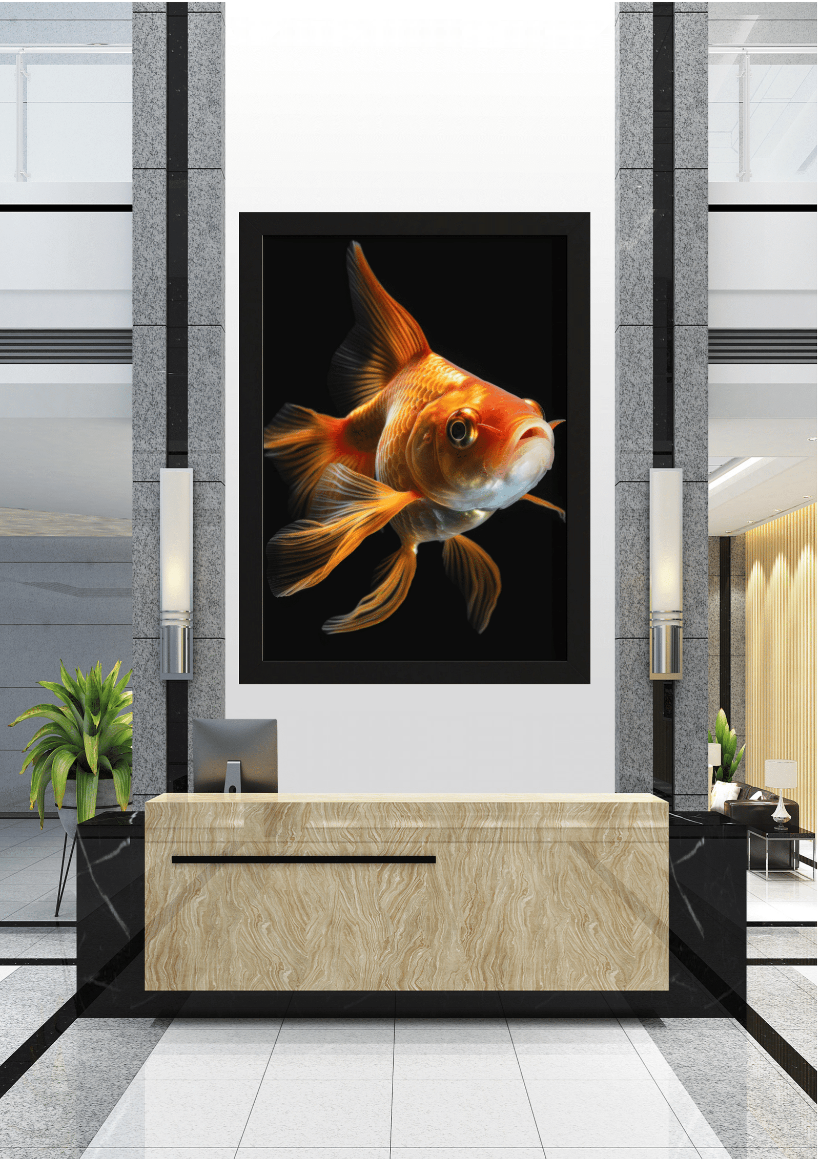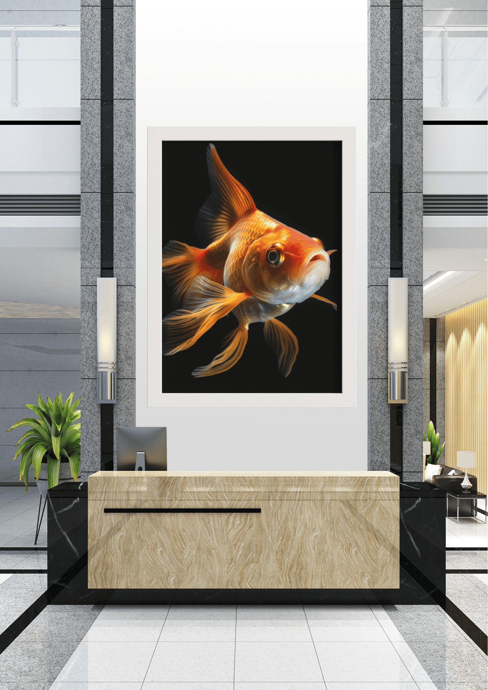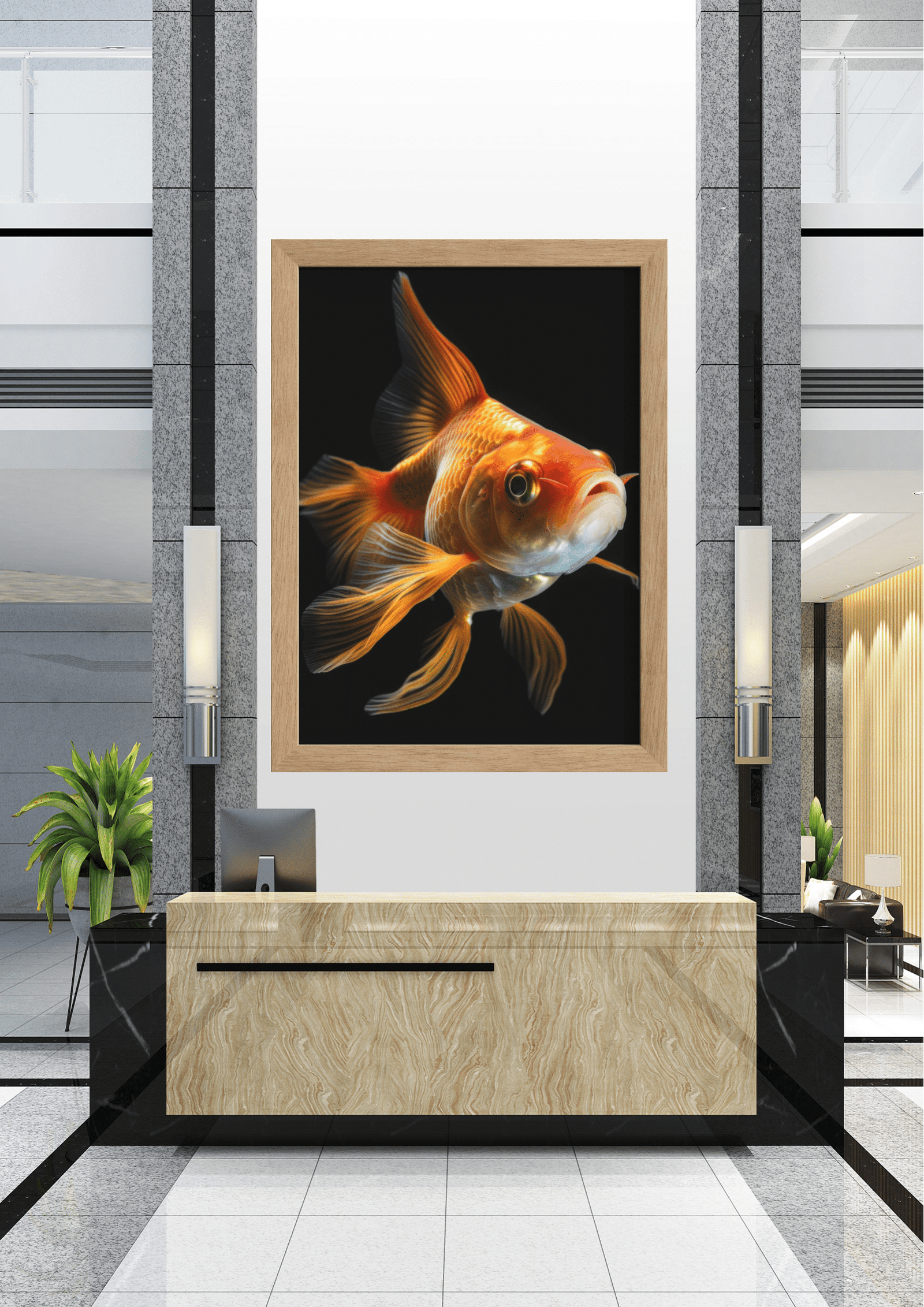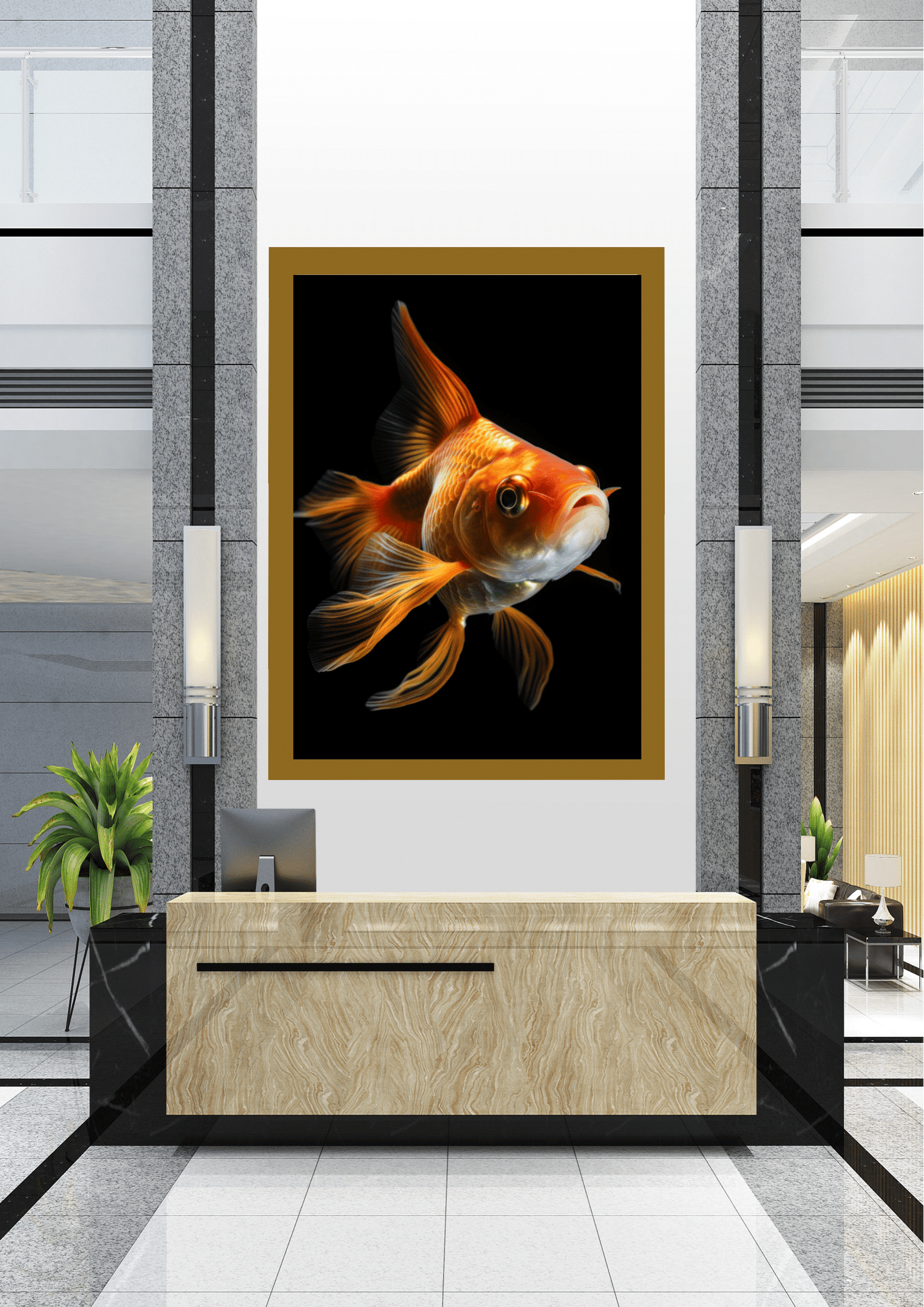 Esta imagem apresenta uma composição impressionante que combina arquitetura moderna com arte natural. No centro da cena, um quadro imponente exibe a fotografia de um peixe dourado vibrante contra um fundo preto profundo. O peixe, capturado em detalhes extraordinários, parece quase tridimensional, com suas escamas douradas e laranja brilhando intensamente.