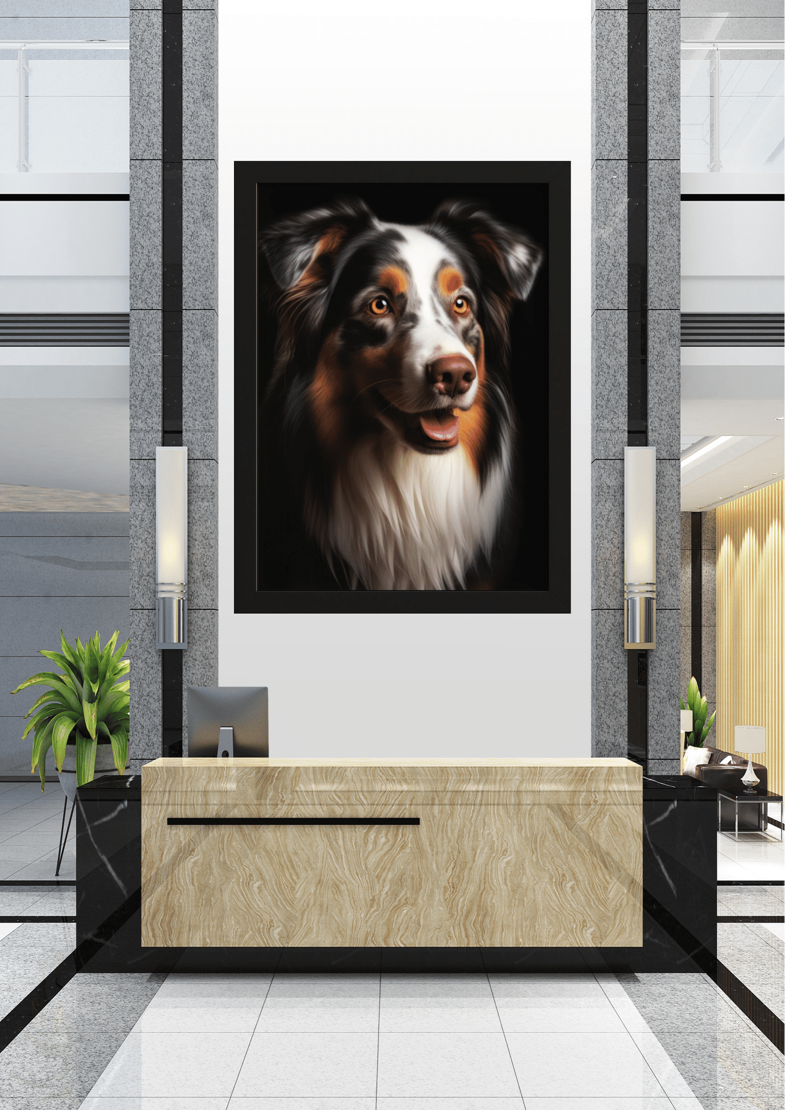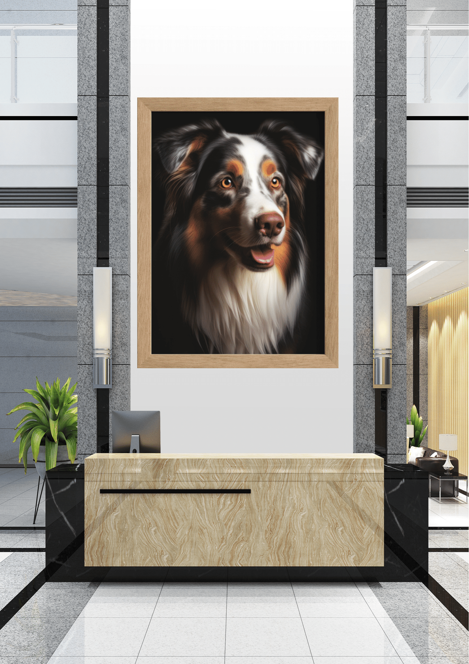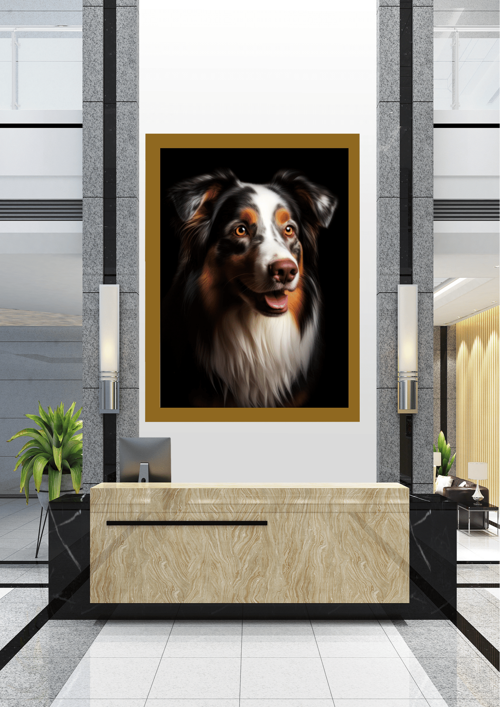 A imagem retrata uma recepção moderna e sofisticada, onde o destaque é um imponente retrato de um cão de pelagem tricolor. O quadro, estrategicamente posicionado atrás do balcão de atendimento, transmite uma sensação de acolhimento e alegria. A escolha do retrato canino reflete um ambiente amigável e descontraído, ideal para recepcionar visitantes com um toque de personalidade e charme. As linhas retas e o acabamento em mármore do balcão contrastam harmoniosamente com a suavidade do olhar do cão, criando um equilíbrio entre o moderno e o acolhedor. As plantas verdes ao lado do balcão acrescentam um elemento natural, complementando a atmosfera serena do espaço. A iluminação suave realça a textura das paredes e do piso, enquanto o retrato do cão se destaca como o ponto focal, simbolizando lealdade e companheirismo. Este ambiente cuidadosamente planejado não apenas impressiona visualmente, mas também convida a uma experiência de recepção calorosa e inesquecível.