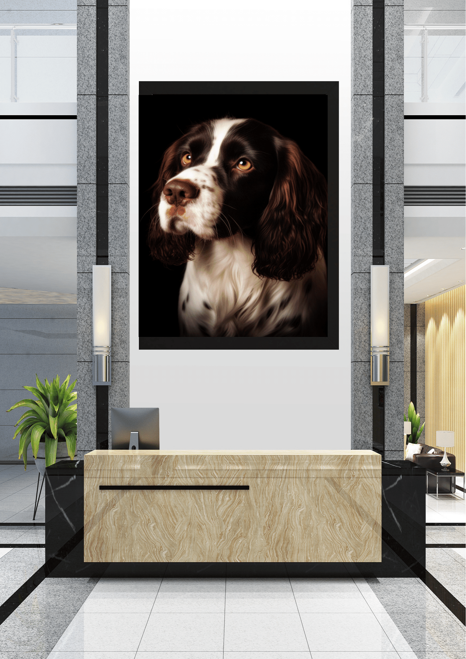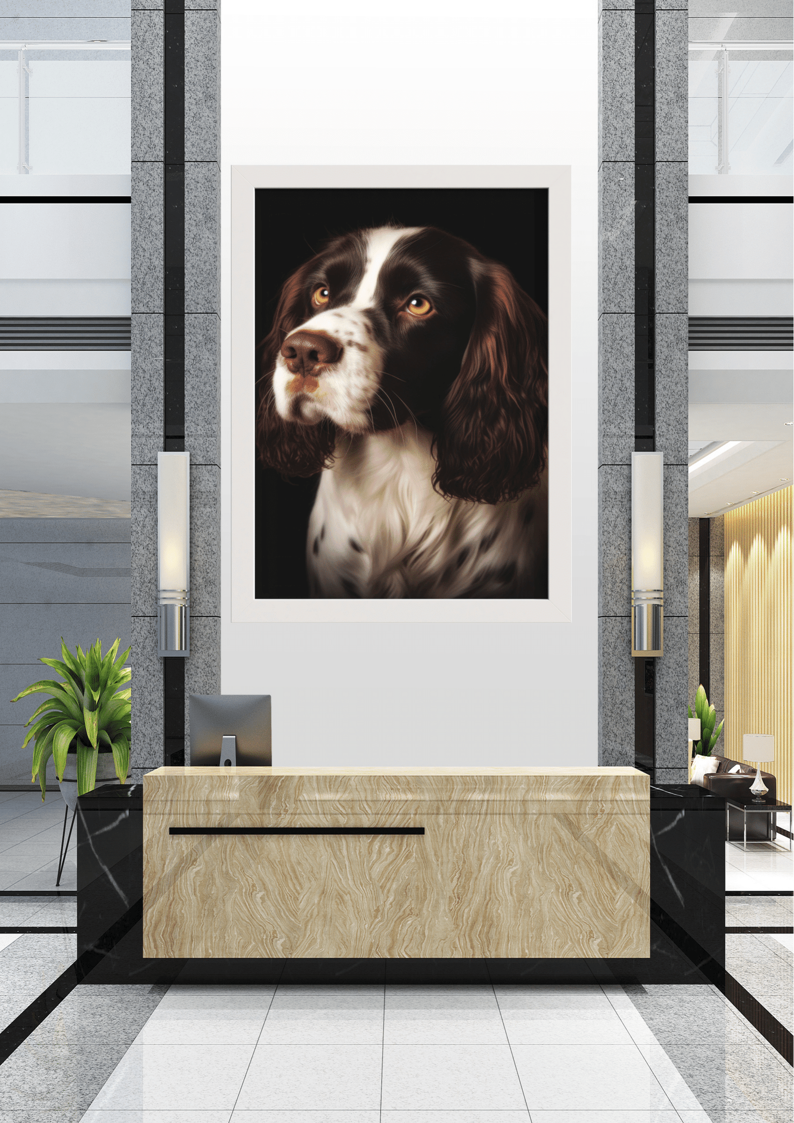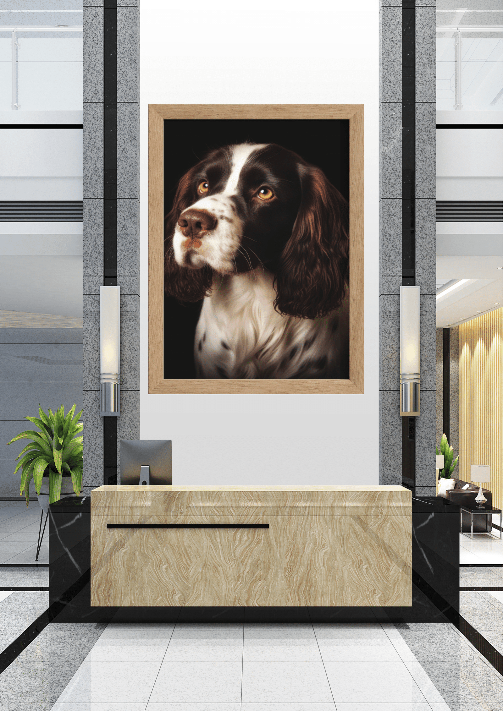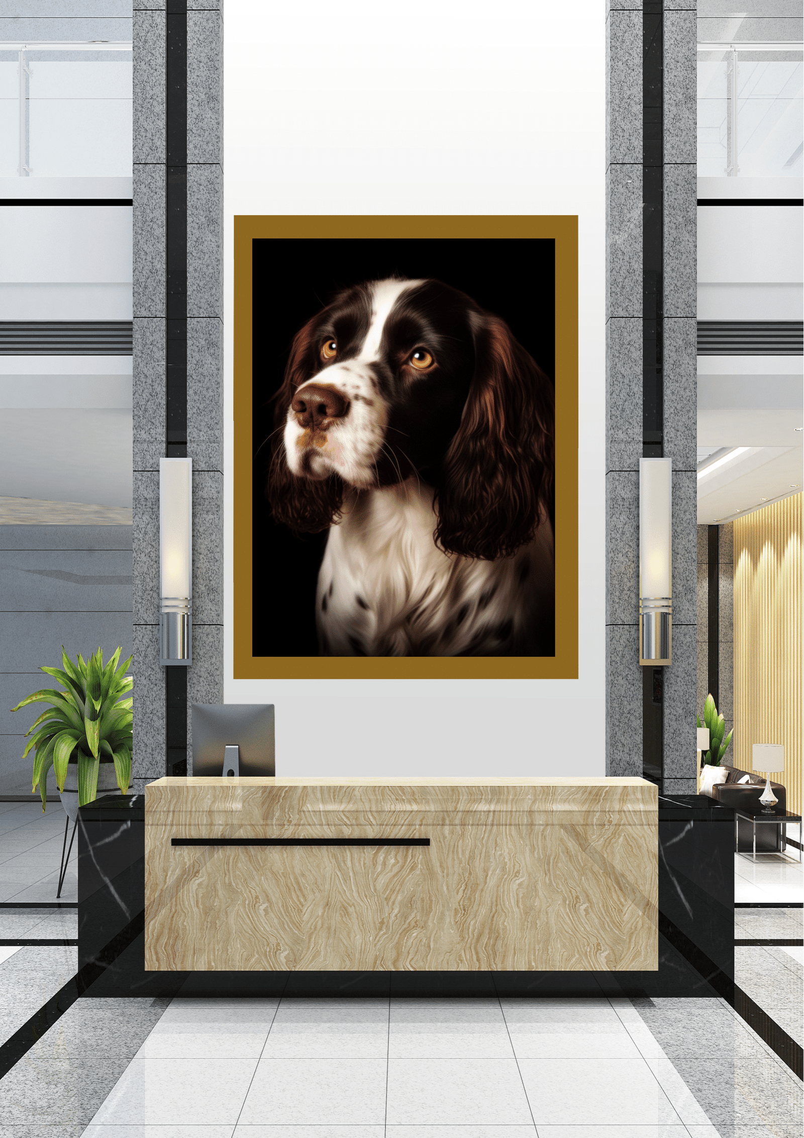 A imagem apresenta um sofisticado hall de entrada, destacando-se pela decoração moderna e minimalista. O ponto focal é um impressionante retrato de um cão, emoldurado e posicionado estrategicamente acima de uma recepção de mármore. O cão, com seu olhar expressivo e pelagem detalhada, traz um toque de personalidade e calor ao ambiente, contrastando com as linhas retas e o acabamento em metal e vidro do espaço. As plantas verdes adicionam um elemento natural, suavizando a rigidez do design contemporâneo. A iluminação suave das arandelas complementa a cena, criando uma atmosfera acolhedora e profissional. Este espaço exemplifica como a arte pode transformar ambientes corporativos, adicionando charme e um ponto de conversa para visitantes e funcionários.