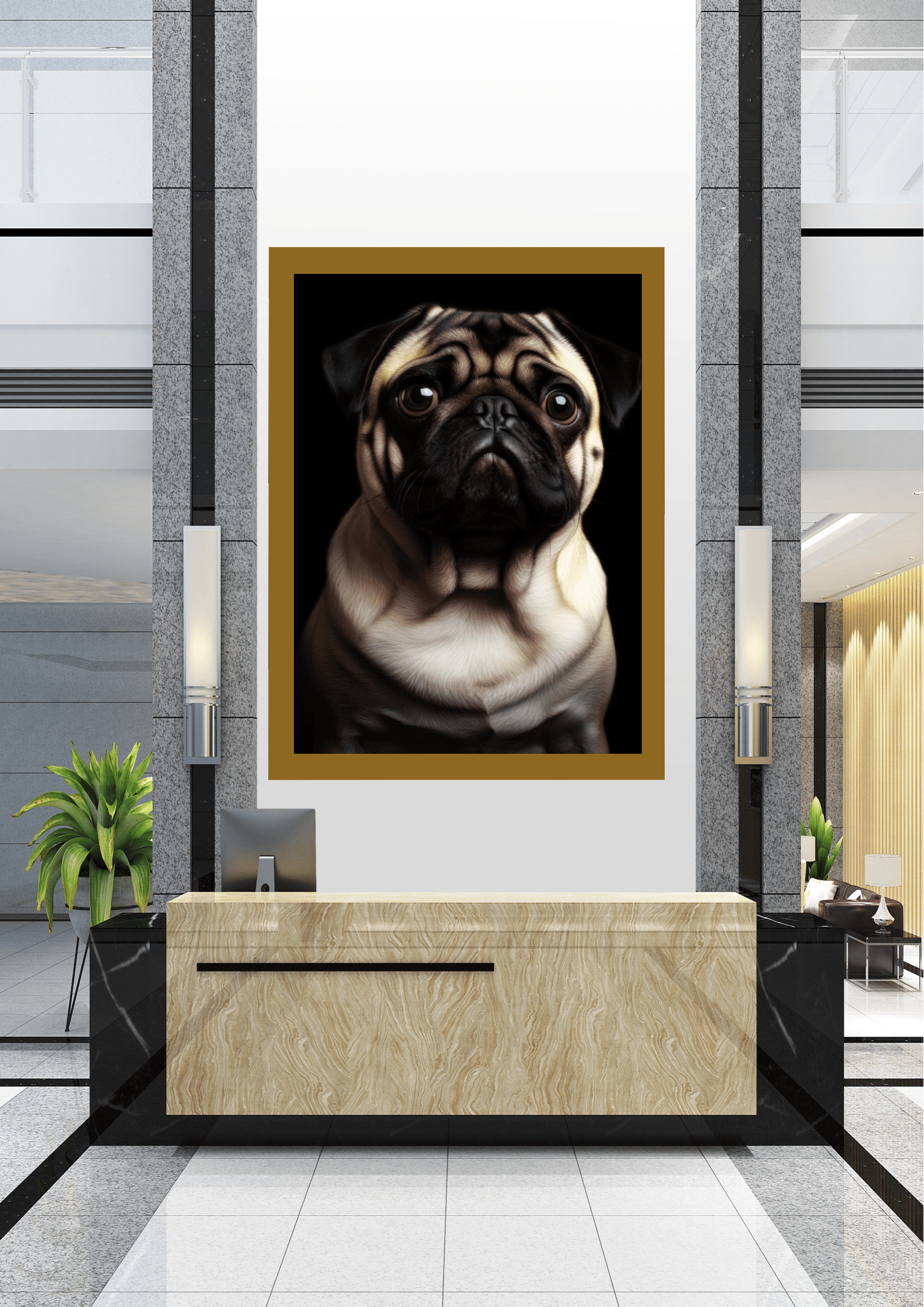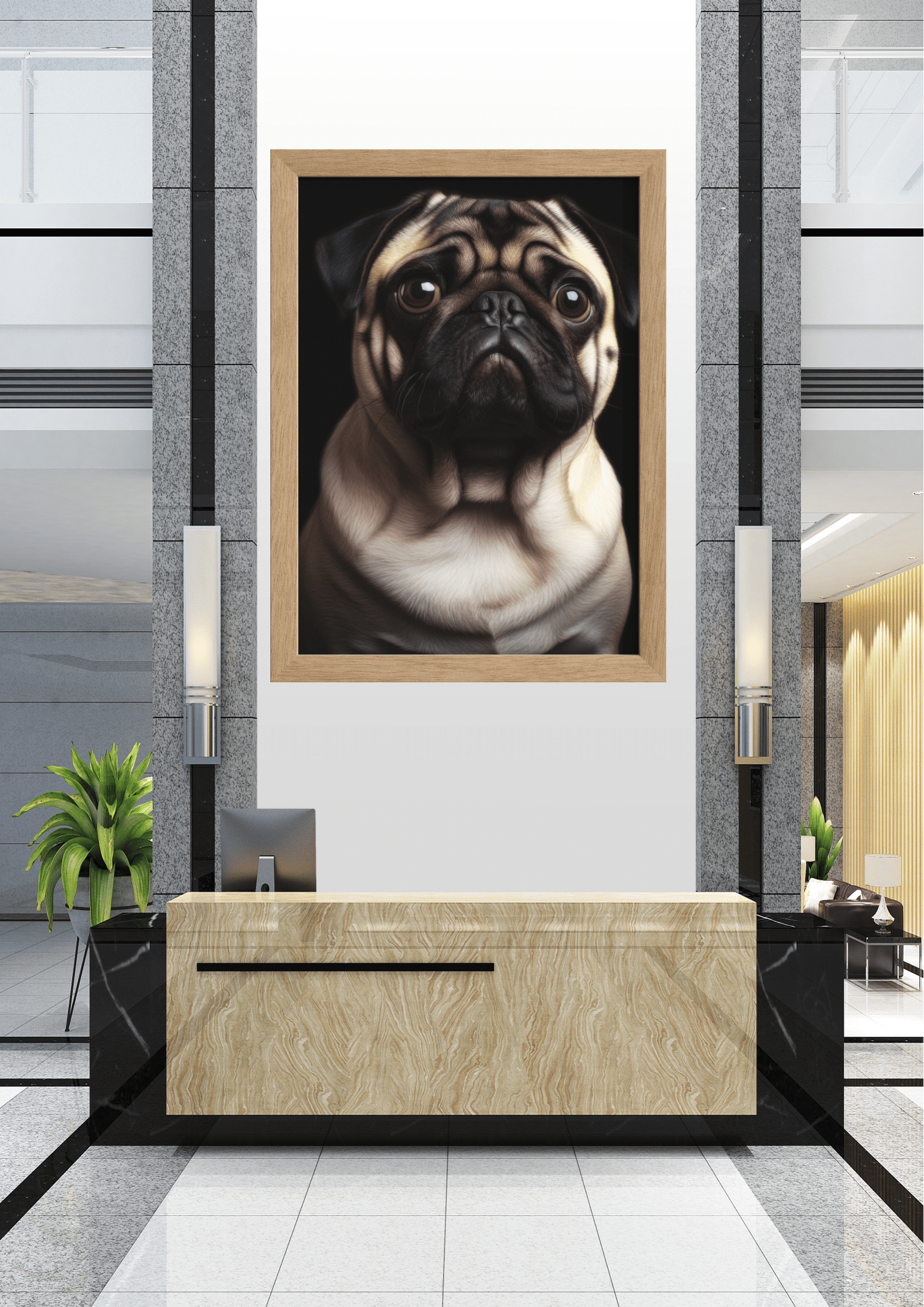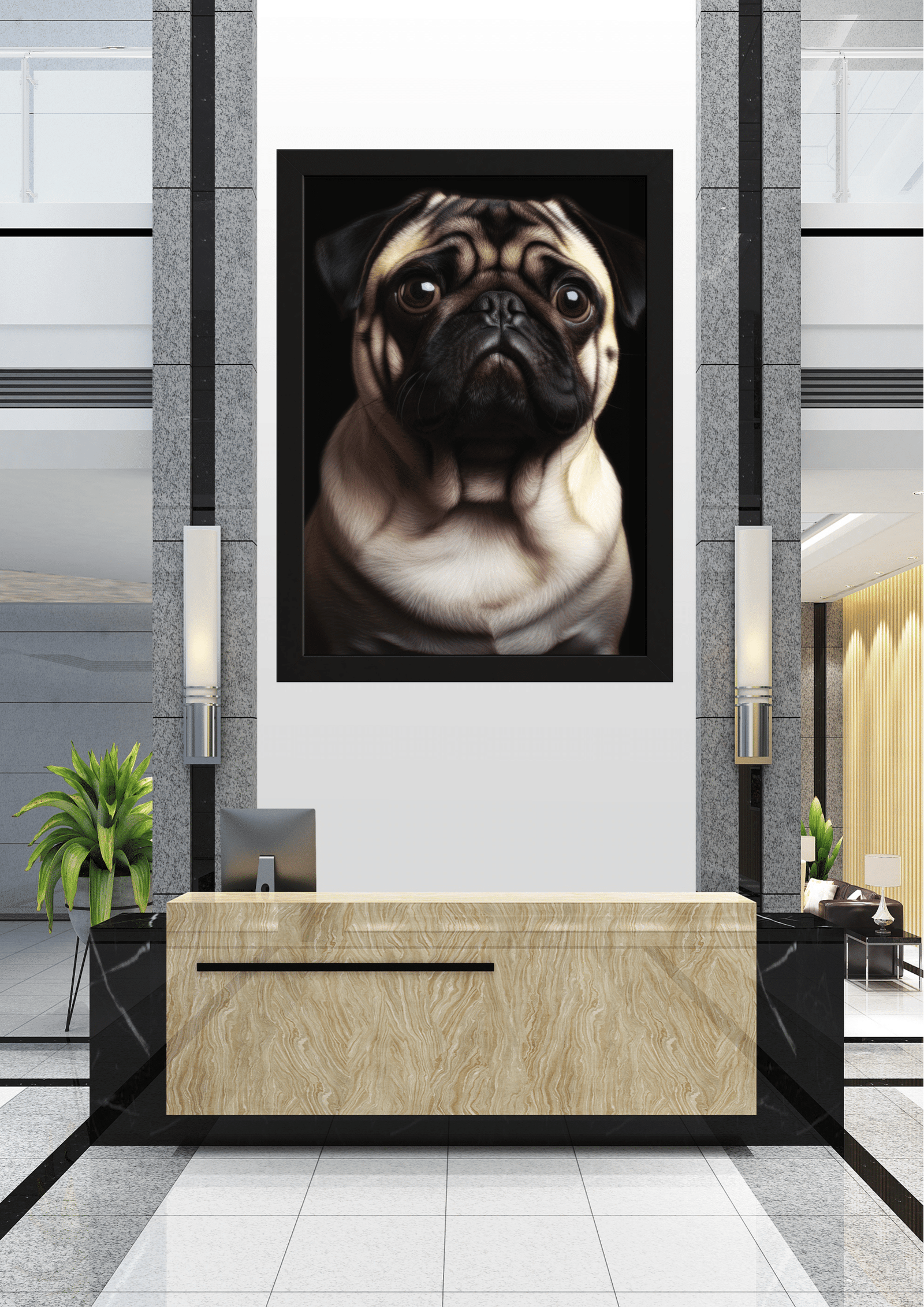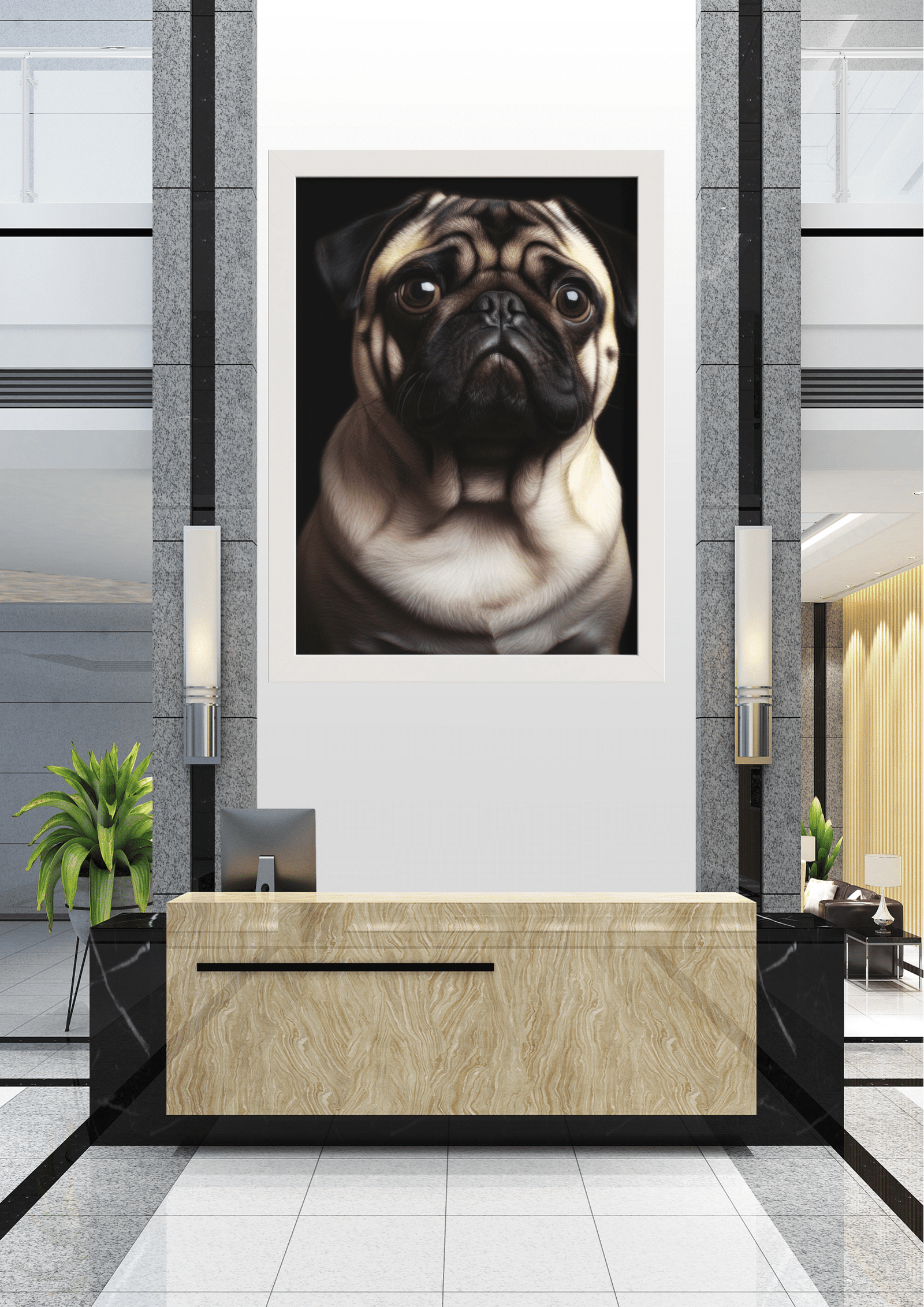A imagem retrata um sofisticado lobby de escritório, onde a decoração minimalista e moderna é complementada por um imponente retrato de um pug. A obra de arte, centralizada na parede atrás do balcão de recepção, captura a essência do pug com detalhes impressionantes, destacando suas expressões faciais e dobras características. As cores neutras do ambiente, combinadas com o mármore e o granito, criam uma atmosfera de luxo e acolhimento. O quadro do pug, com seu olhar contemplativo, parece observar cada visitante que adentra o espaço, conferindo uma sensação de presença amigável e vigilante. Plantas verdes ao redor adicionam um toque de frescor e vida ao ambiente, equilibrando a sobriedade dos materiais. Este cenário não só reflete bom gosto e estilo, mas também uma escolha ousada e charmosa de decoração, onde a arte e o design se encontram para criar uma recepção memorável e convidativa.