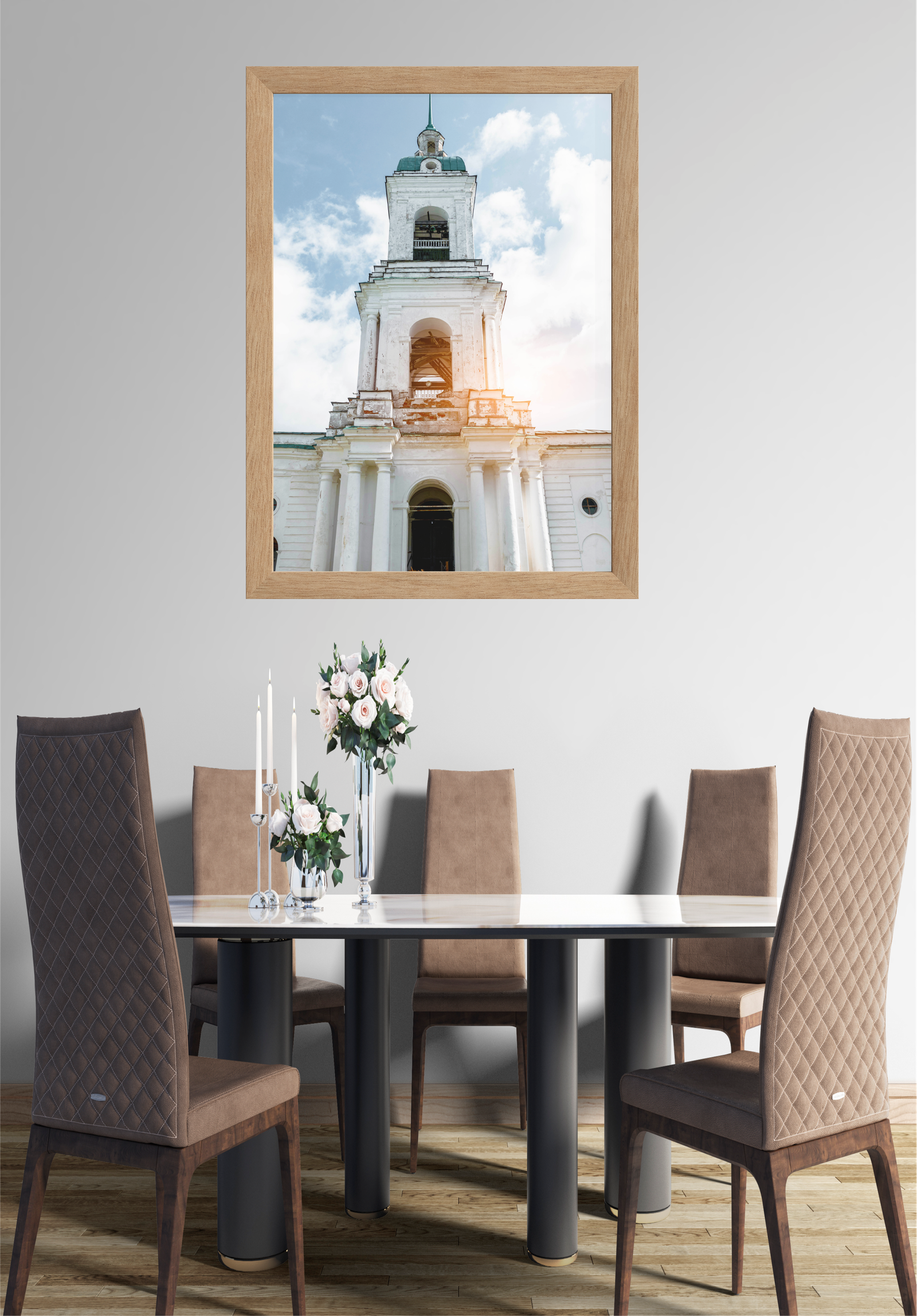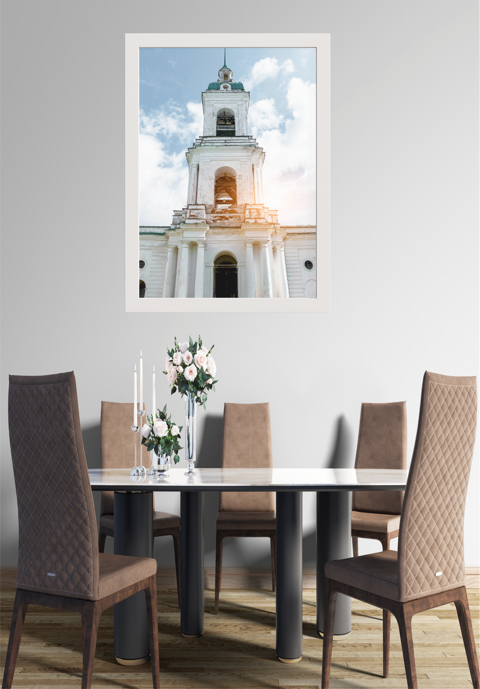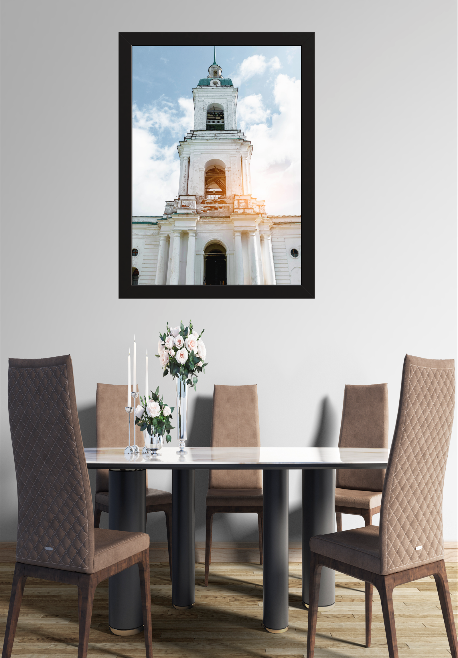 Nesta imagem, a elegância clássica de uma torre de igreja antiga é capturada e emoldurada com perfeição, adornando uma sala de jantar moderna. A torre, com sua arquitetura imponente e detalhes históricos, destaca-se contra um céu azul pontilhado de nuvens. O toque suave da luz do sol adiciona um brilho acolhedor à estrutura, realçando suas texturas e história.