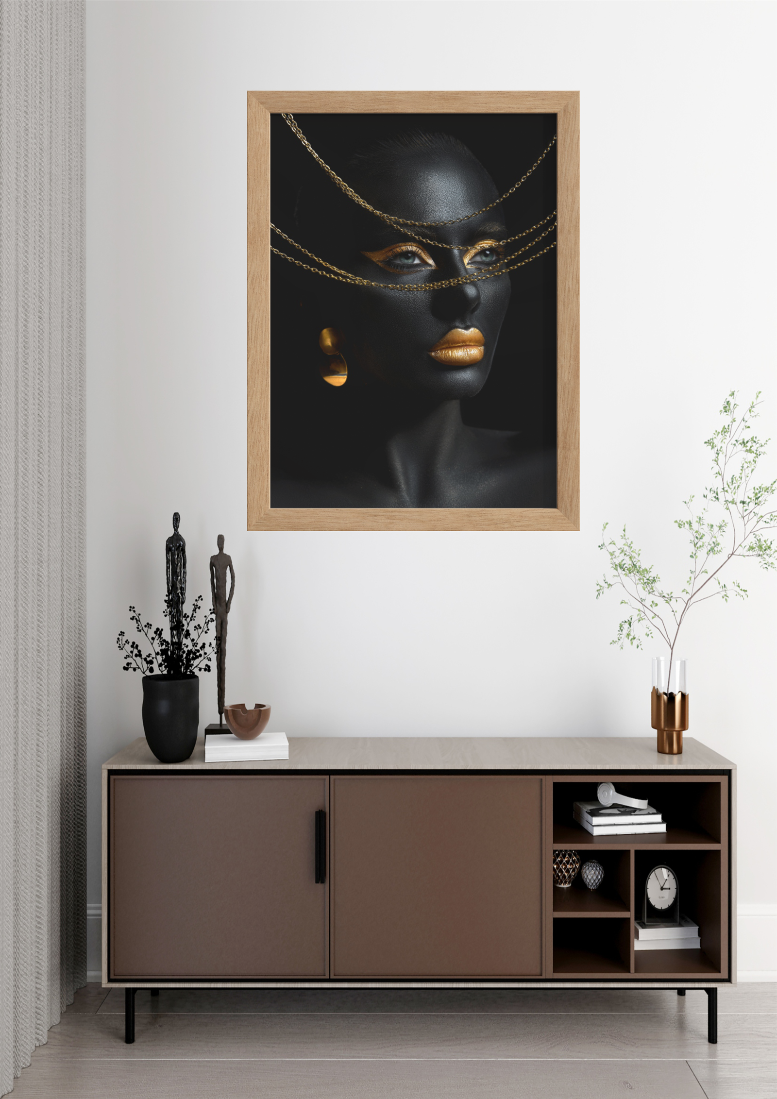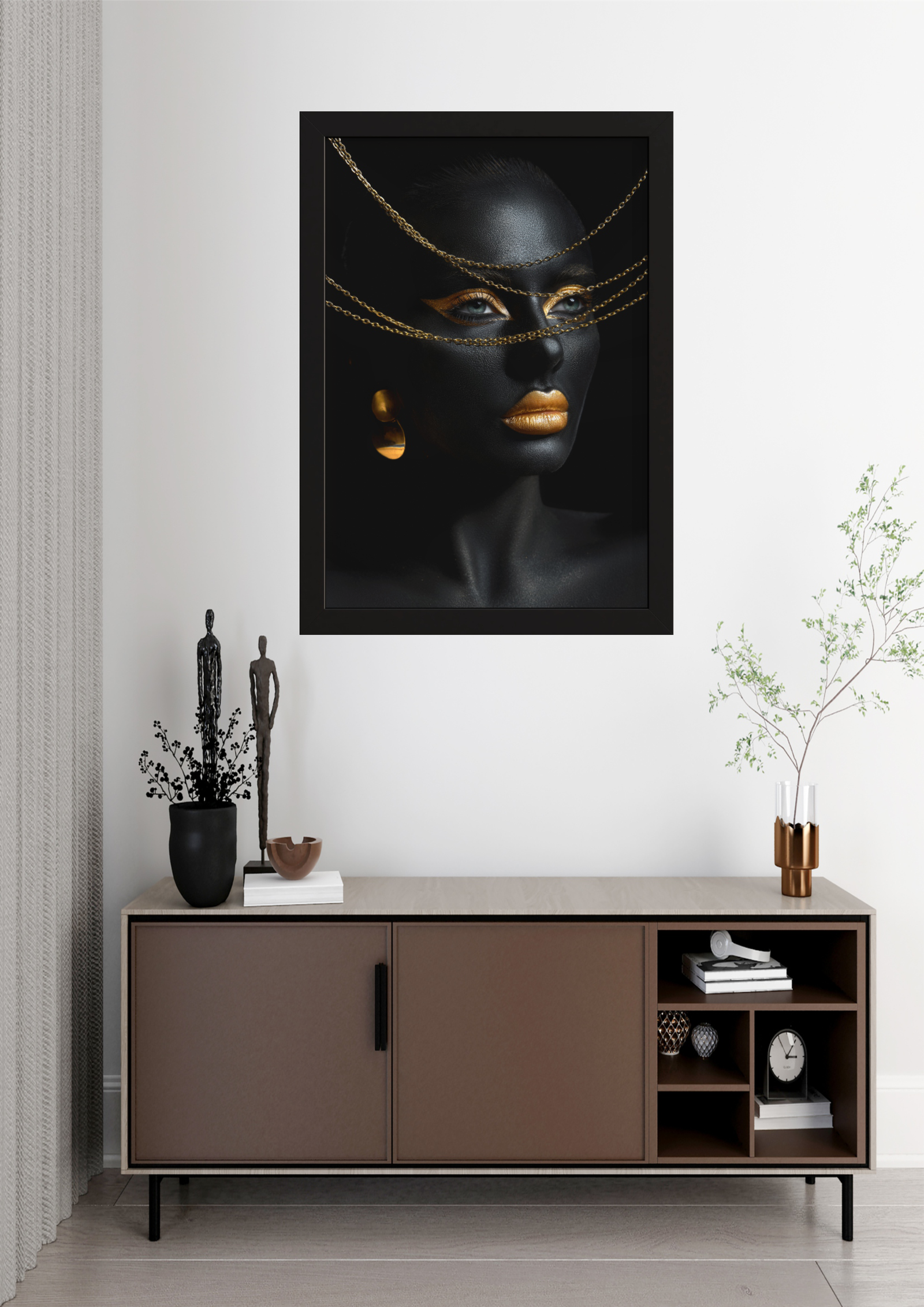 A imagem retrata um ambiente sofisticado de sala de estar, onde o destaque é uma impressionante obra de arte pendurada na parede. A peça central é um retrato em preto e dourado, apresentando uma figura feminina com pele negra e detalhes dourados nos lábios, olhos e dedos, conferindo um contraste marcante e elegante. A composição artística exala uma aura de mistério e luxo, capturando a atenção de quem entra no espaço. Abaixo da obra, um aparador minimalista em tons neutros complementa o ambiente, adornado com esculturas estilizadas e um arranjo de folhagens delicadas. A iluminação suave e a decoração cuidadosamente selecionada criam uma atmosfera de tranquilidade e sofisticação, tornando este espaço um exemplo perfeito de design contemporâneo com um toque artístico.