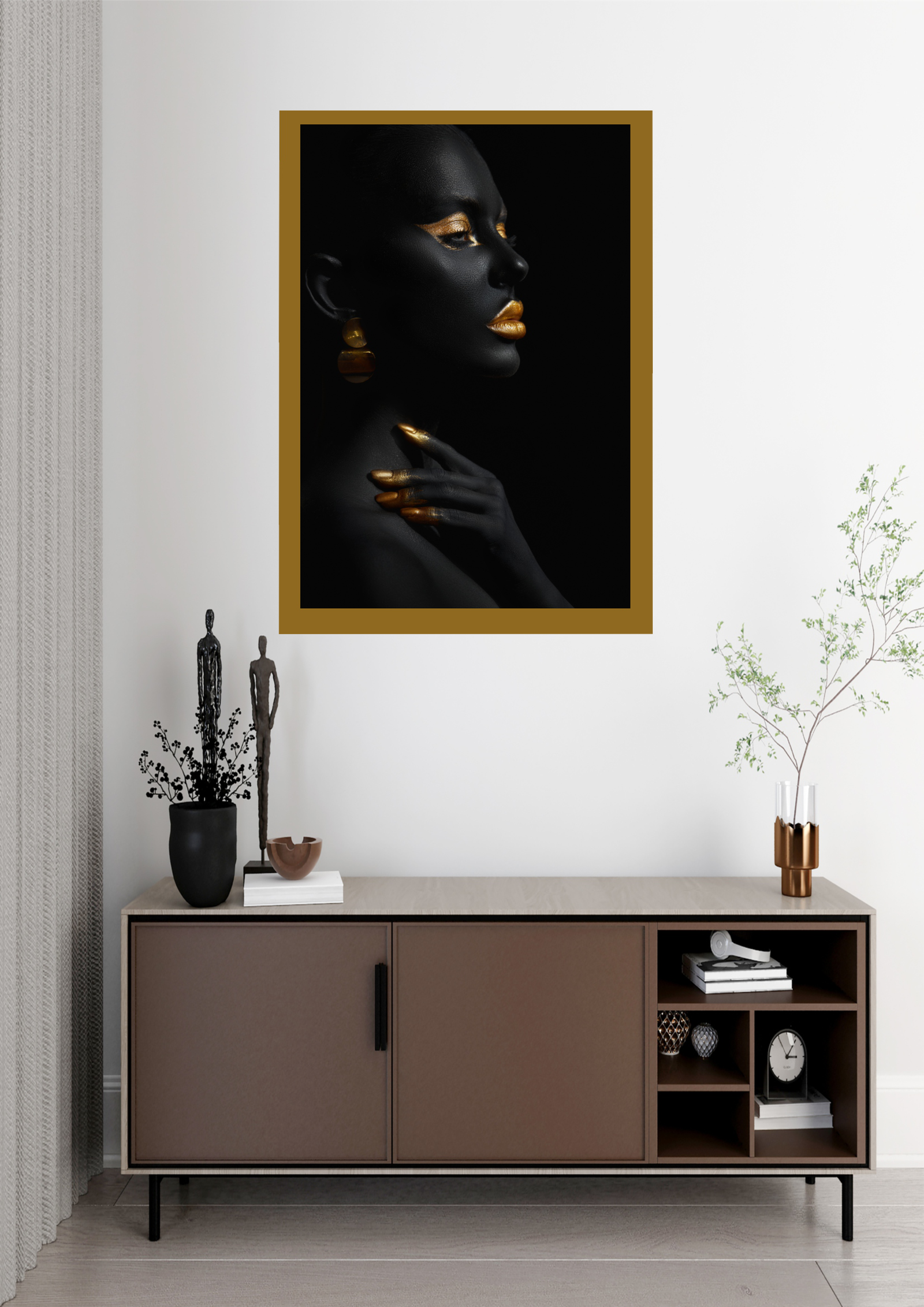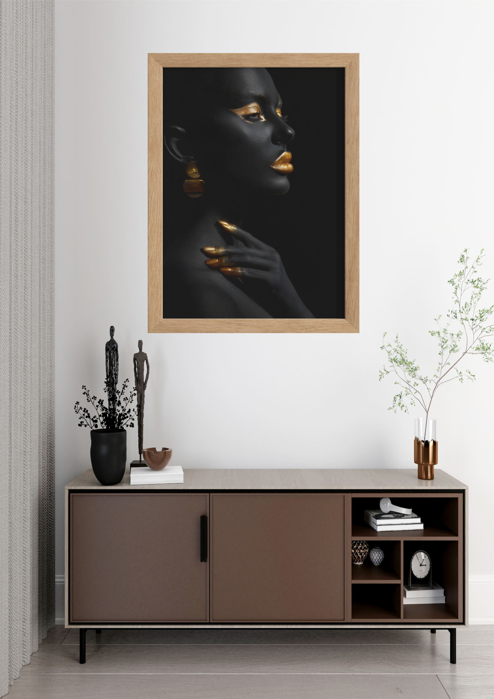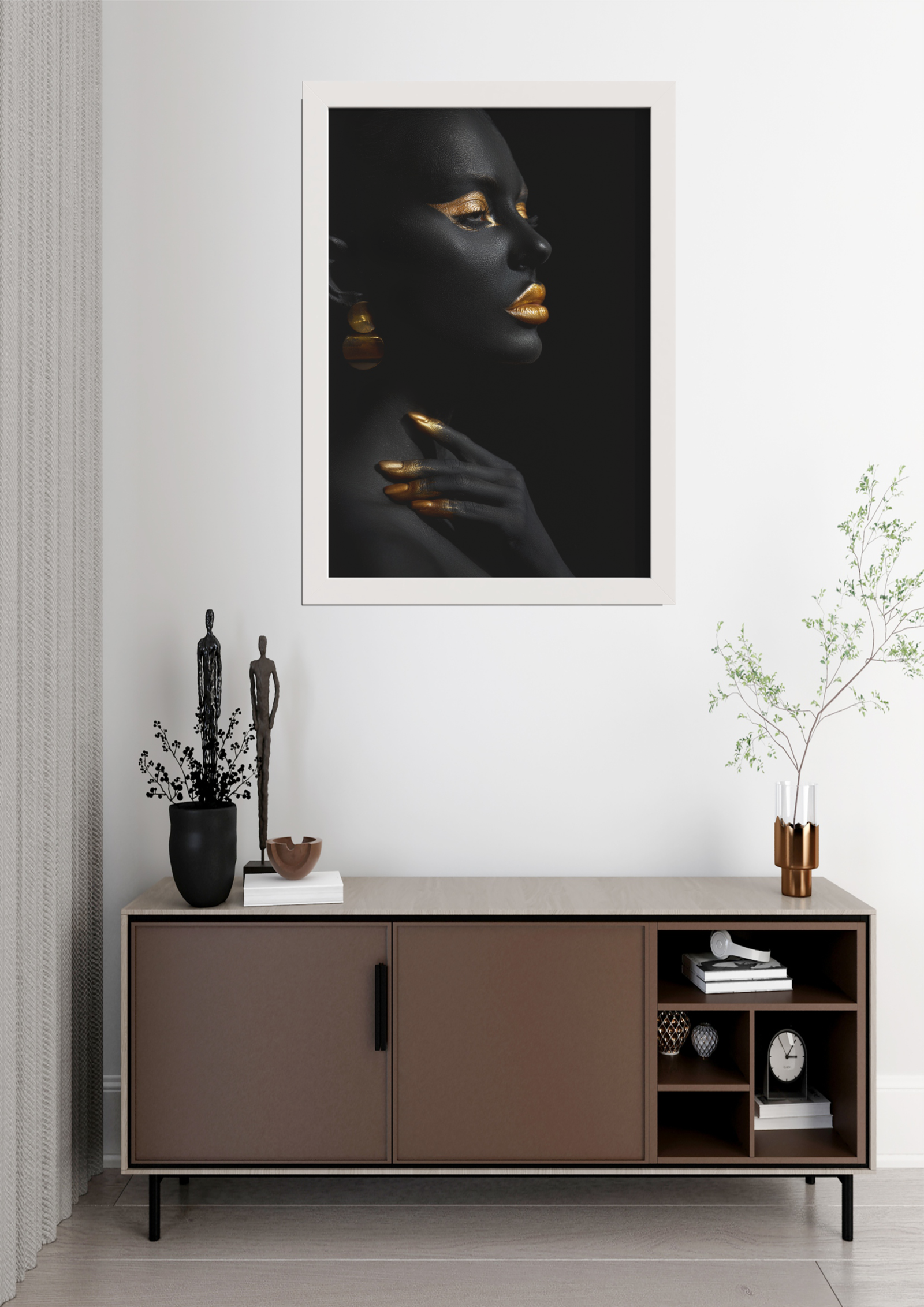 O quadro está estrategicamente posicionado acima de um aparador moderno, que combina tons neutros e linhas limpas, complementando perfeitamente a obra de arte. Elementos decorativos adicionais, como esculturas minimalistas e plantas discretas, adicionam um toque de personalidade ao ambiente sem desviar a atenção da peça principal.