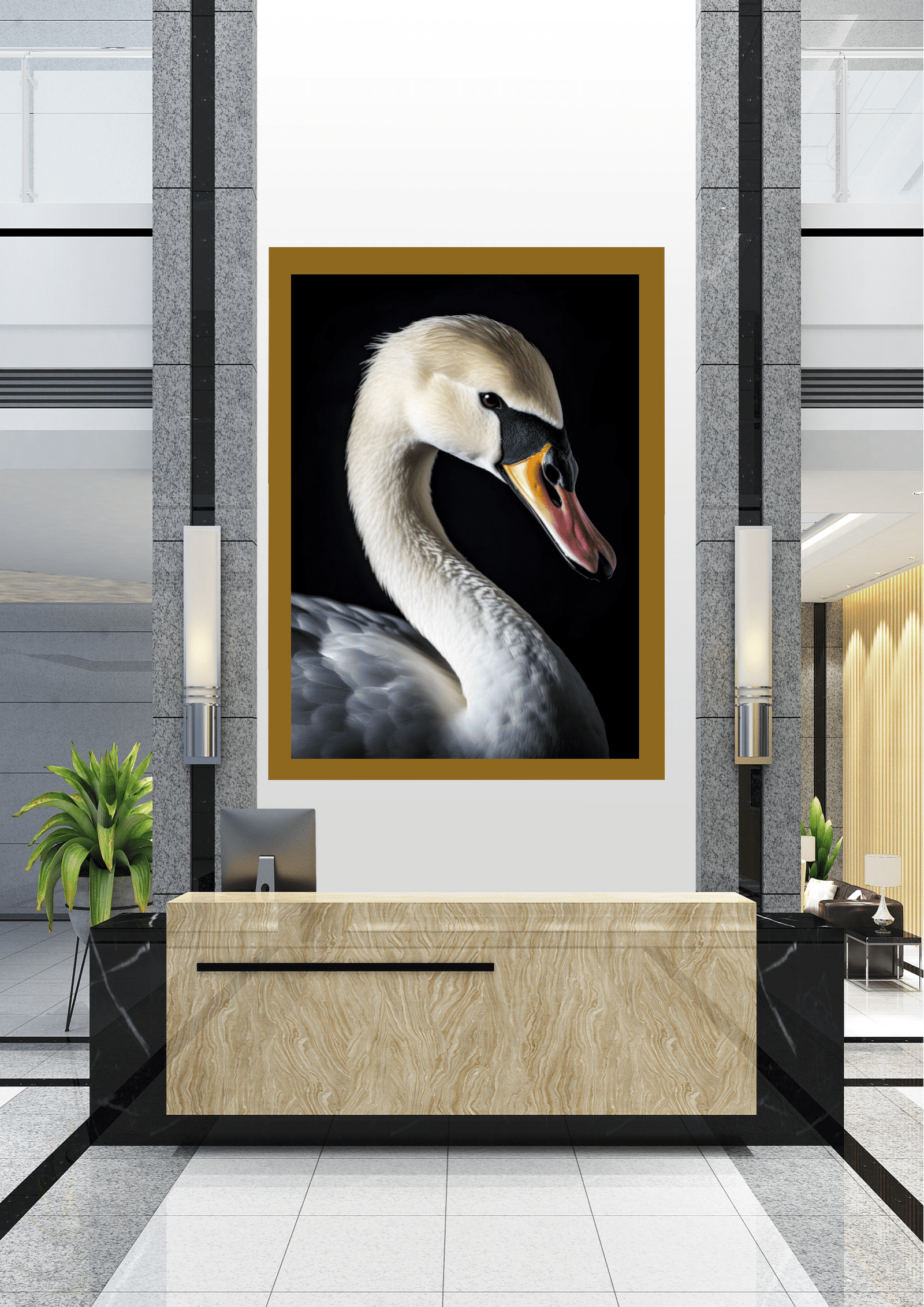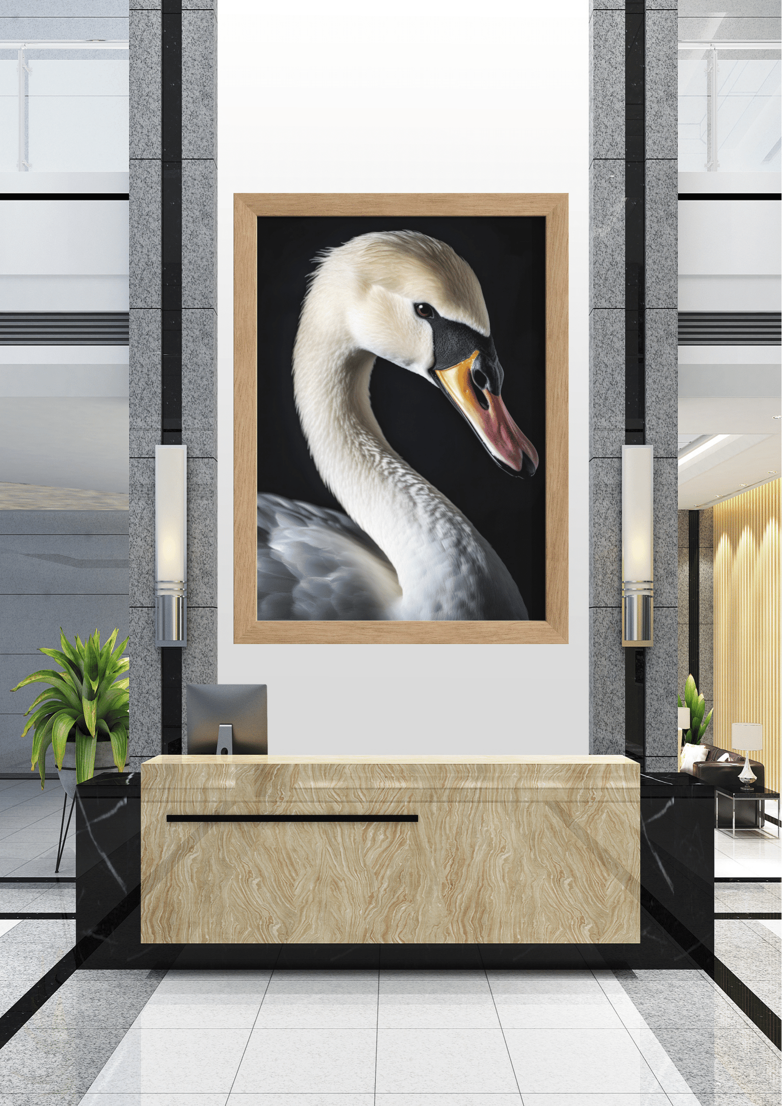 A imagem apresenta uma impressionante fotografia de um cisne em close-up, emoldurada e exibida em um ambiente moderno e sofisticado. O retrato do cisne, capturado contra um fundo preto, destaca-se de forma dramática e elegante.