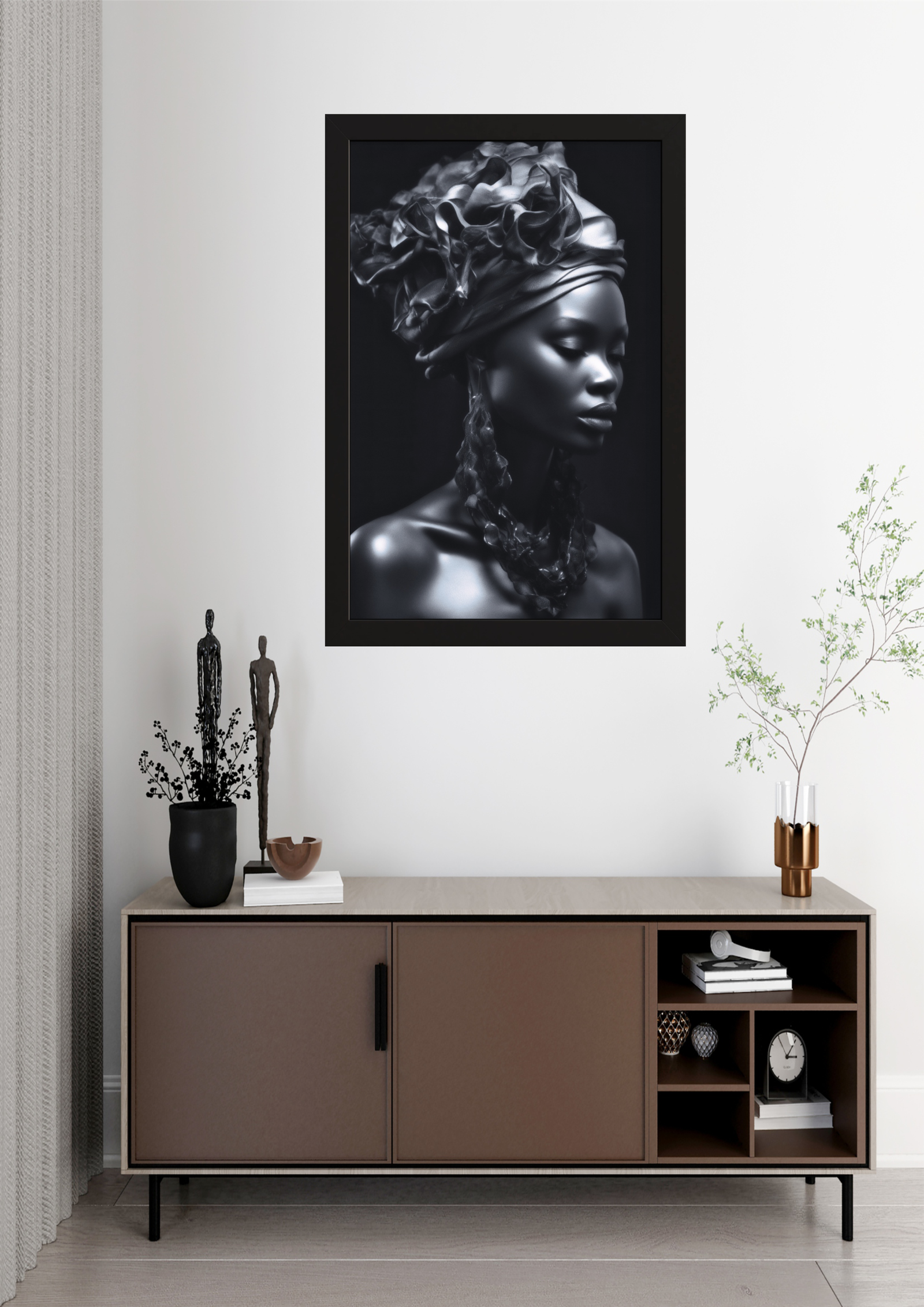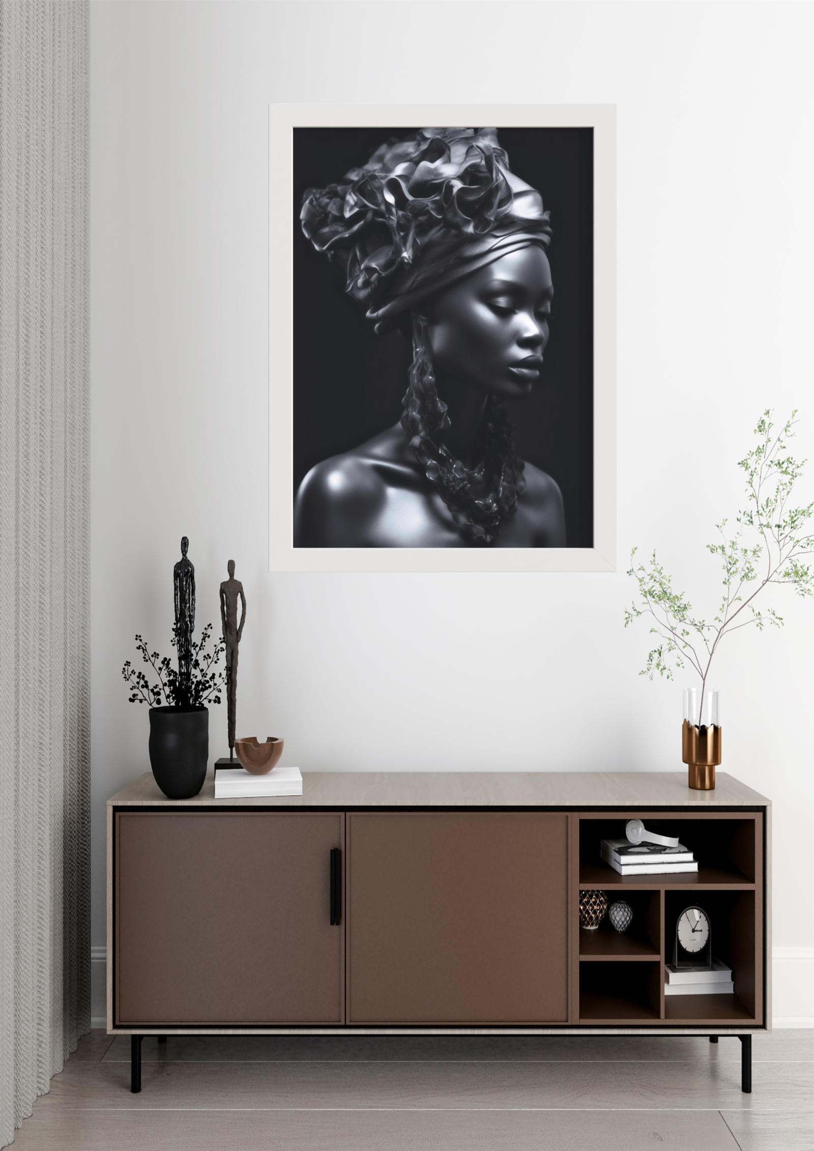 Este quadro captura a essência da beleza atemporal através de um retrato em preto e branco. A figura feminina, envolta em sombras sutis e luzes dramáticas, exala uma serenidade poderosa. O turbante detalhado e os adornos elegantes adicionam um toque de sofisticação, tornando esta peça uma escolha perfeita para ambientes que buscam elegância e profundidade artística.