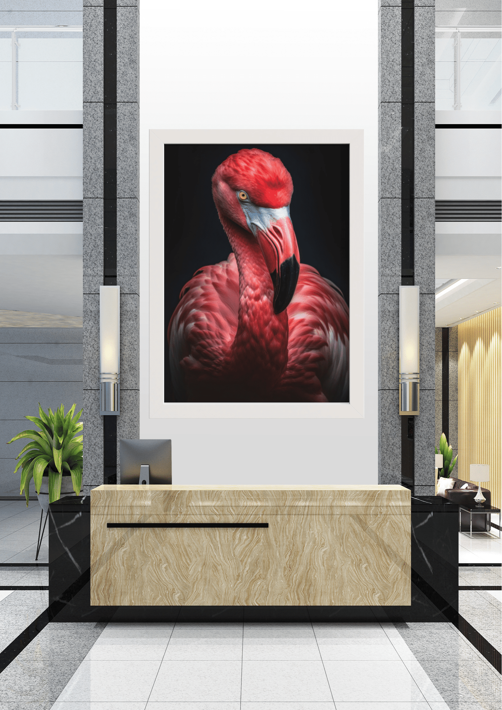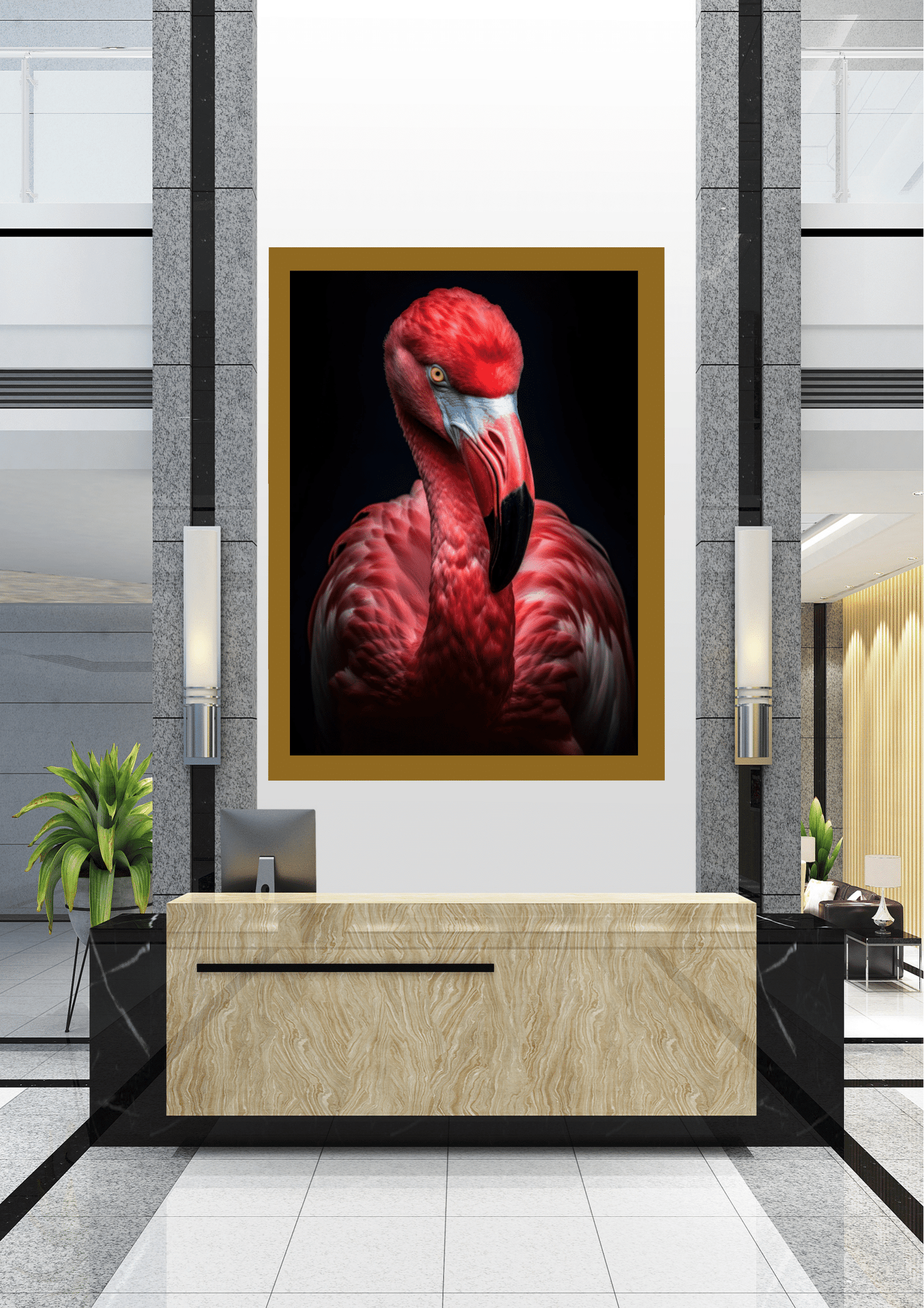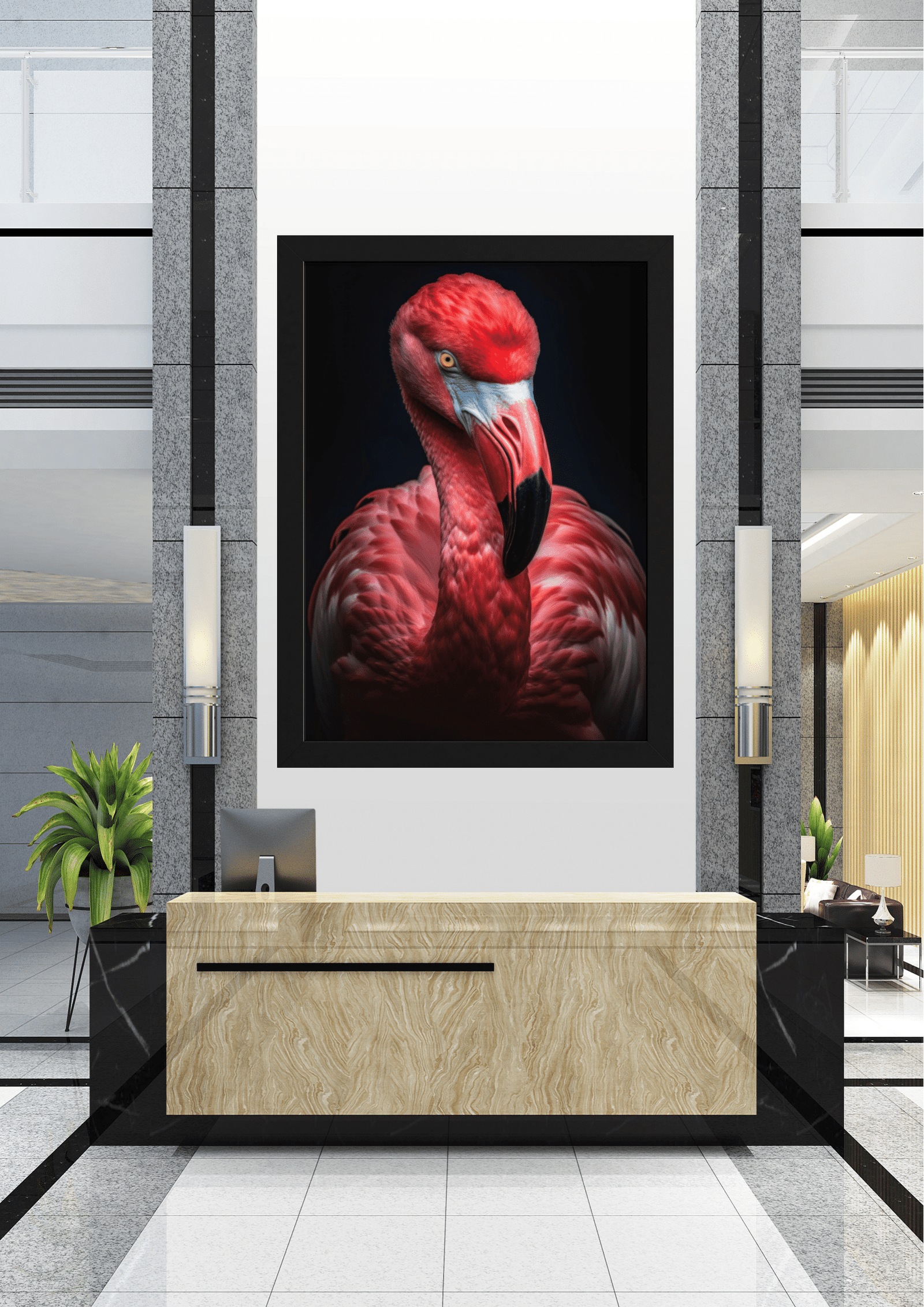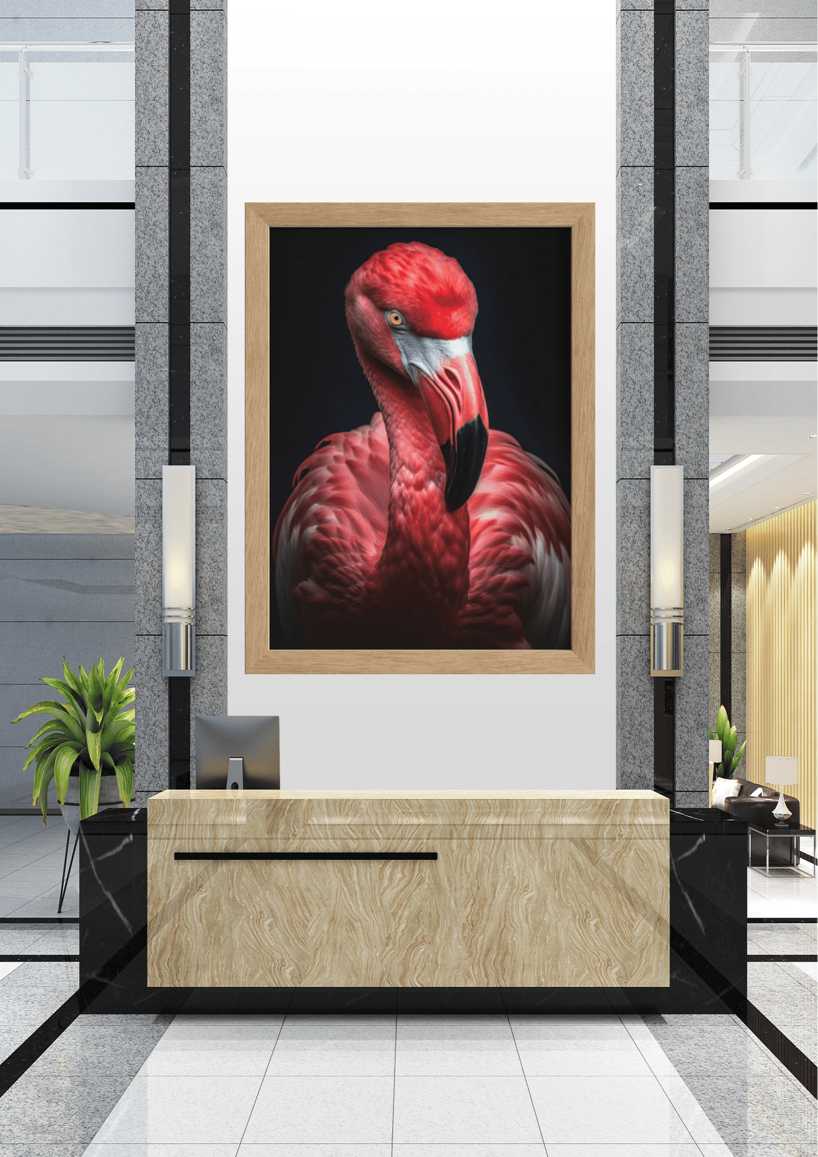 A imagem apresenta uma impressionante fotografia de um flamingo em close-up, emoldurada e exibida em um ambiente moderno e elegante. O retrato do flamingo domina o centro da composição, capturando a atenção imediata do observador com suas vibrantes tonalidades de vermelho e rosa.