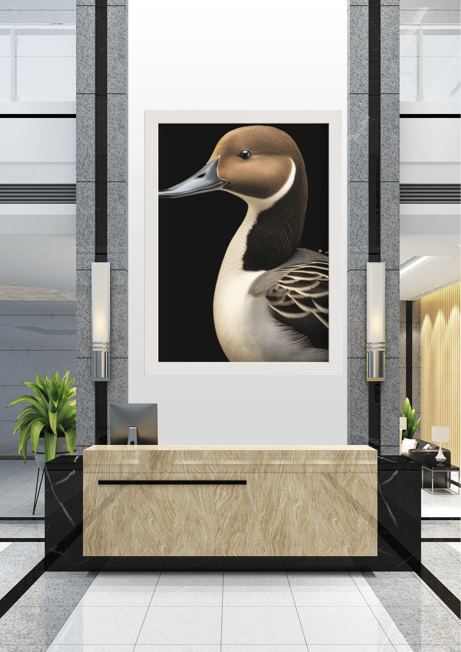 Esta imagem impressionante apresenta um retrato majestoso de um pato-real em um fundo preto, criando um contraste dramático que realça os detalhes intrincados da ave. O quadro está estrategicamente posicionado em um ambiente moderno e minimalista, dominando o espaço com sua presença imponente.