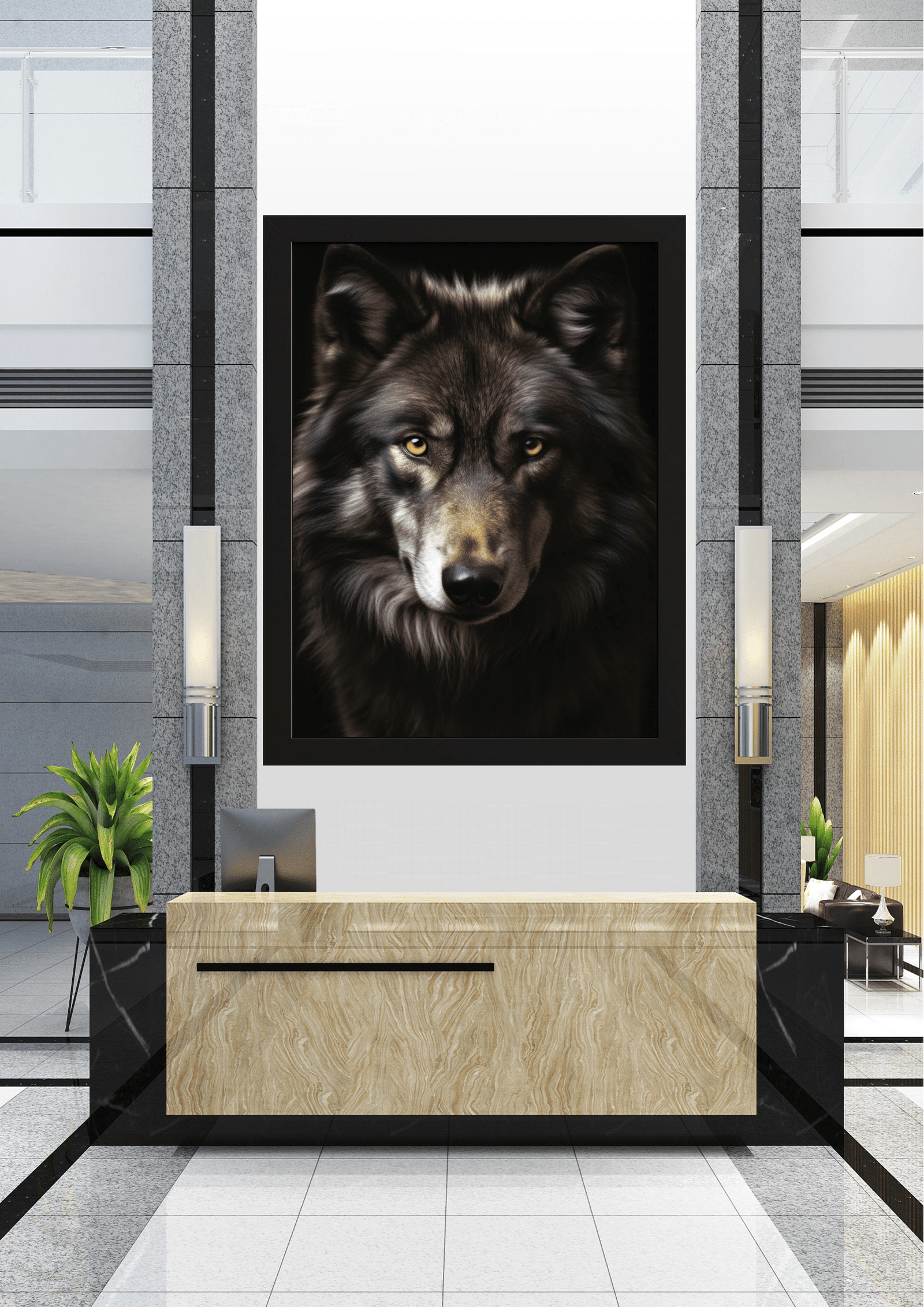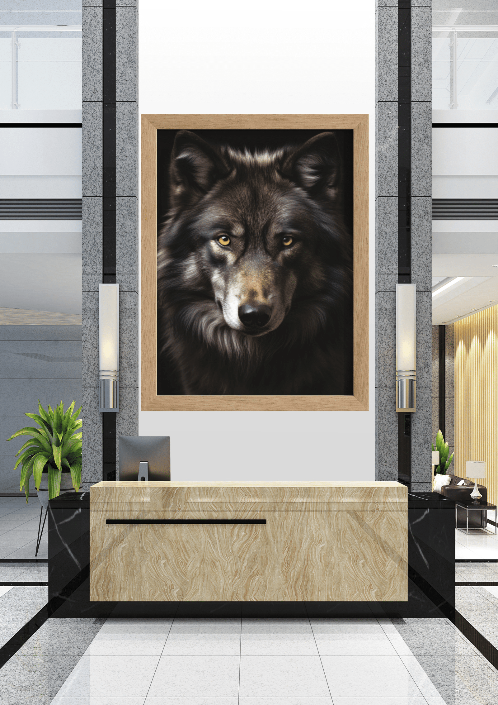 No coração de um elegante saguão corporativo, uma imponente imagem de um lobo captura instantaneamente a atenção de todos que entram. O olhar penetrante do lobo, com seus olhos dourados e pelagem densa, transmite uma sensação de força e sabedoria. A obra de arte, emoldurada em preto, contrasta perfeitamente com o ambiente moderno e minimalista que a cerca, destacando ainda mais sua presença majestosa. As linhas limpas e o design sofisticado do espaço complementam a aura mística do lobo, tornando-o um símbolo de liderança e vigilância. Este poderoso retrato não apenas decora o ambiente, mas também inspira uma sensação de respeito e admiração, lembrando a todos da beleza e da força da natureza selvagem. A combinação de arte e arquitetura cria um espaço que é ao mesmo tempo acolhedor e impressionante, onde cada elemento parece contar uma história de elegância e poder.