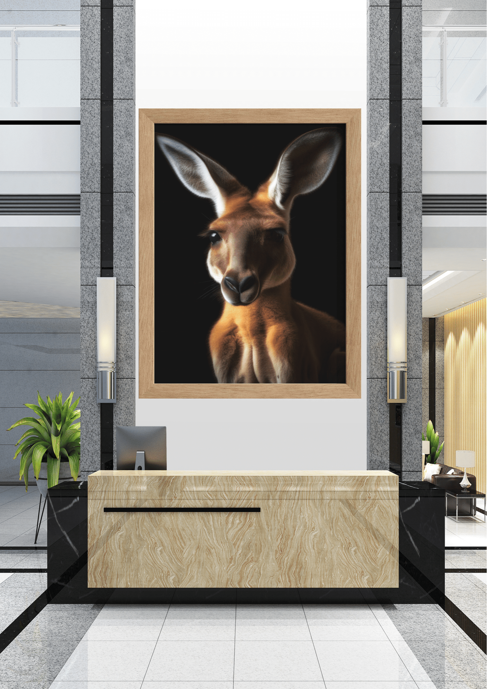 No centro de um moderno saguão corporativo, um imponente retrato de canguru captura a atenção de todos. A imagem, emoldurada em preto, destaca a expressão serena e curiosa do animal, contrastando com o ambiente sofisticado ao seu redor. As linhas arquitetônicas do espaço, com seus tons neutros e acabamentos em mármore, oferecem um cenário perfeito para a arte, criando uma fusão entre a natureza e o design contemporâneo.