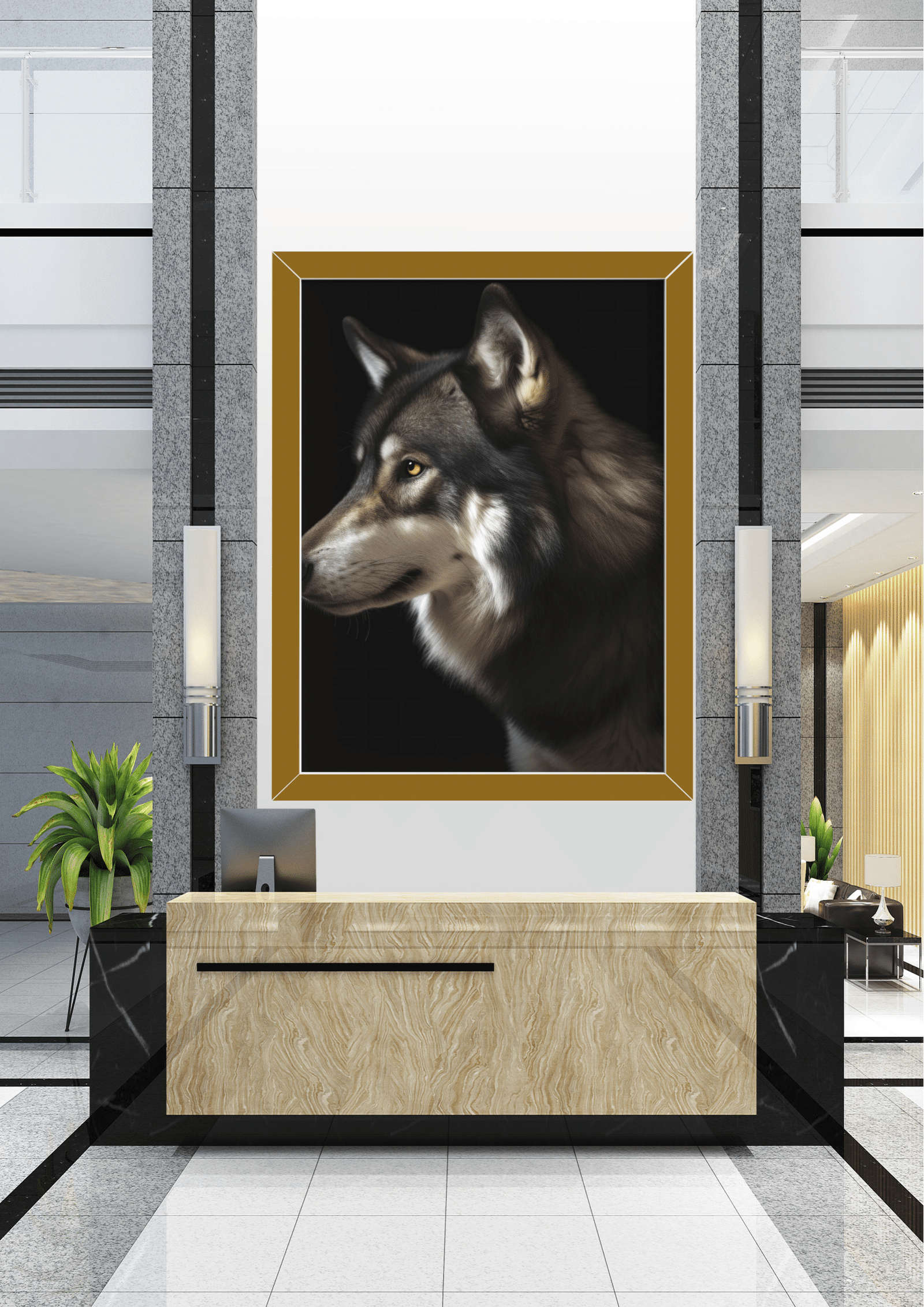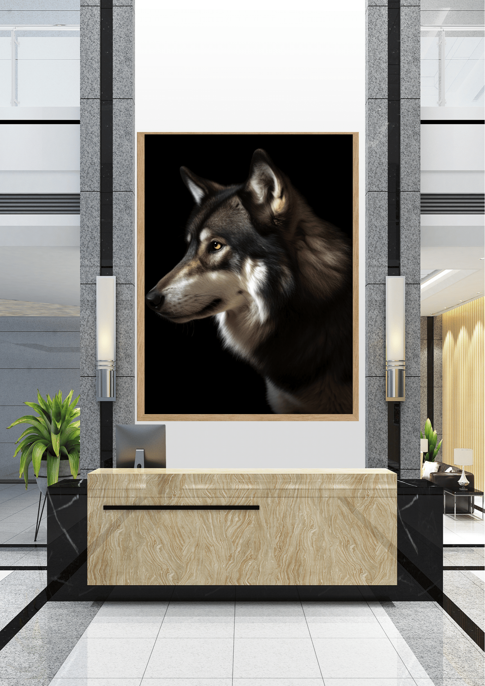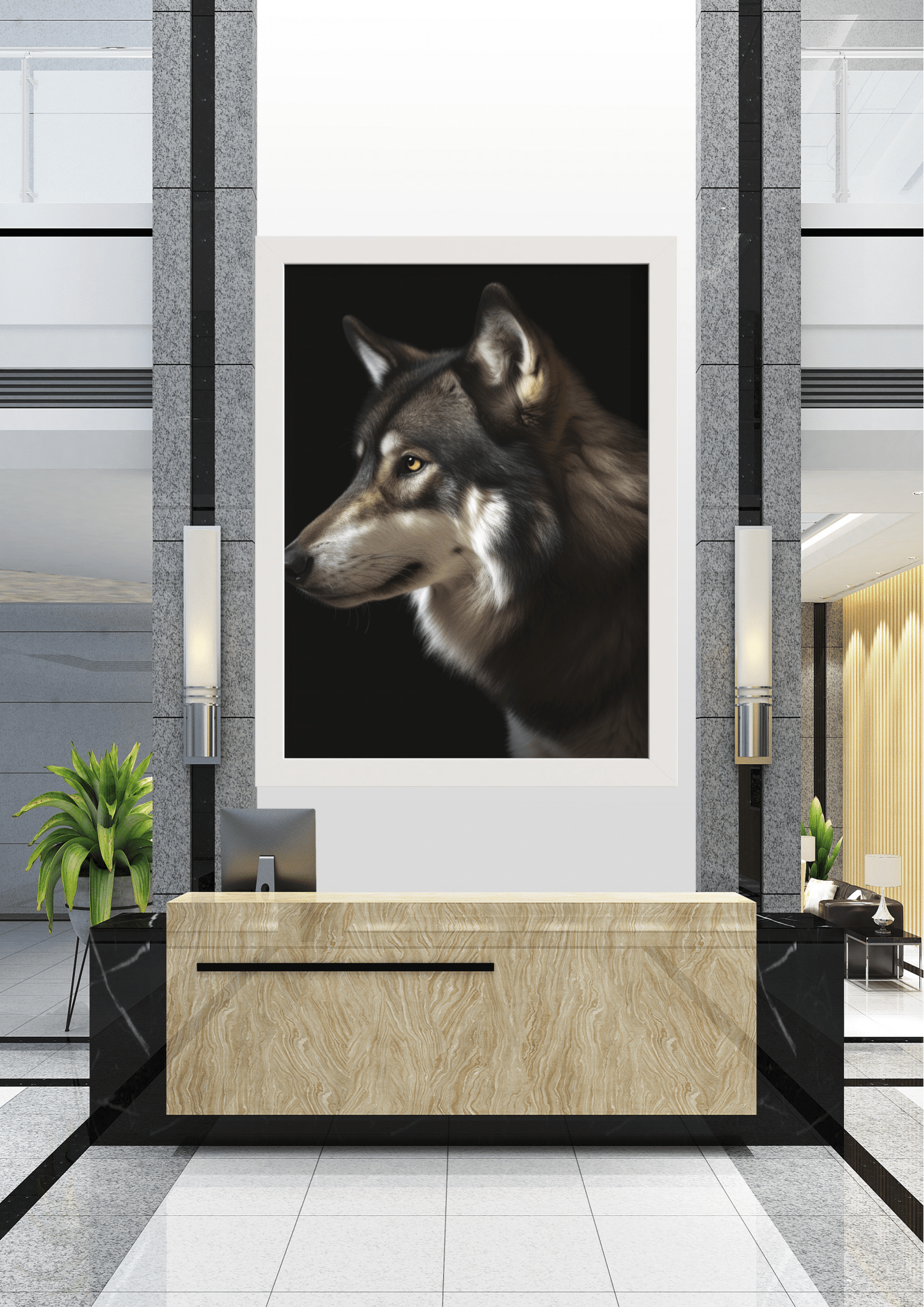 No coração de um átrio sofisticado, uma imponente imagem de um lobo domina a cena. O quadro, com suas cores vibrantes e realistas, retrata a essência selvagem e a majestade do animal, contrastando com o design contemporâneo do ambiente. A recepção, com seu balcão de mármore polido e detalhes em preto, complementa a elegância do espaço, criando uma harmonia entre a natureza e a modernidade. Plantas verdes adicionam um toque de frescor, enquanto as paredes de pedra e as linhas arquitetônicas reforçam a sensação de grandiosidade. Este cenário é um convite à reflexão sobre a coexistência entre a urbanidade e a natureza, simbolizada pelo olhar penetrante do lobo, que parece vigiar e proteger o espaço ao seu redor.
