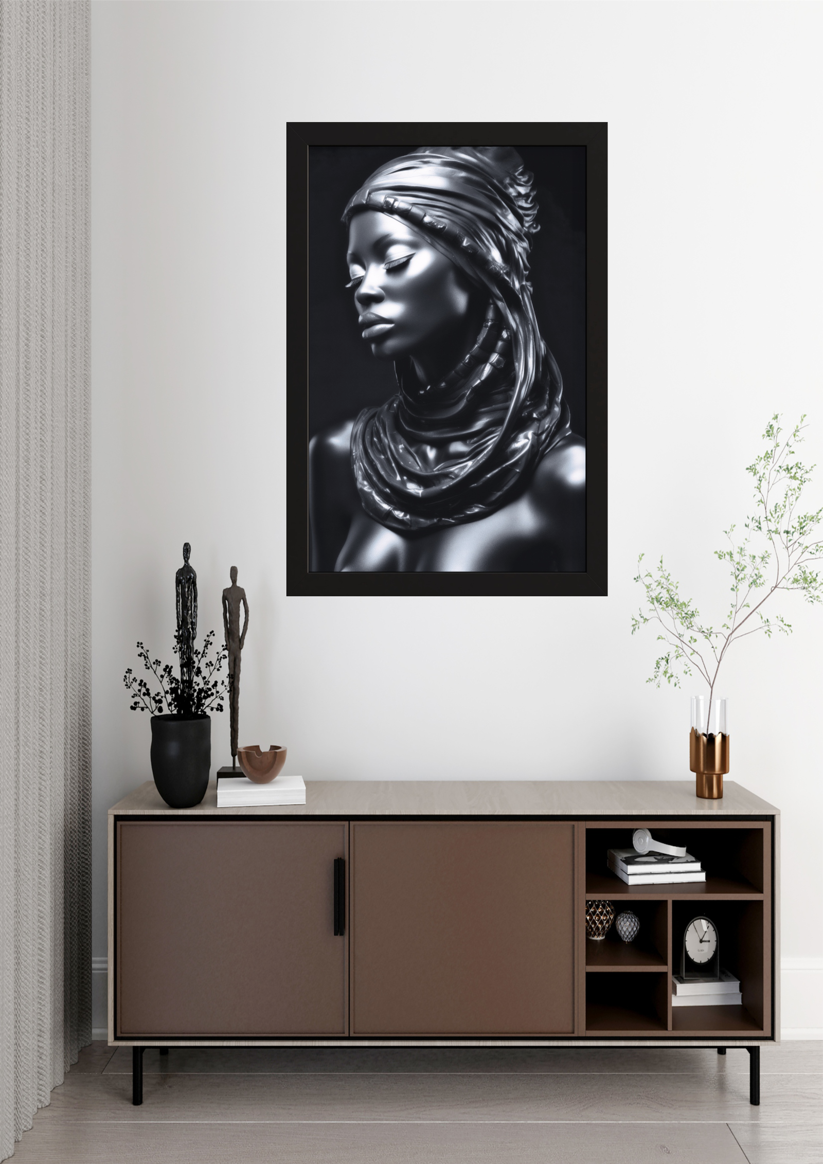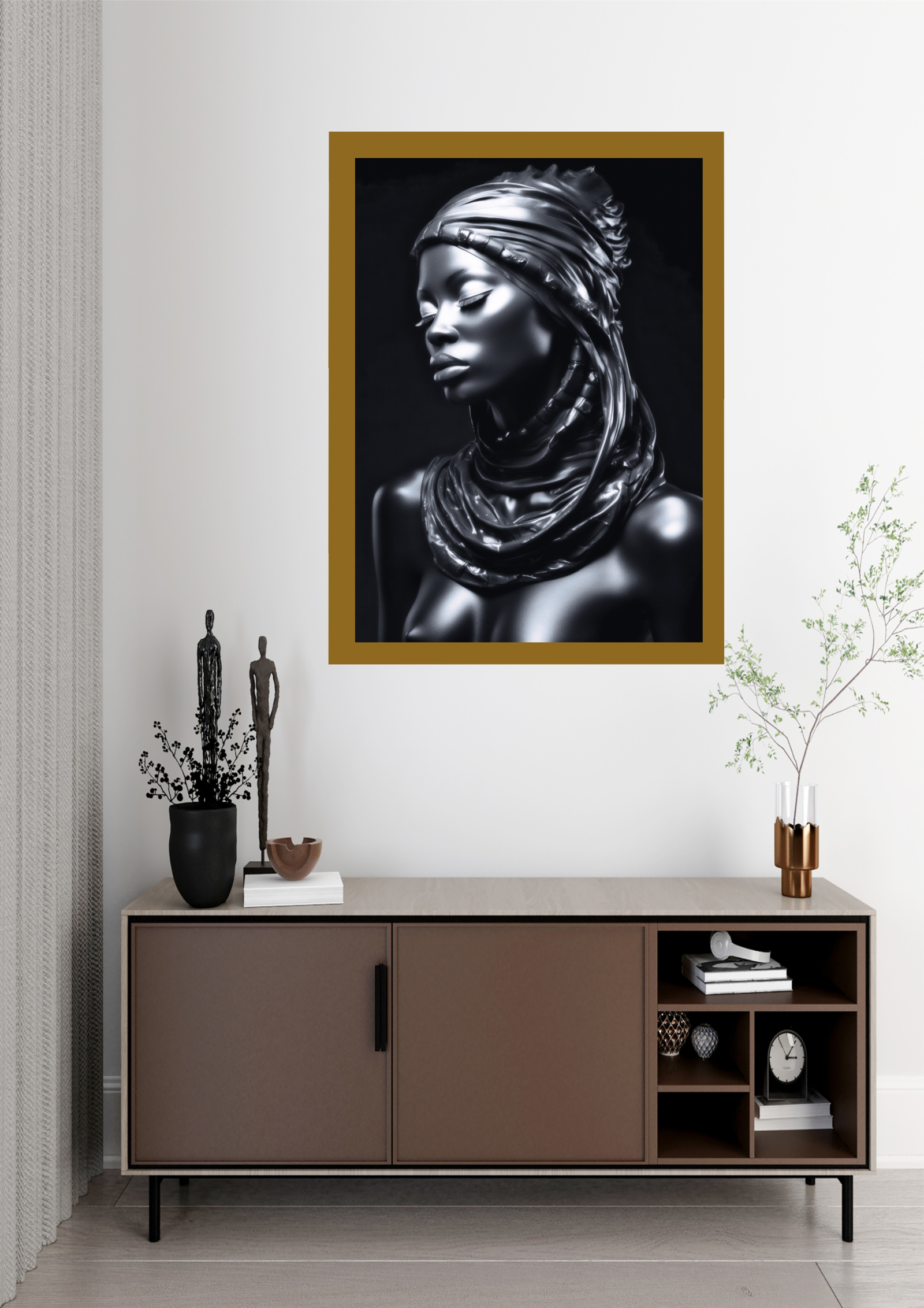 Este quadro captura a essência da serenidade e força feminina em um retrato monocromático. A figura, envolta em um manto de textura suave, exala uma tranquilidade introspectiva. As sombras e brilhos ressaltam a beleza e a complexidade da forma humana, criando uma atmosfera de mistério e contemplação. Ideal para espaços que buscam uma combinação de sofisticação e profundidade emocional.