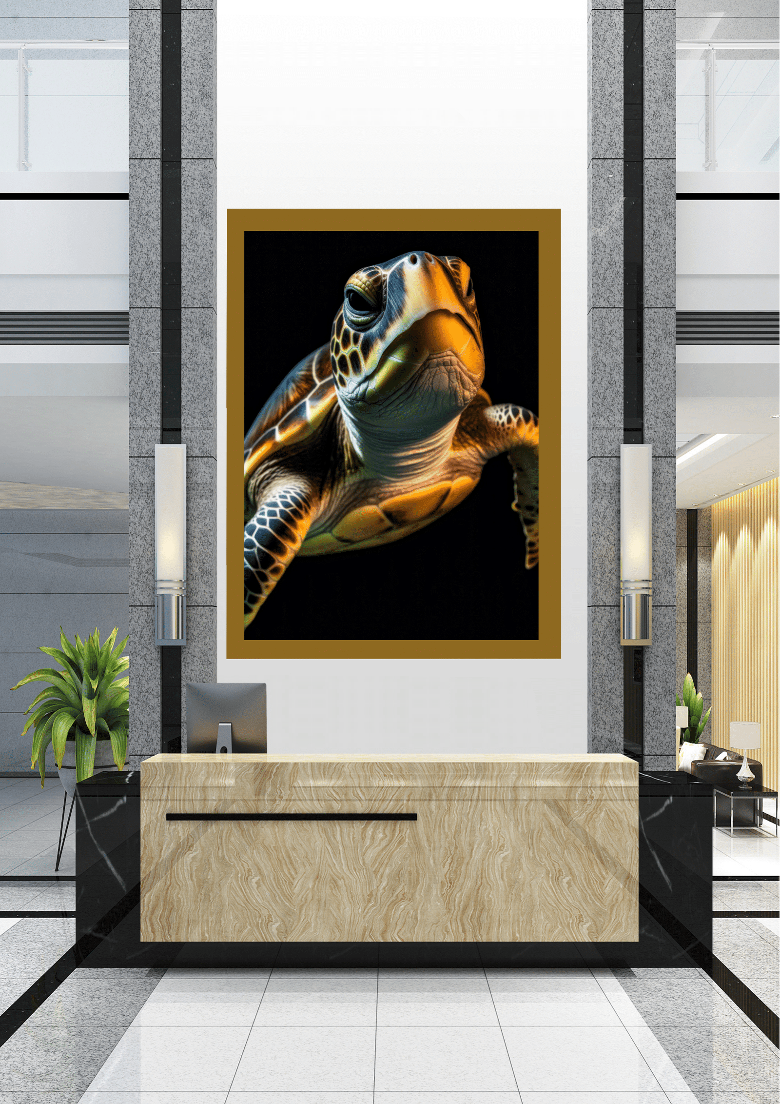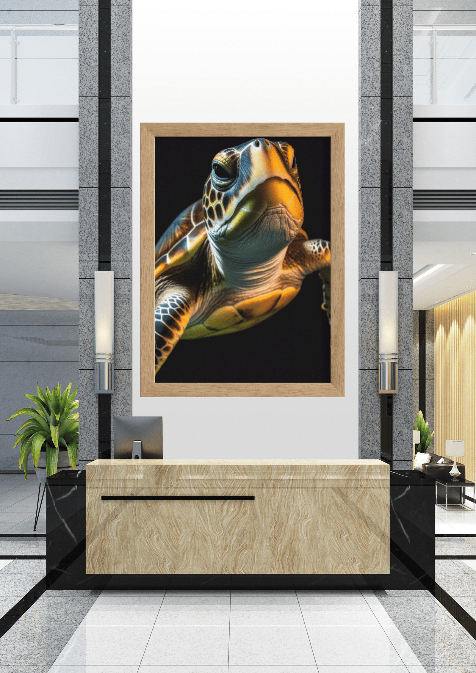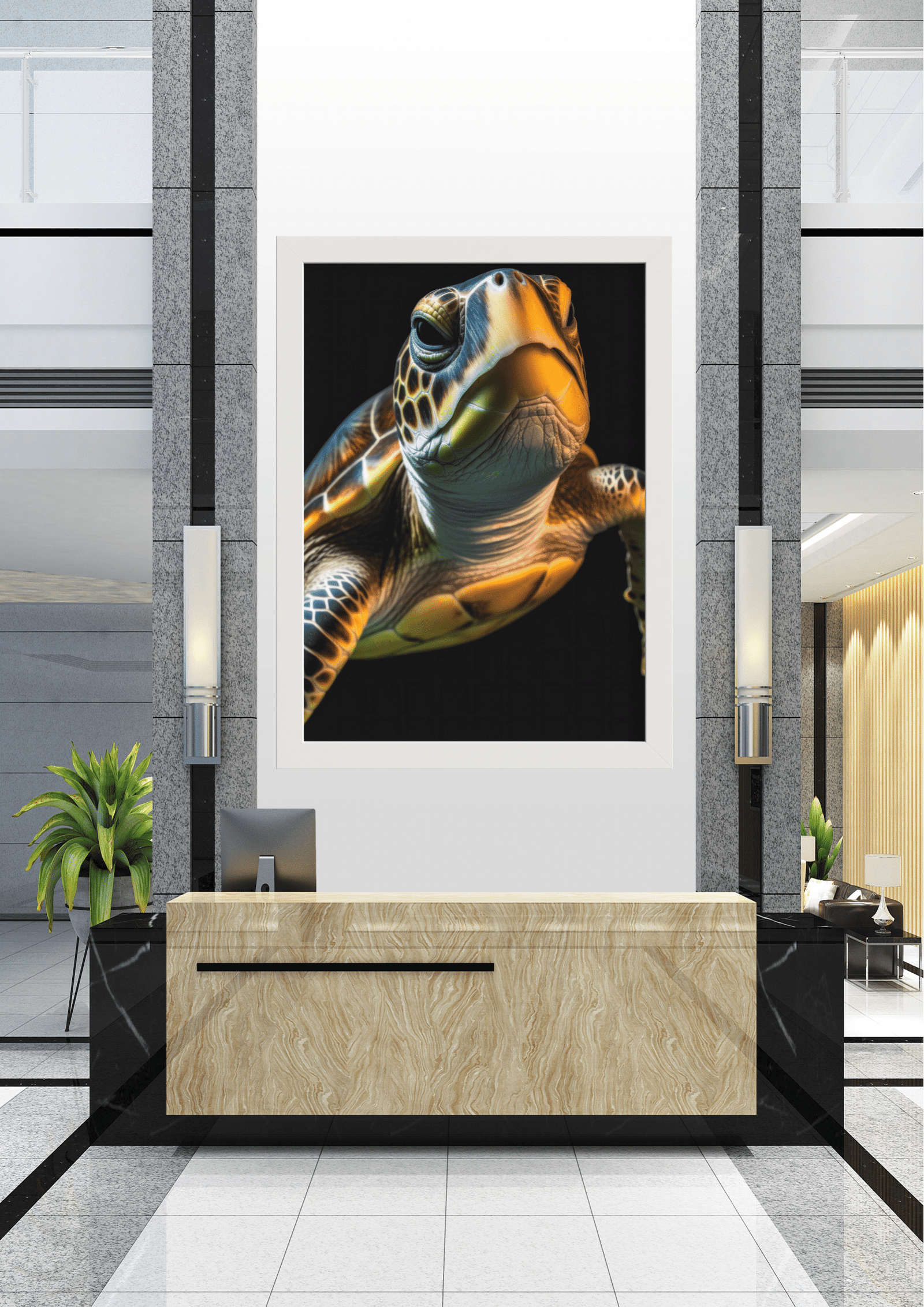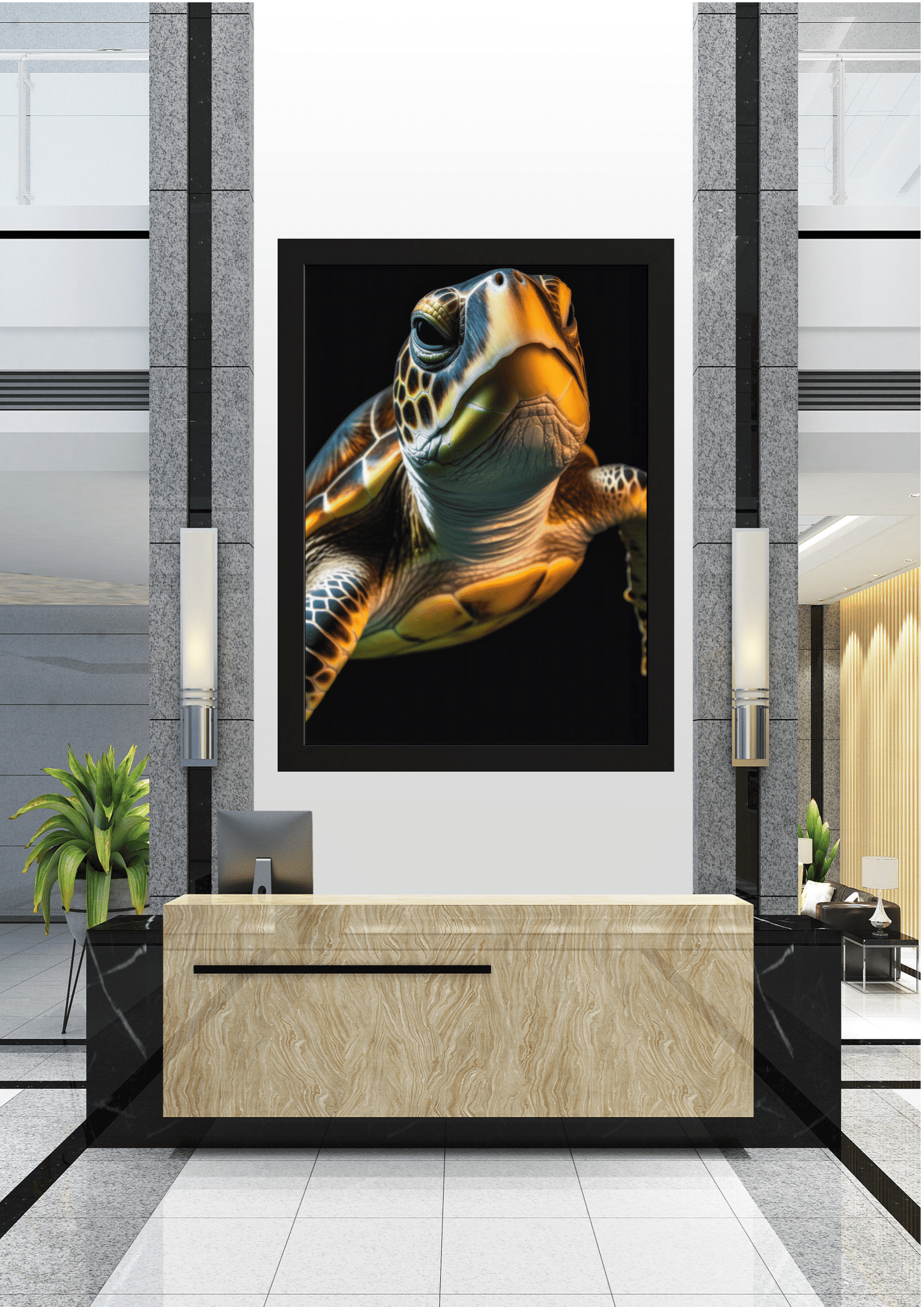 Este quadro impressionante retrata o close-up de uma tartaruga marinha, capturando a essência e a beleza deste antigo habitante dos oceanos. A imagem, emoldurada em preto, domina o espaço central de um ambiente moderno e minimalista, criando um contraste marcante entre a natureza e o design contemporâneo.