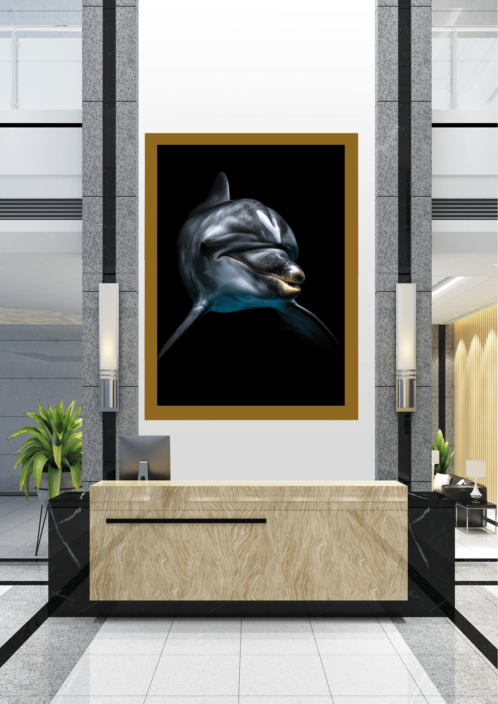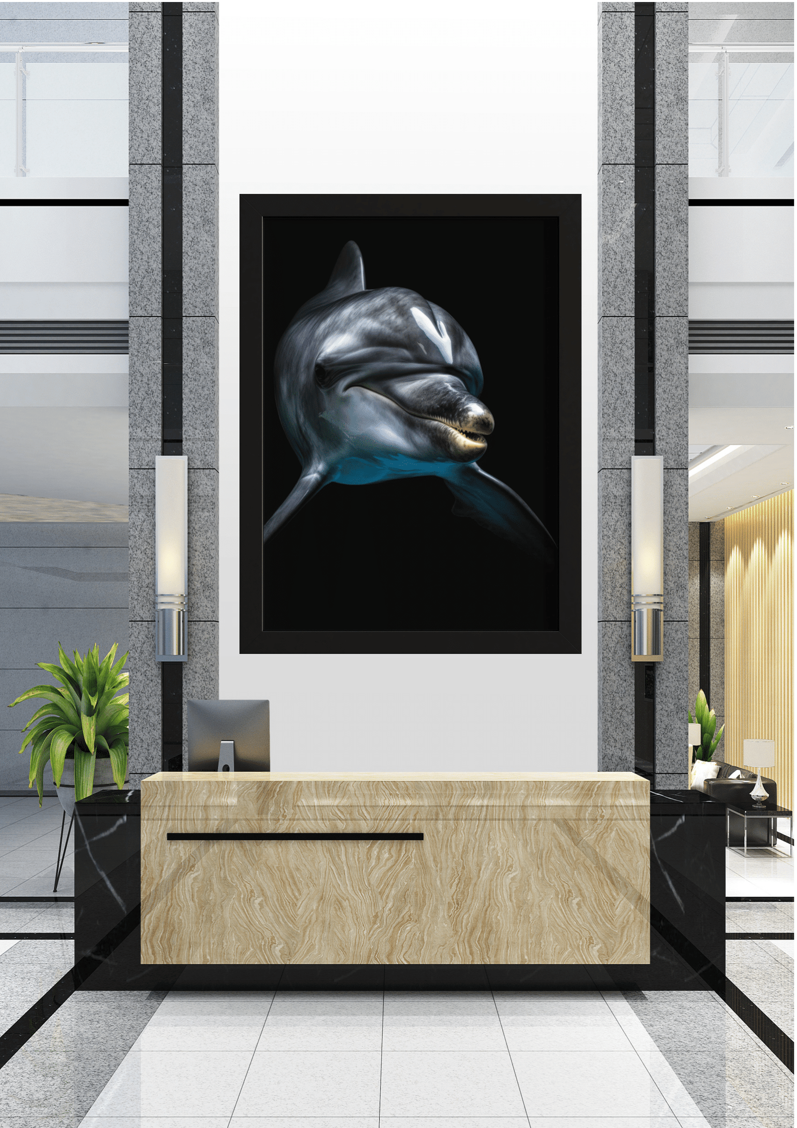 O ambiente ao redor do quadro é uma fusão harmoniosa de elementos modernos e naturais. Colunas de granito cinza flanqueiam a imagem, suas linhas retas contrastando com as curvas orgânicas do golfinho. Abaixo, um balcão de recepção em madeira clara adiciona calor ao espaço, enquanto plantas verdes em vasos trazem um toque de natureza ao interior.