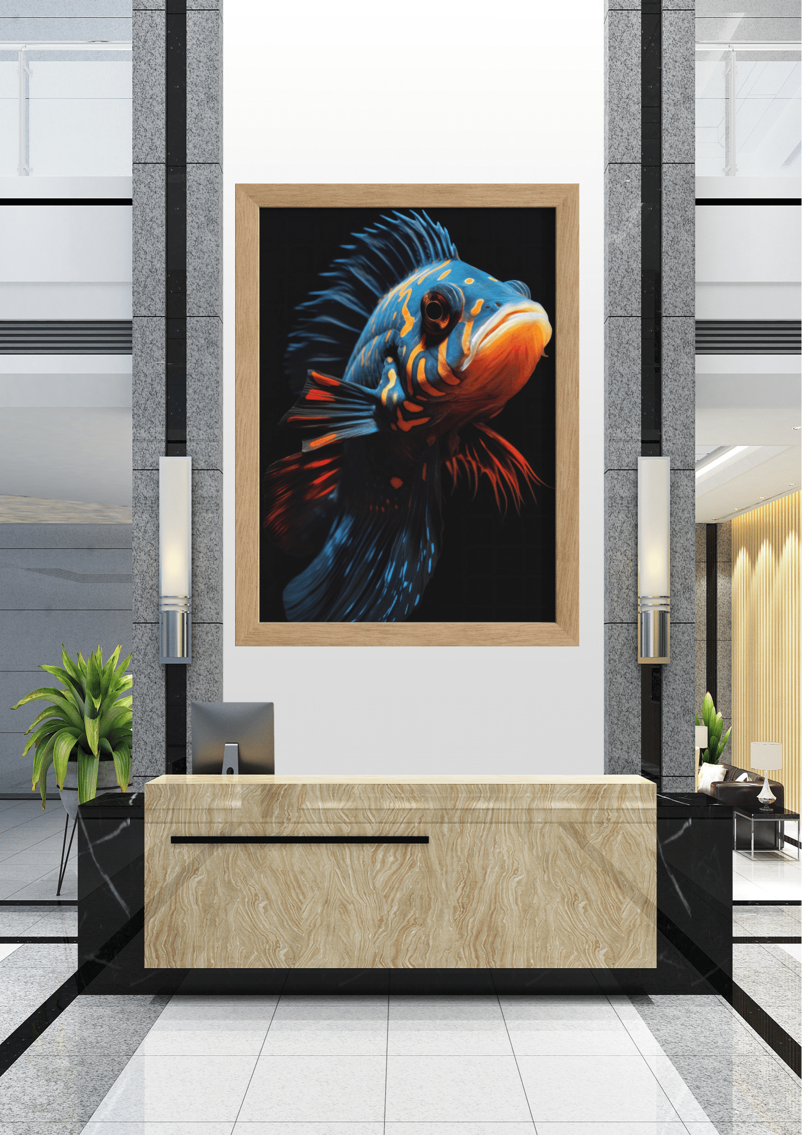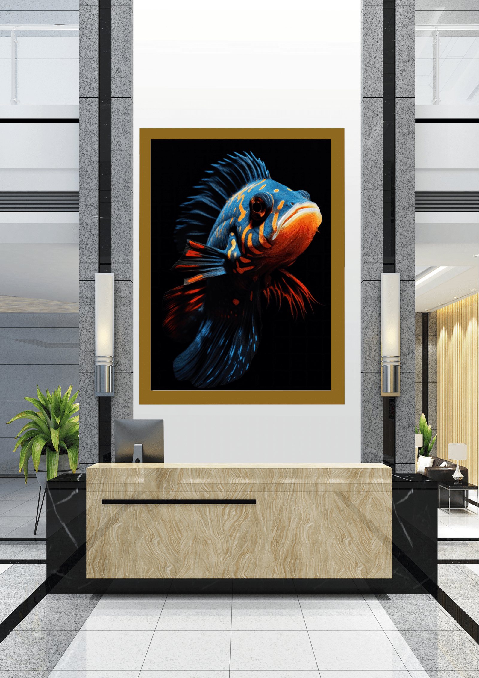 Este impressionante quadro retrata um peixe tropical em cores vibrantes, capturando a atenção do observador com sua beleza exótica e presença marcante. A obra está posicionada de forma proeminente em um ambiente moderno e minimalista, criando um contraste dramático entre a natureza viva e a arquitetura contemporânea.