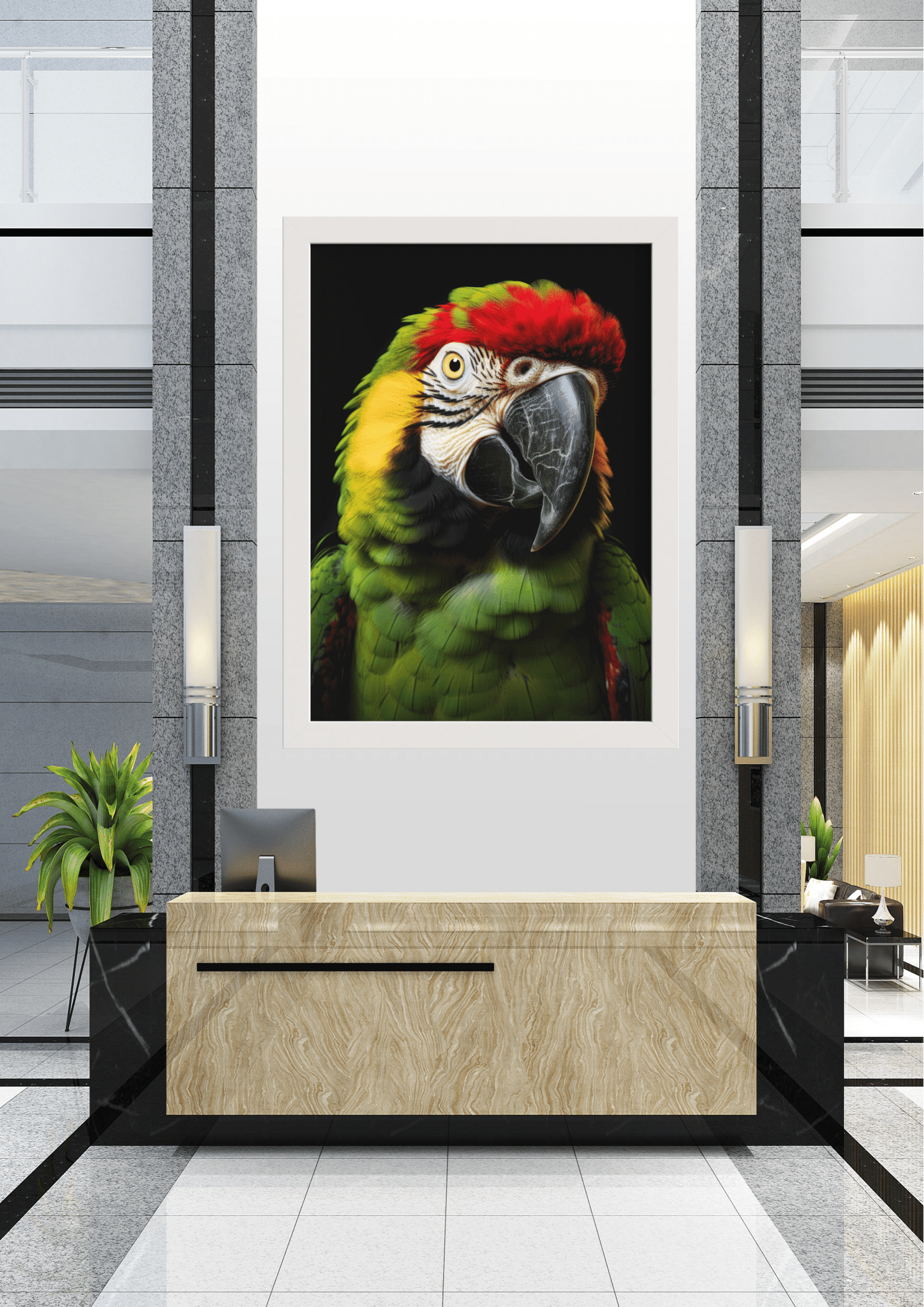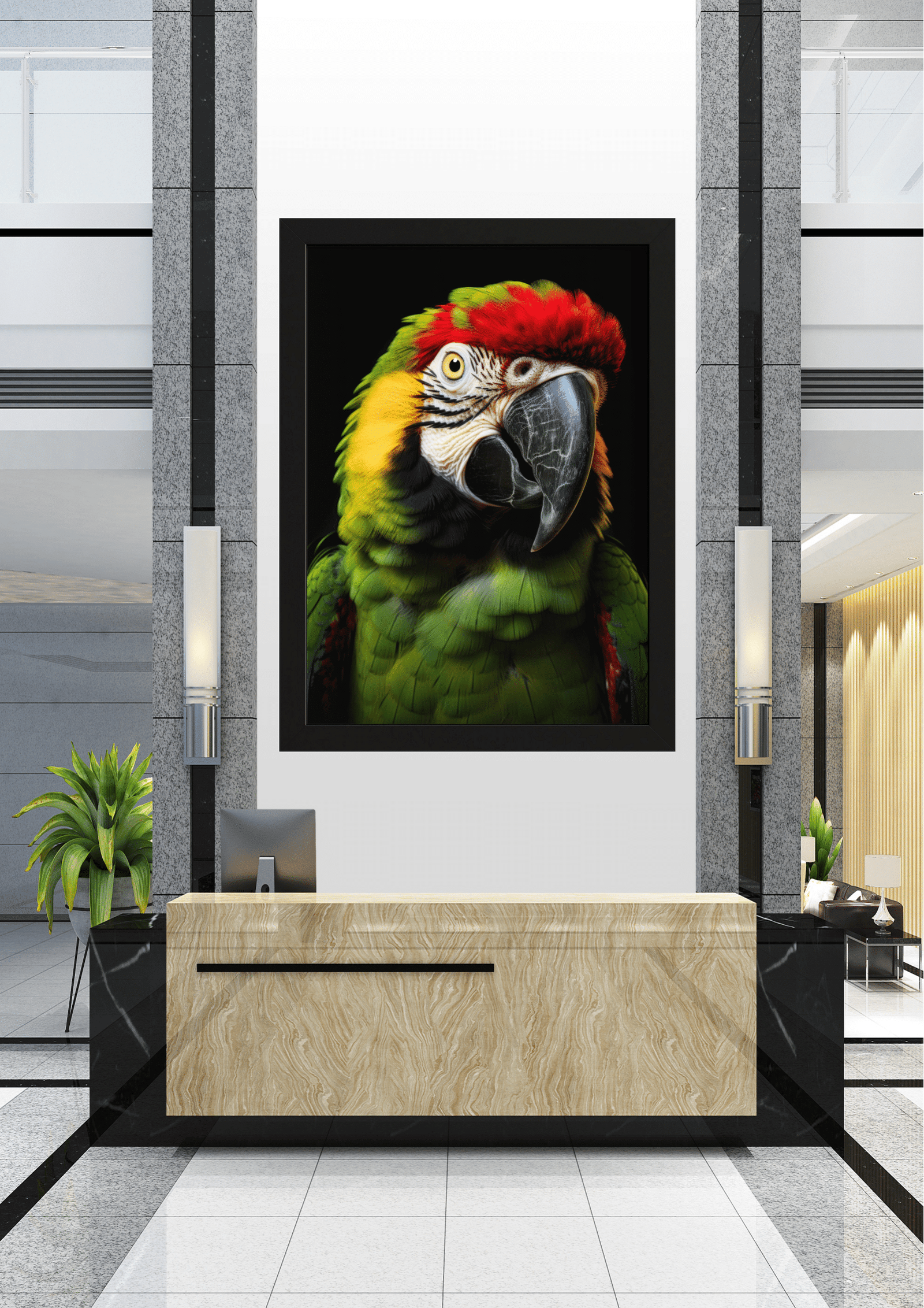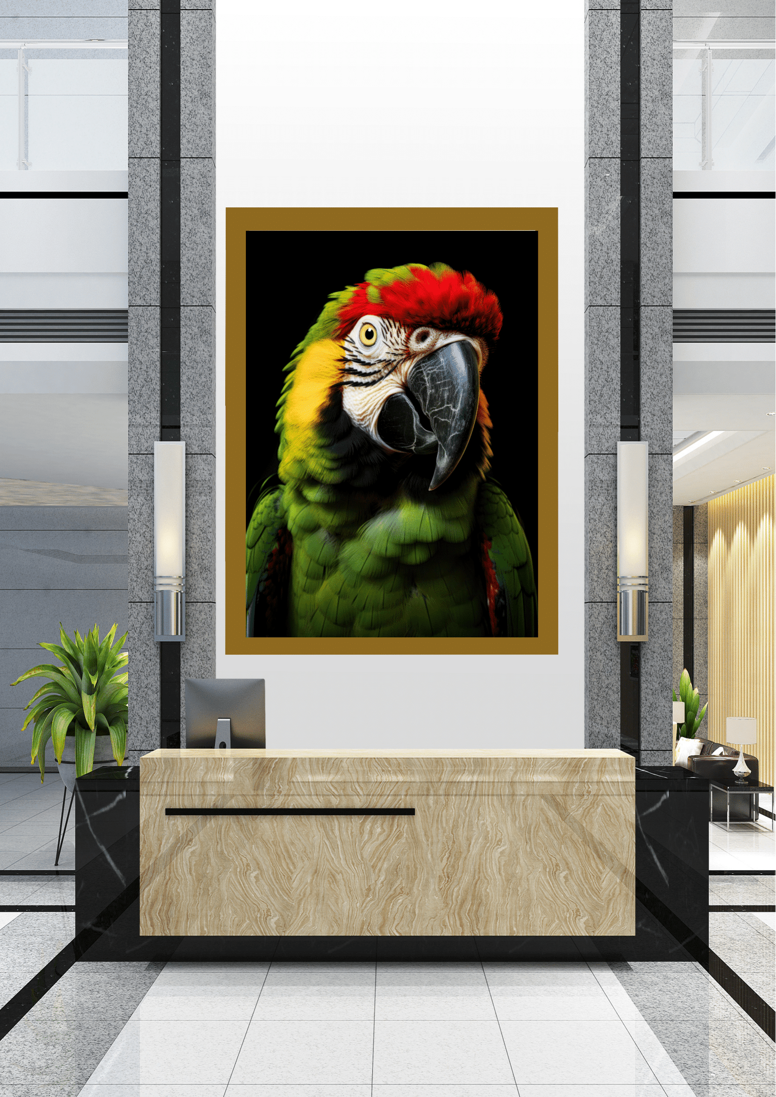 A imagem apresenta um retrato impressionante de uma arara em close-up, capturando a beleza exótica e vibrante desta ave tropical. O foco está no rosto da arara, destacando-se contra um fundo preto que realça suas cores vivas e detalhes intrincados.