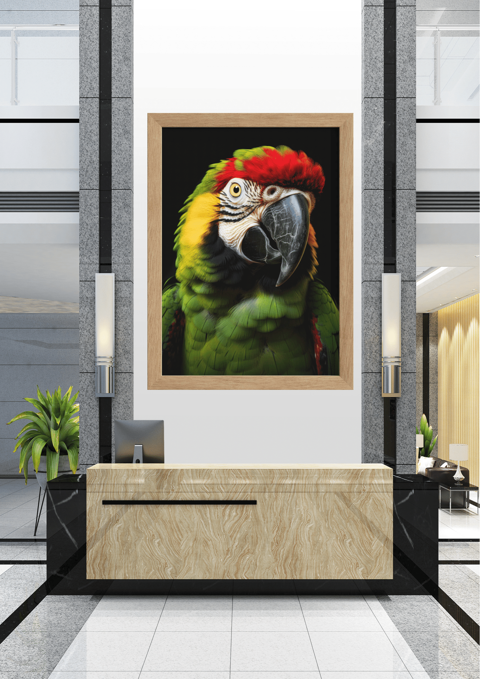 A plumagem da arara exibe um espectro deslumbrante de cores. Seu topo da cabeça é adornado com penas de um vermelho intenso e brilhante, que se mesclam suavemente com tons de amarelo dourado na área ao redor dos olhos e nas bochechas. O corpo da ave é coberto por penas de um verde rico e luxuriante, criando um contraste marcante com as cores quentes da cabeça.