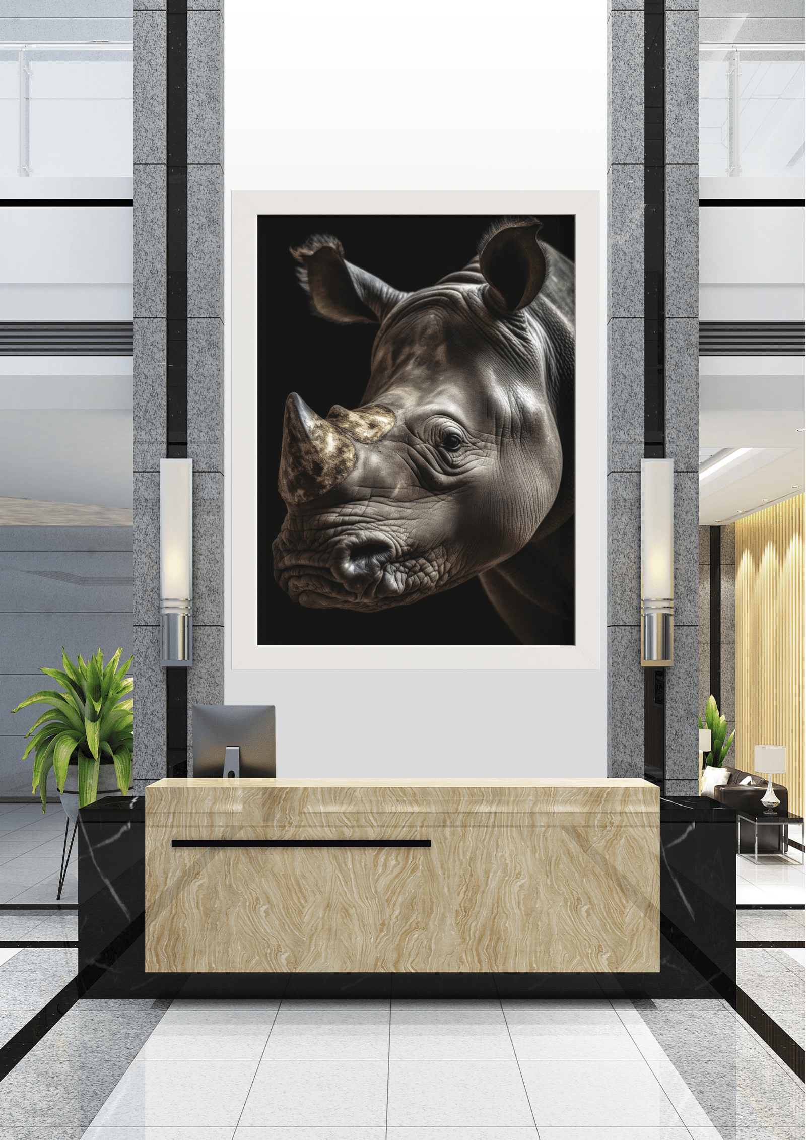 Nesta imagem impactante, vemos um majestoso rinoceronte capturado em um retrato que destaca sua imponência e beleza natural. A fotografia, emoldurada com elegância, é o ponto central de um sofisticado ambiente de recepção. O contraste entre o fundo escuro da imagem e a pele texturizada do rinoceronte cria uma sensação de profundidade e realismo. Os detalhes meticulosos do chifre e das rugas do animal são ressaltados pela iluminação suave, que confere uma aura quase escultórica ao retrato. A escolha do rinoceronte como tema simboliza força e resiliência, características que podem inspirar visitantes e colaboradores ao entrarem neste espaço. A decoração ao redor, com tons neutros e plantas verdes, complementa a imagem, criando um ambiente acolhedor e refinado. Este retrato não é apenas uma peça decorativa, mas uma celebração da majestade da vida selvagem, convidando à reflexão sobre a preservação e respeito pela natureza.