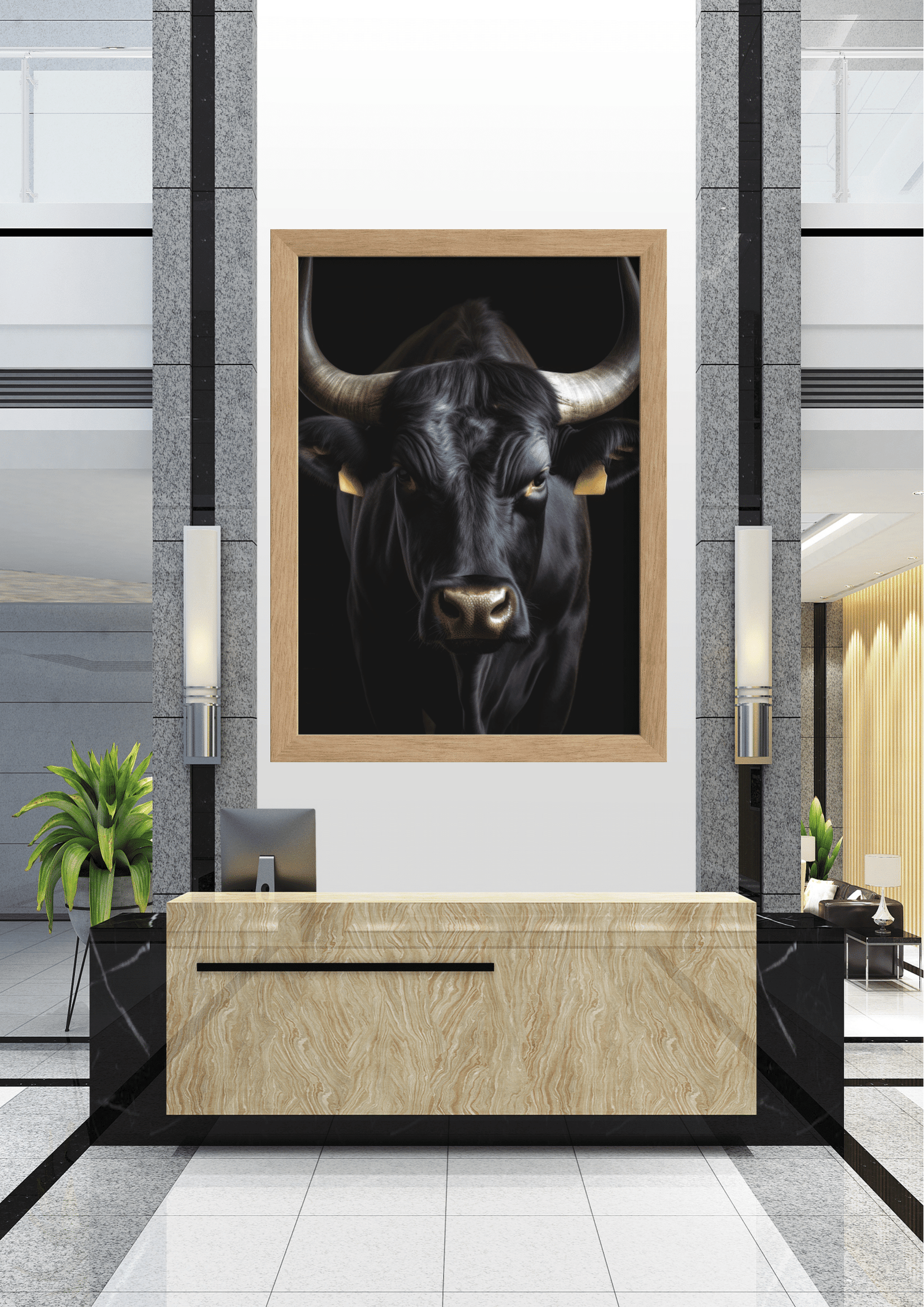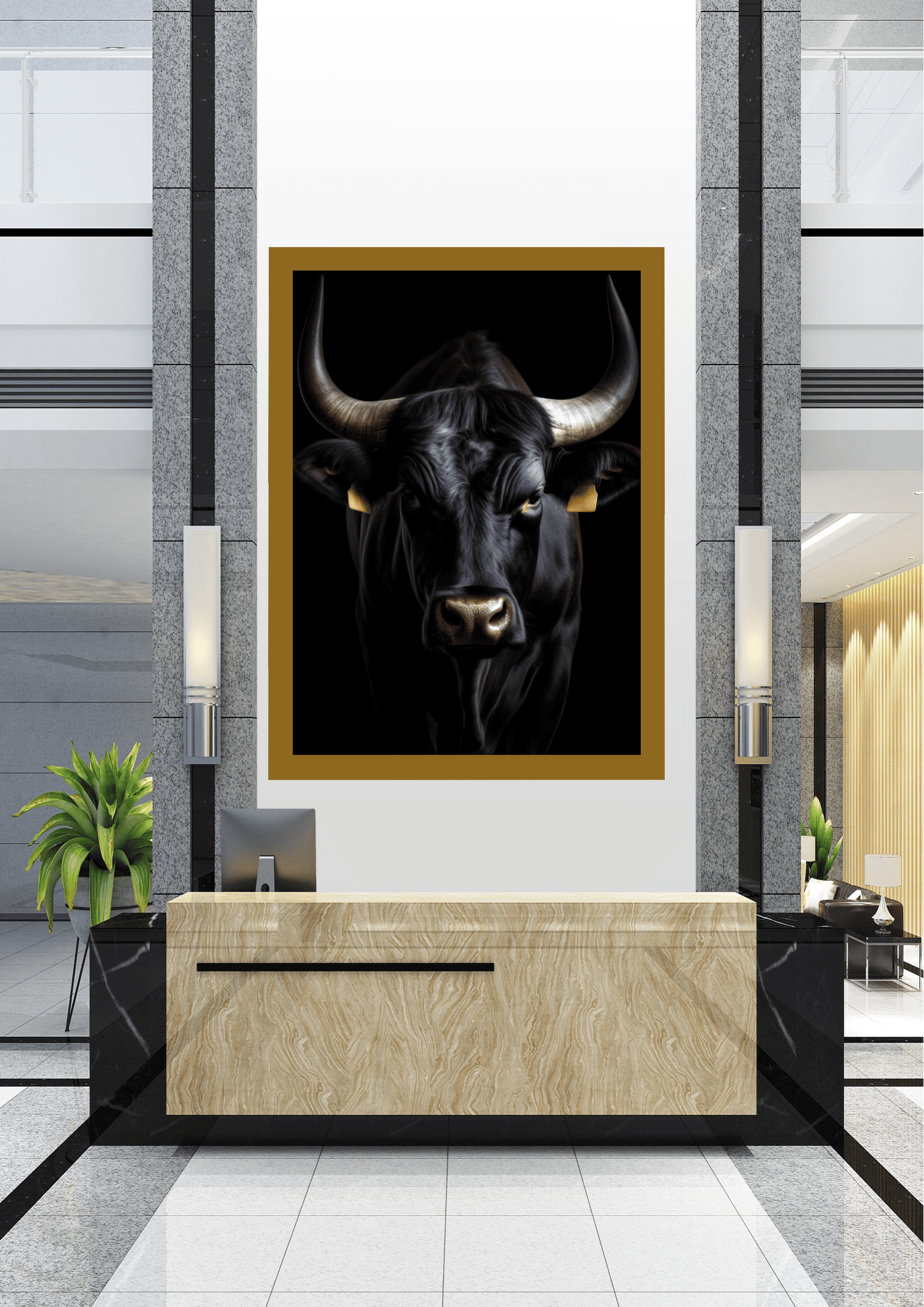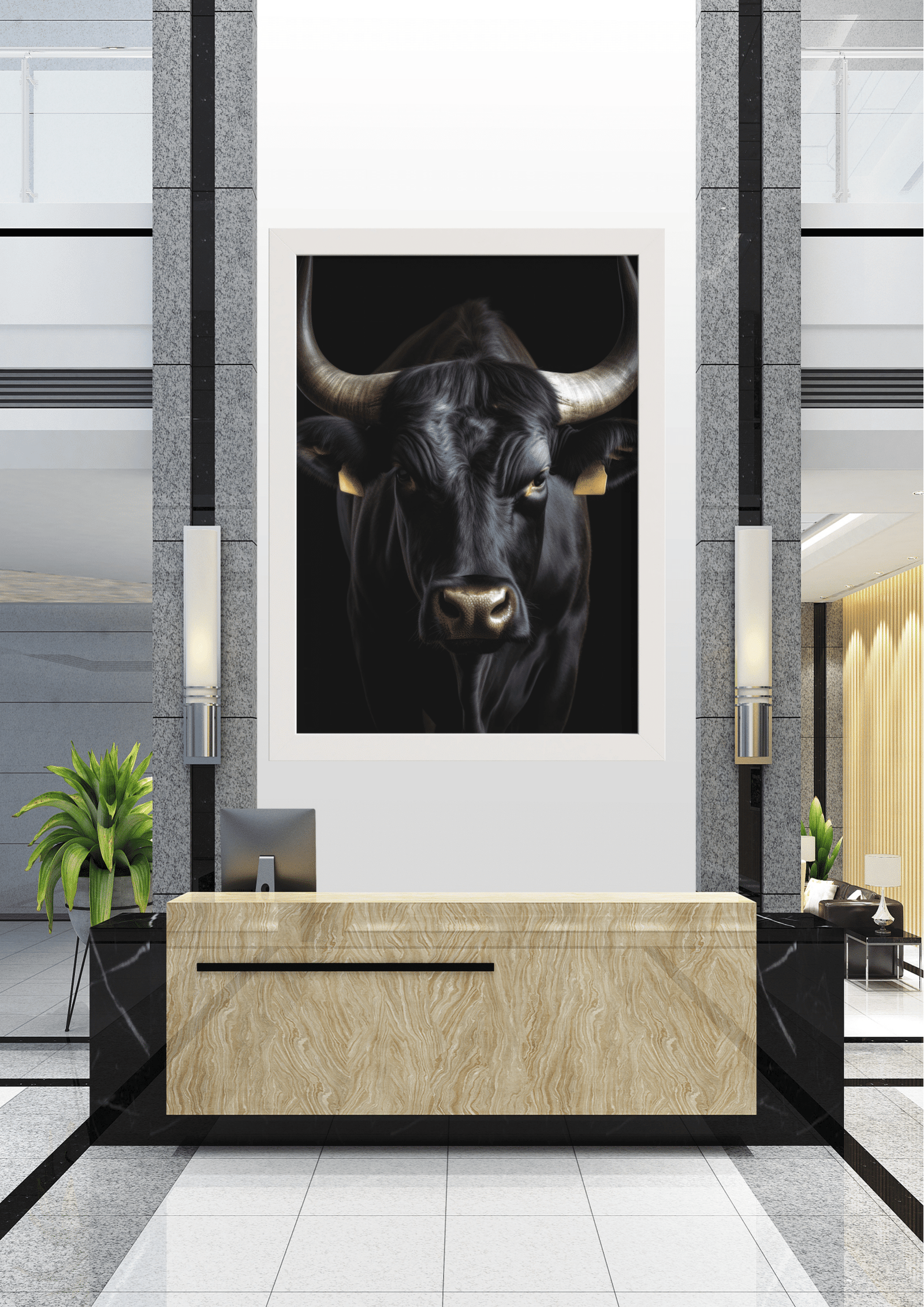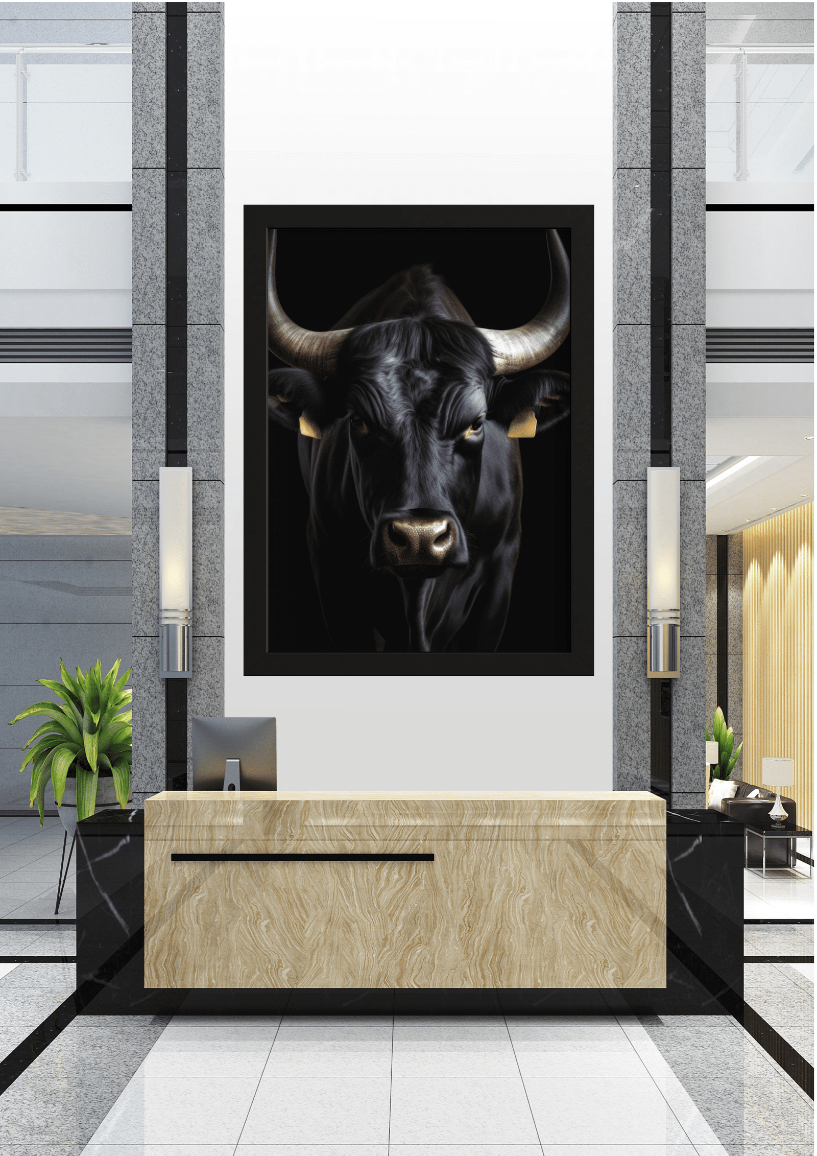 Este quadro impressionante apresenta uma imagem poderosa e cativante de um touro negro em um ambiente moderno e sofisticado. A obra de arte domina o espaço, criando um contraste marcante entre o animal majestoso e o interior contemporâneo que o cerca.