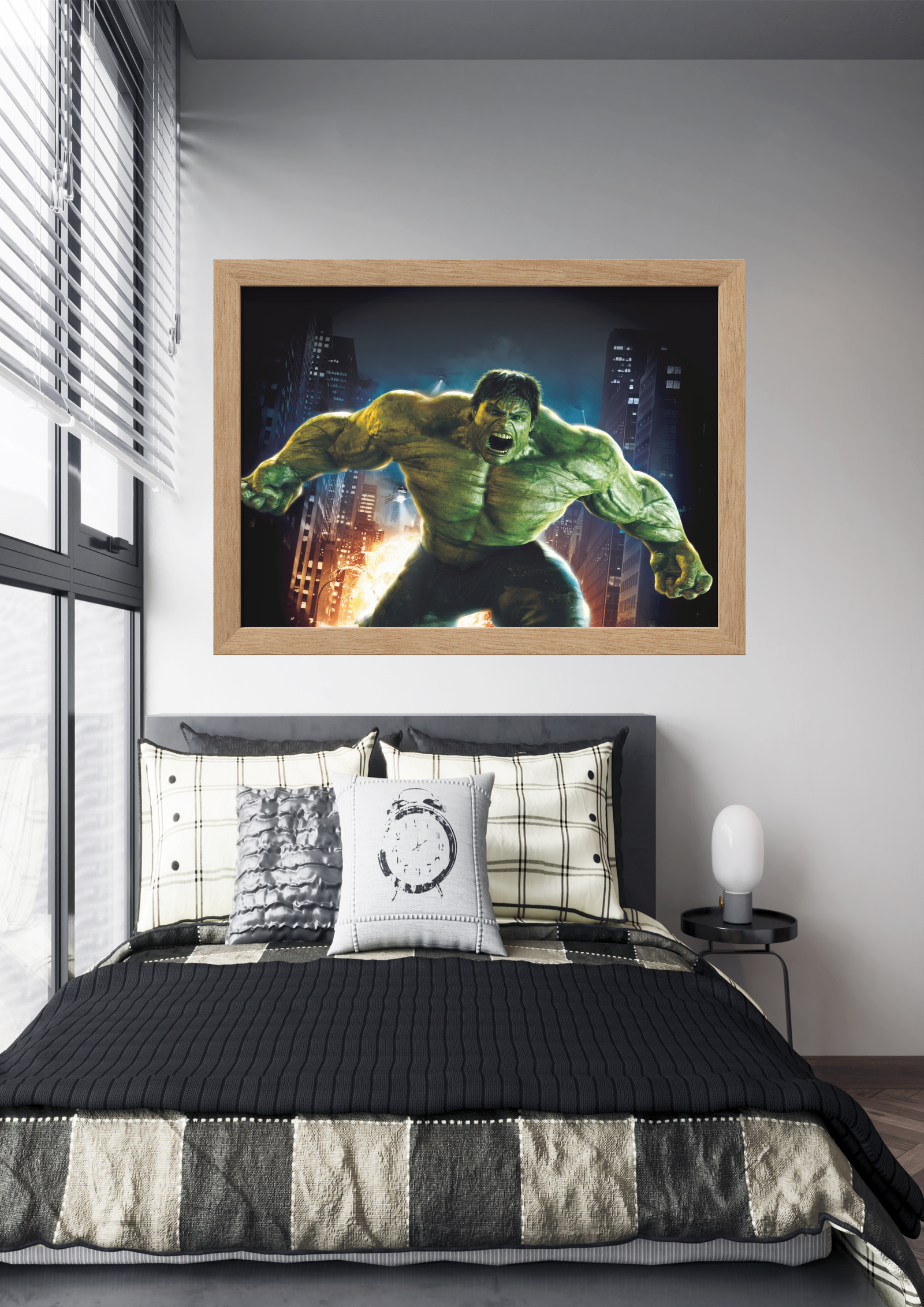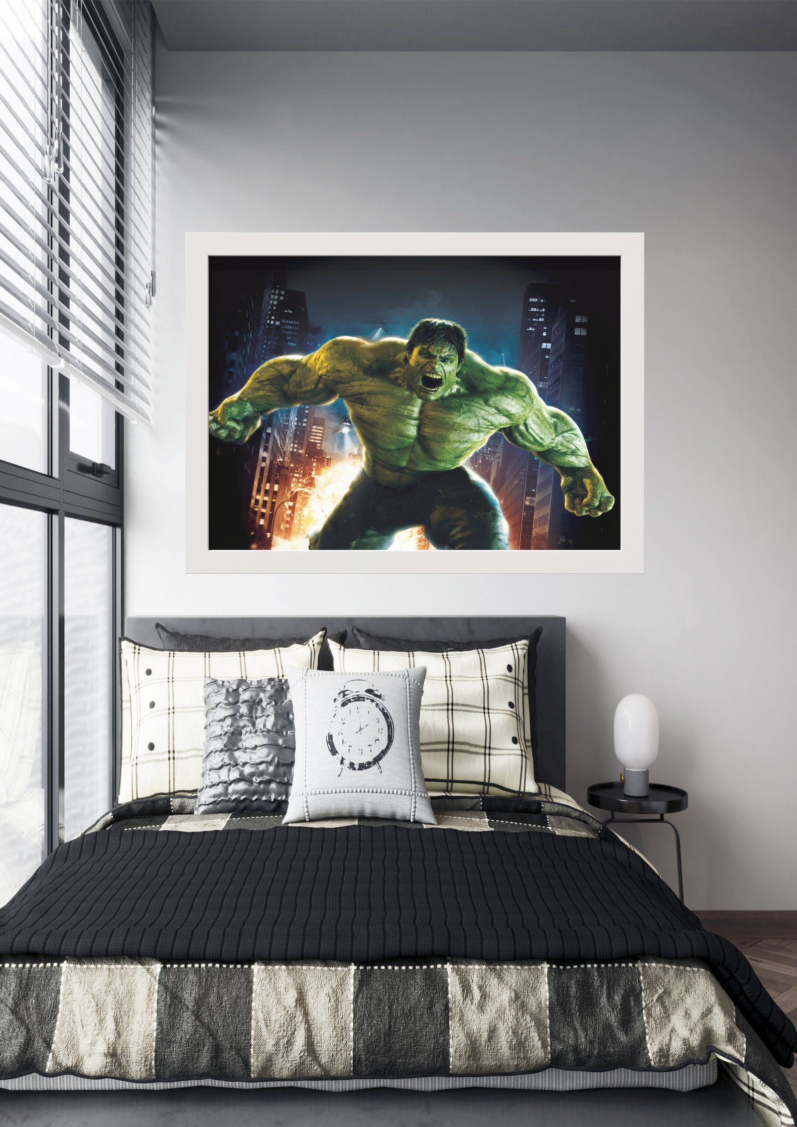 Nesta imagem, o icônico herói verde domina o ambiente com sua presença imponente, emoldurado em um quadro que adorna a parede de um quarto moderno e elegante. A decoração do quarto, com tons neutros e um design contemporâneo, contrasta harmoniosamente com a energia vibrante e poderosa do personagem. As janelas amplas permitem a entrada de luz natural, destacando ainda mais o quadro central. A cama, cuidadosamente arrumada com almofadas e cobertores texturizados, convida ao descanso, criando um espaço que equilibra força e serenidade. Este ambiente não é apenas um local de repouso, mas também uma celebração da cultura pop, onde o mundo dos quadrinhos encontra o design de interiores, proporcionando inspiração e conforto ao mesmo tempo.
