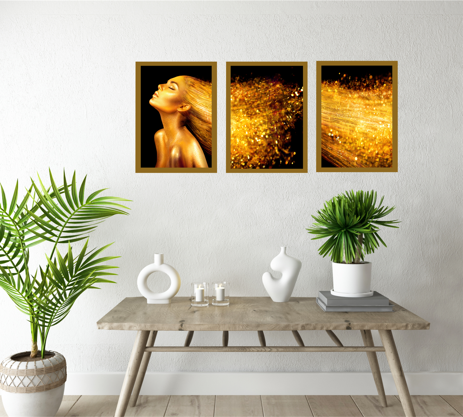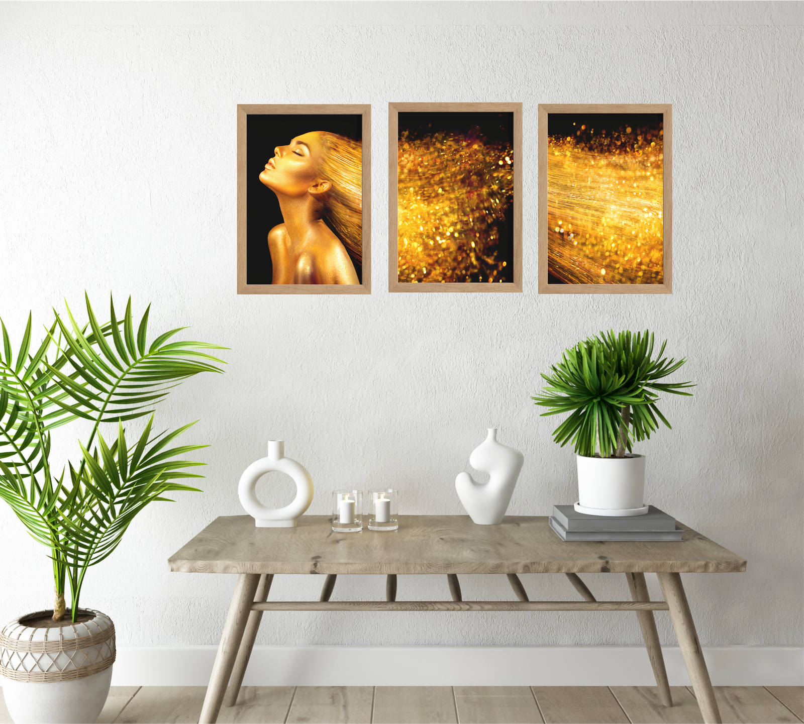 A imagem exibe uma composição artística de três quadros alinhados em uma parede branca, criando um ponto focal sofisticado e contemporâneo em um ambiente minimalista. No primeiro quadro, uma figura feminina com a pele e cabelos em tons dourados expressa serenidade e confiança, simbolizando a beleza e a força interior. Os quadros seguintes capturam a continuidade do movimento dos cabelos, transformando-se em uma explosão de partículas douradas que evocam a sensação de energia e dinamismo. Essa transição visual cria uma narrativa de transformação e liberdade, harmonizando perfeitamente com o design clean do espaço. A mesa de madeira clara, adornada com elementos decorativos brancos e plantas verdes, complementa a paleta de cores, proporcionando equilíbrio e frescor ao ambiente. A instalação, com seu jogo de luz e textura, convida o observador a uma experiência sensorial e contemplativa, onde a arte e o espaço se fundem em uma expressão única de elegância e modernidade.