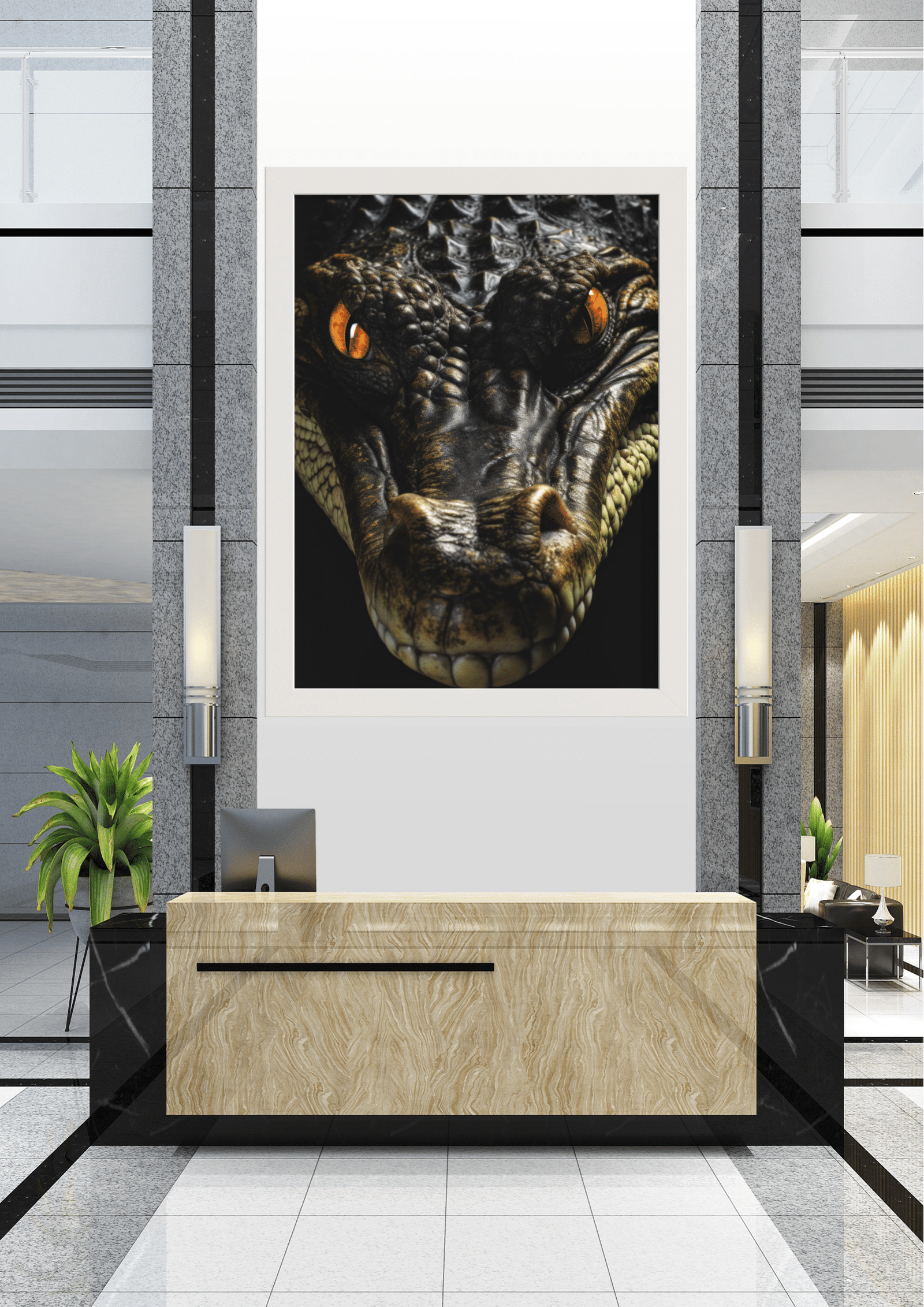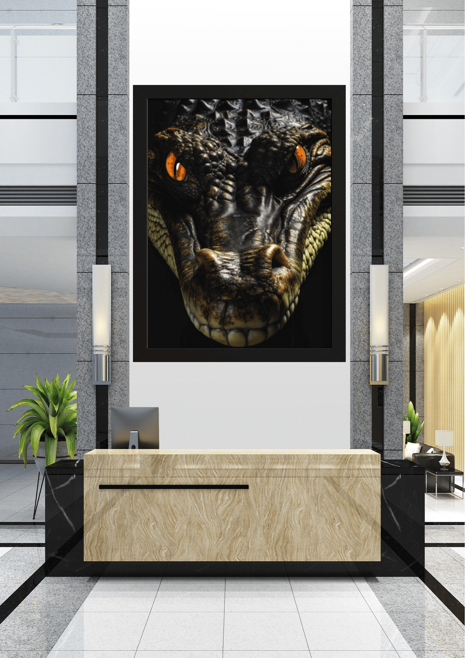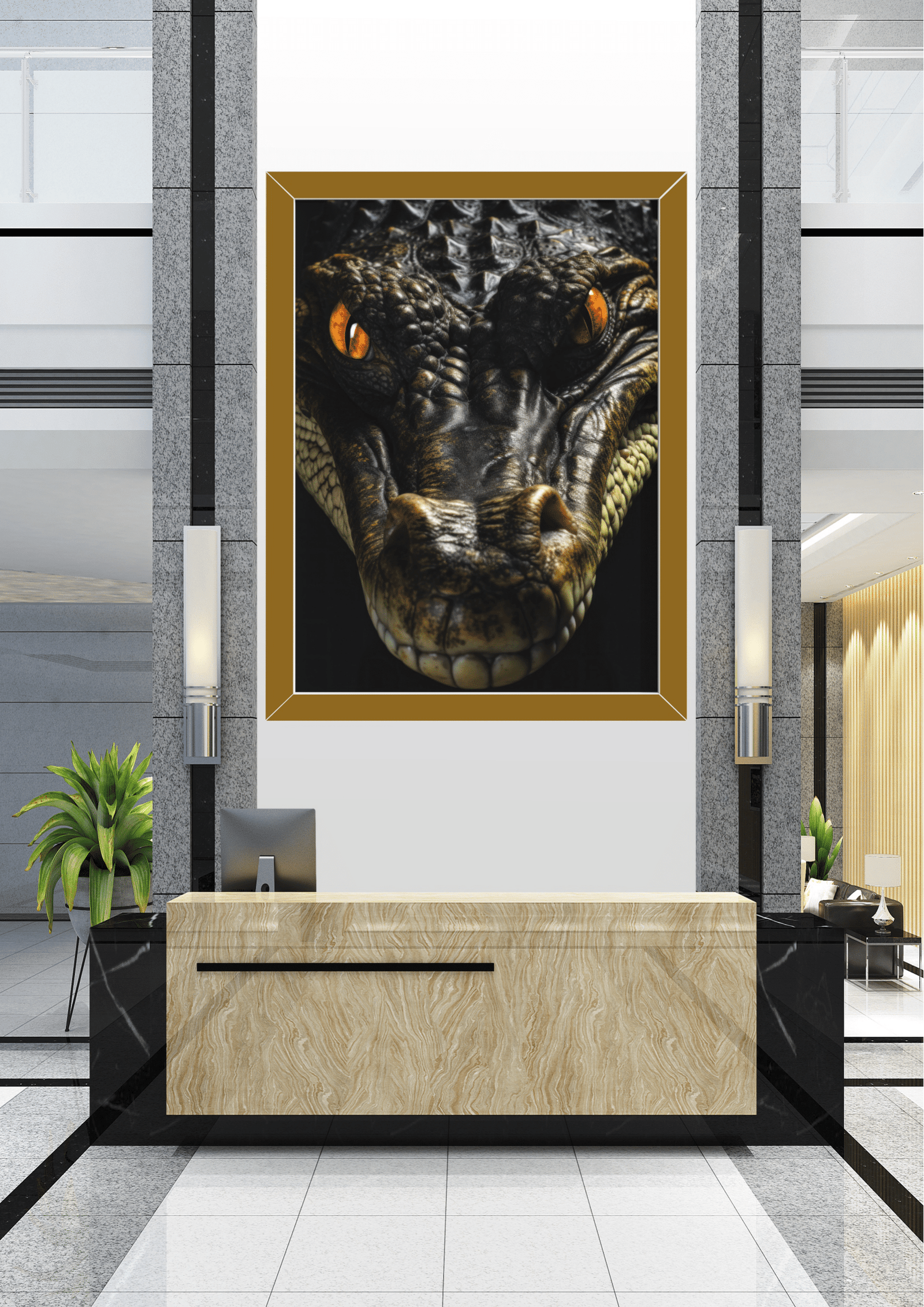 No coração de um suntuoso saguão, uma impressionante obra de arte captura a atenção de todos que passam. A imagem de um crocodilo, com seu olhar penetrante e escamas detalhadas, domina o ambiente com uma aura de poder e mistério. A escolha do fundo preto realça ainda mais os traços do predador, destacando cada detalhe de sua textura robusta e olhar vigilante.