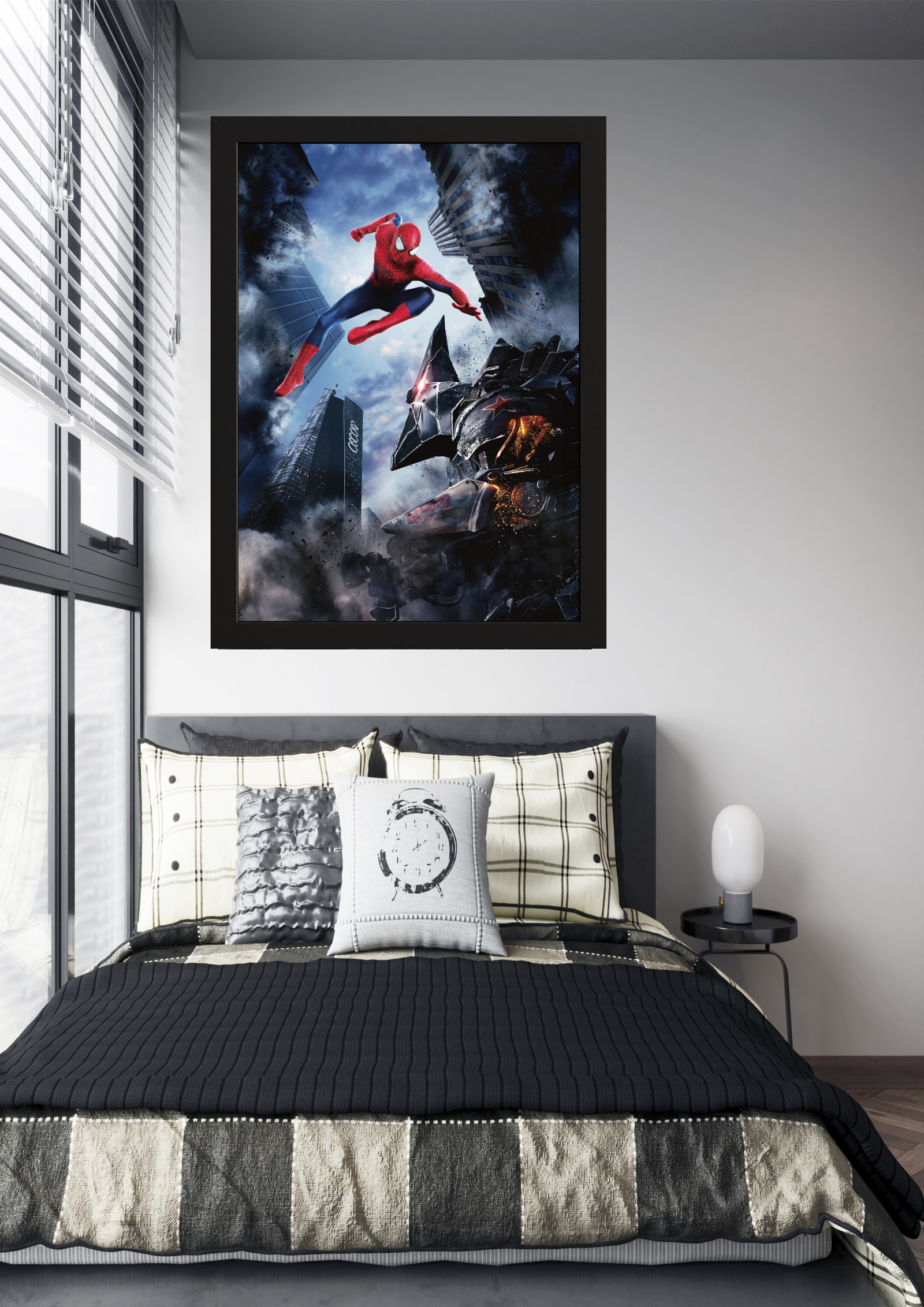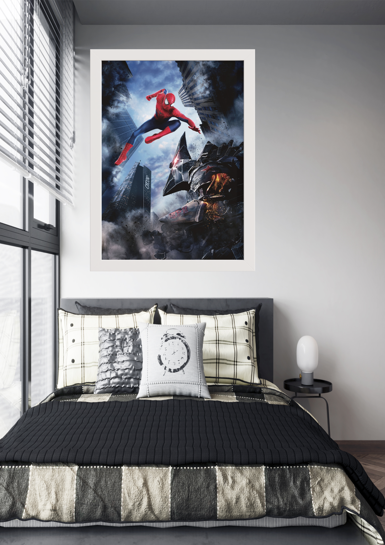 Nesta imagem deslumbrante, um quarto moderno exibe uma poderosa obra de arte do Homem-Aranha em plena ação. A pintura captura o herói em um momento de batalha épica contra uma força ameaçadora, situada entre arranha-céus que se erguem imponentes. O contraste entre o ambiente sereno do quarto, com sua decoração minimalista e tons neutros, e a intensidade da cena retratada na arte cria uma atmosfera única. As linhas limpas e a luz natural do espaço destacam ainda mais a dramaticidade e o dinamismo da imagem central. Este quadro não é apenas uma homenagem a um ícone dos quadrinhos, mas também uma peça que transforma o ambiente, trazendo energia e inspiração para o dia a dia. Ideal para fãs do universo dos super-heróis, esta decoração mistura aventura e estilo de forma magistral.