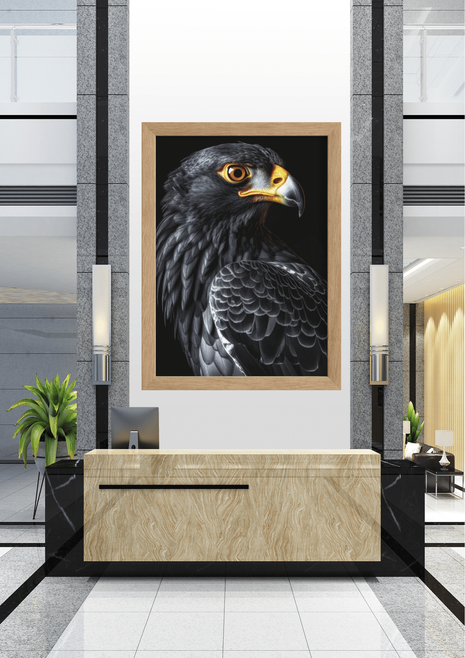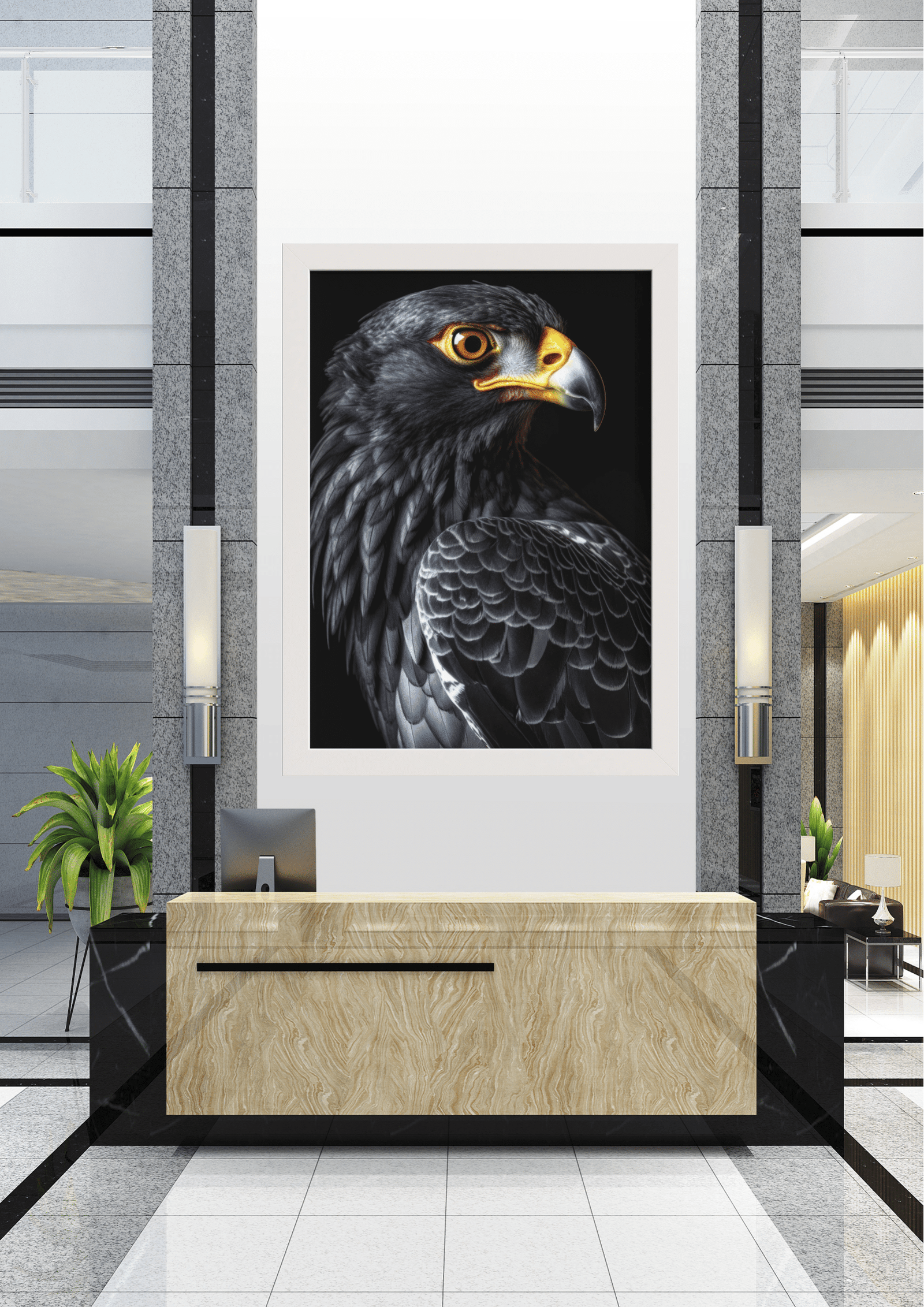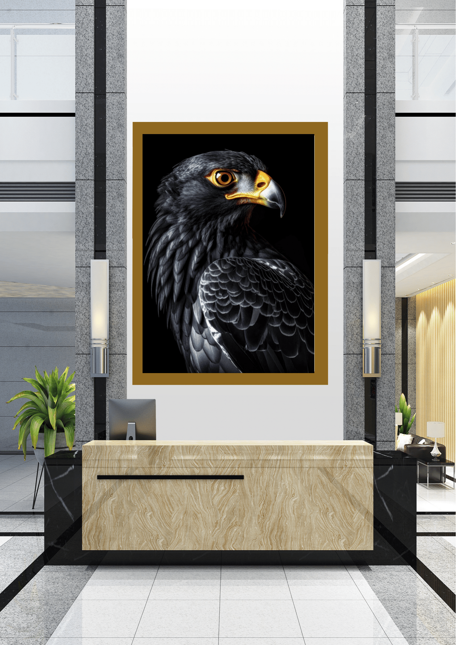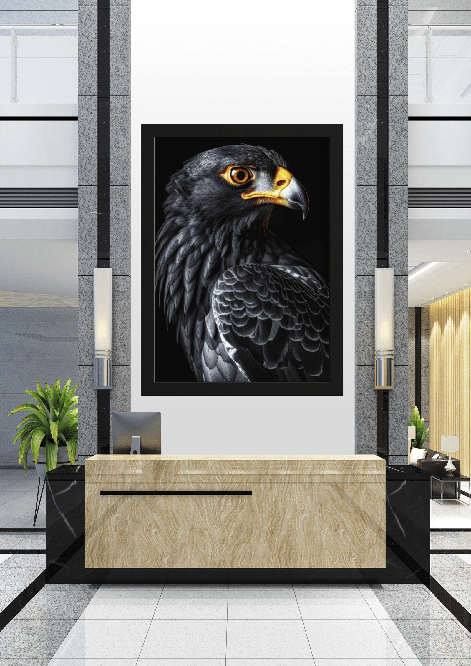 Esta peça de arte não apenas captura a beleza natural de uma das aves mais icônicas do mundo, mas também serve como um ponto focal poderoso no espaço arquitetônico, simbolizando força, liberdade e a grandeza da natureza.