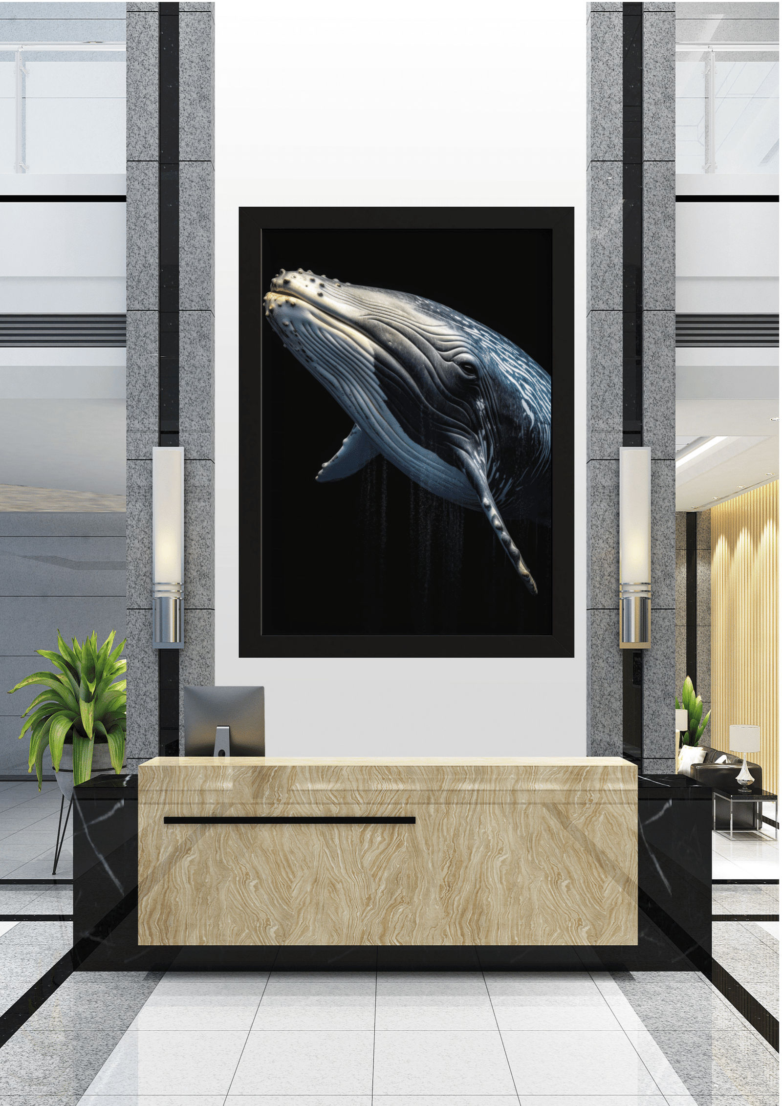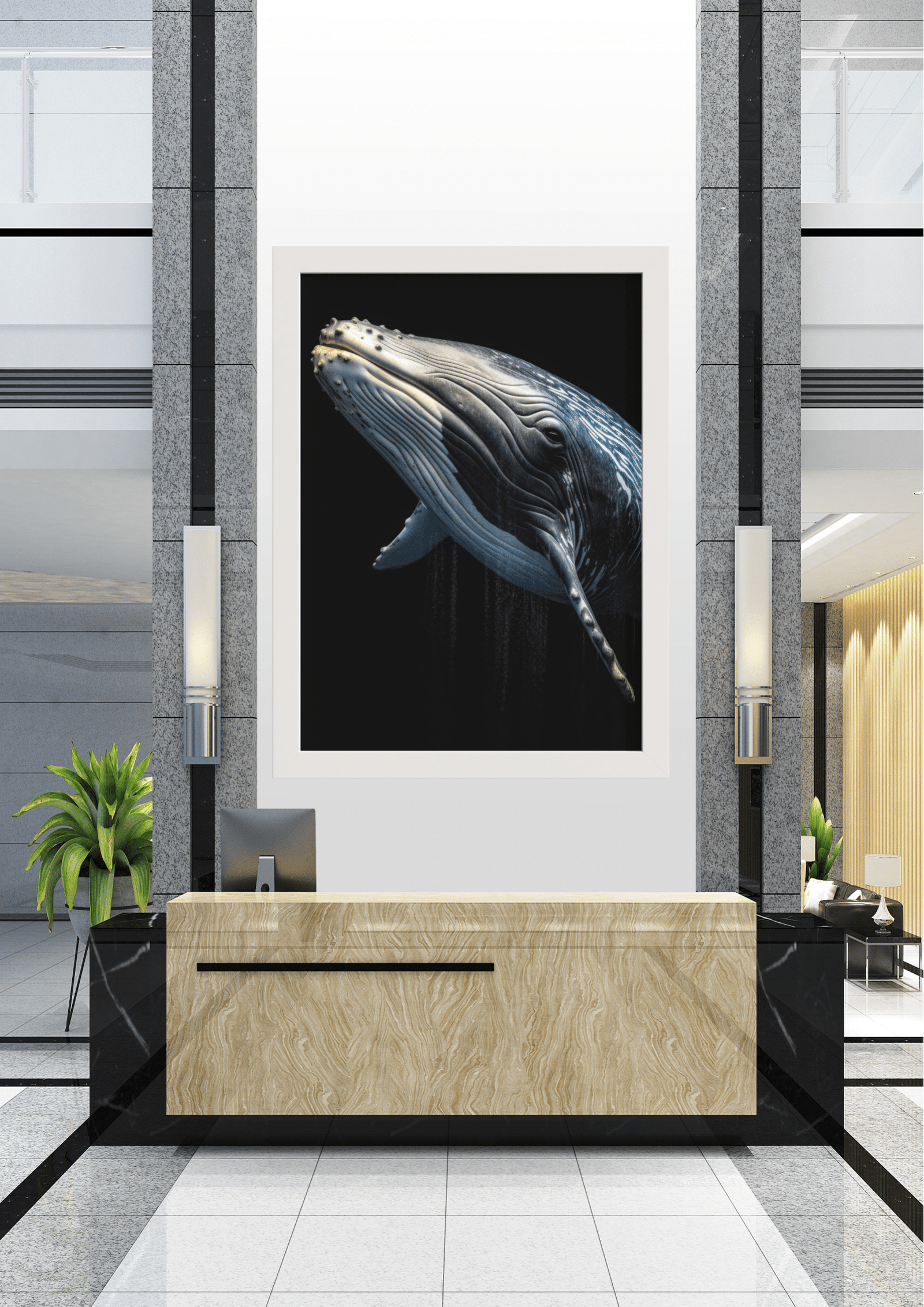 Emoldurado em preto, o quadro se integra perfeitamente ao ambiente moderno e minimalista do espaço, criando um ponto focal dramático na decoração. Sua presença imponente na parede branca entre as colunas de granito cinza adiciona um elemento de natureza selvagem e mistério oceânico ao interior contemporâneo.