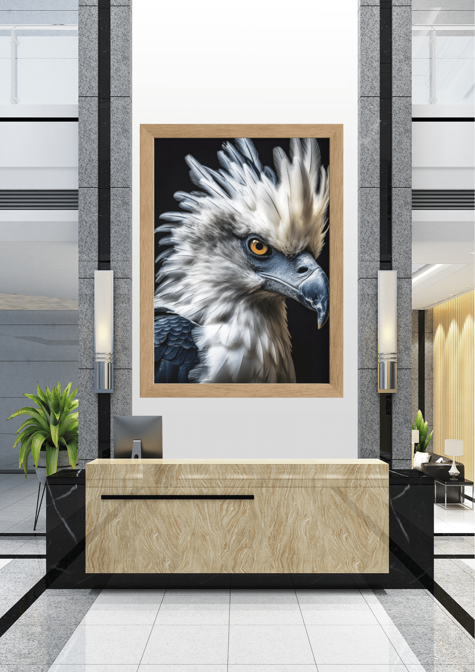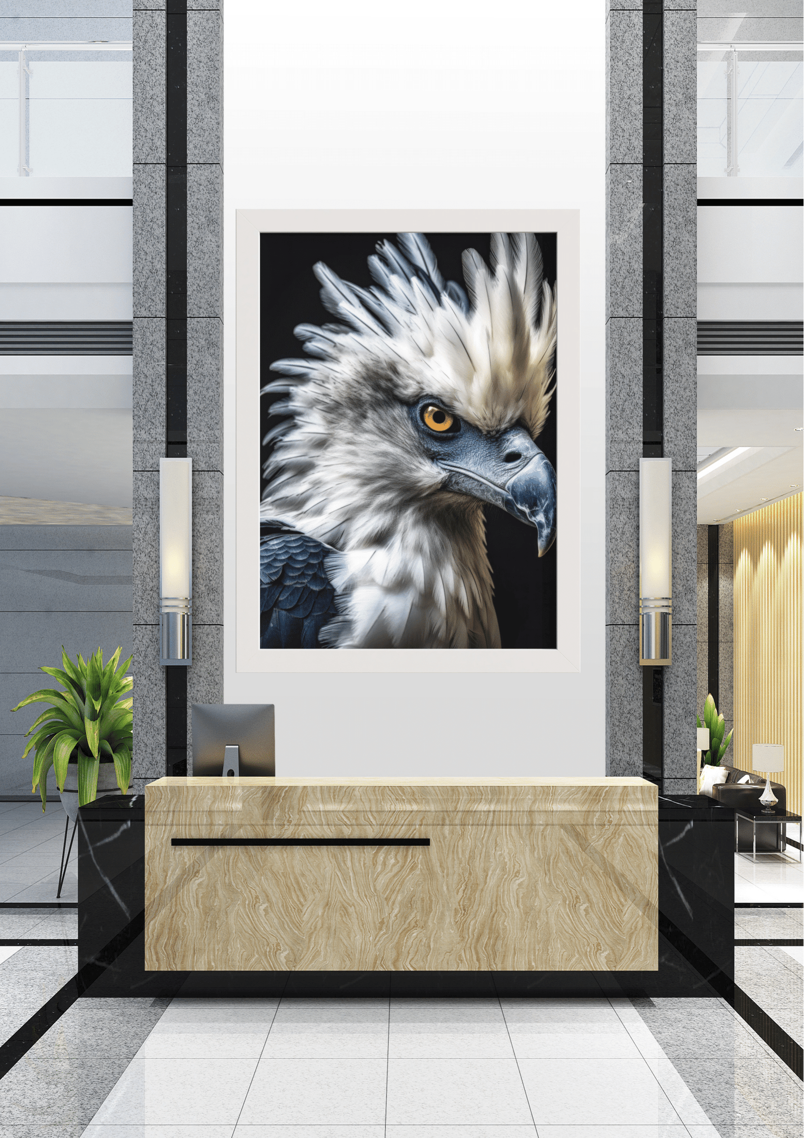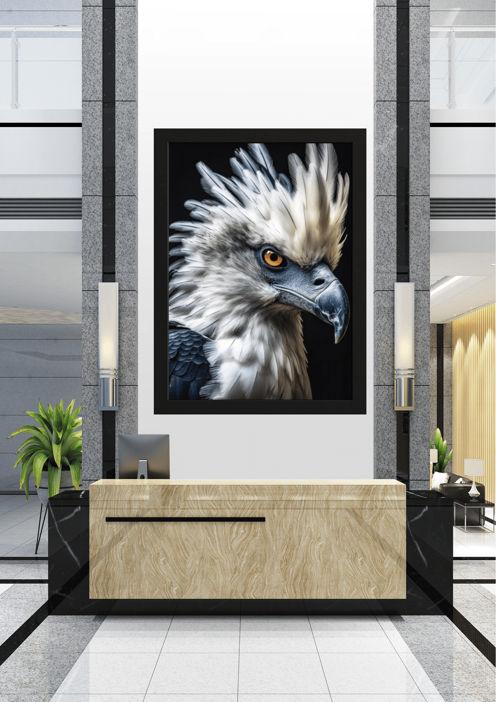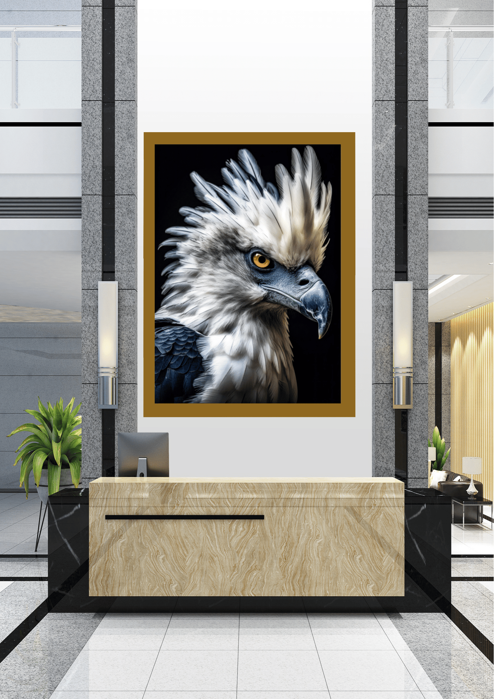 O ambiente ao redor, com sua decoração moderna e minimalista, complementa perfeitamente a peça central, permitindo que a águia se destaque como o coração do design. Este espaço, com sua fusão de arte e arquitetura, oferece uma experiência visual que é ao mesmo tempo estimulante e serena, convidando cada visitante a contemplar a beleza e a grandeza da natureza.